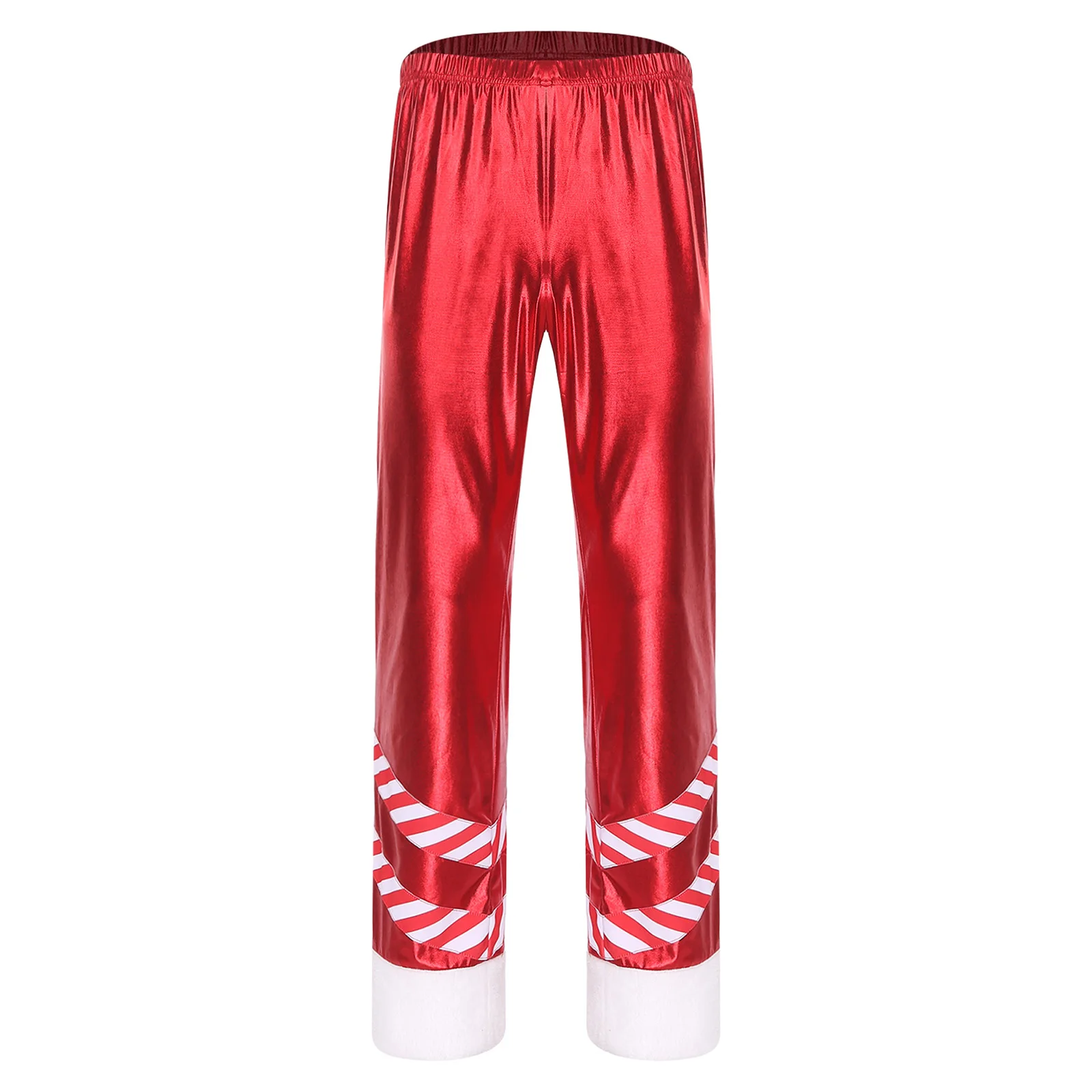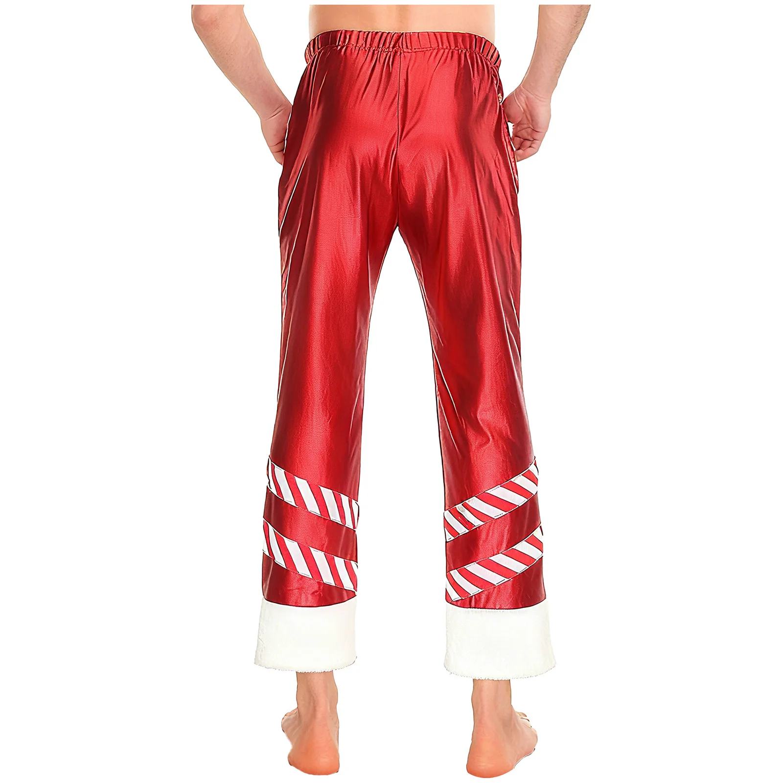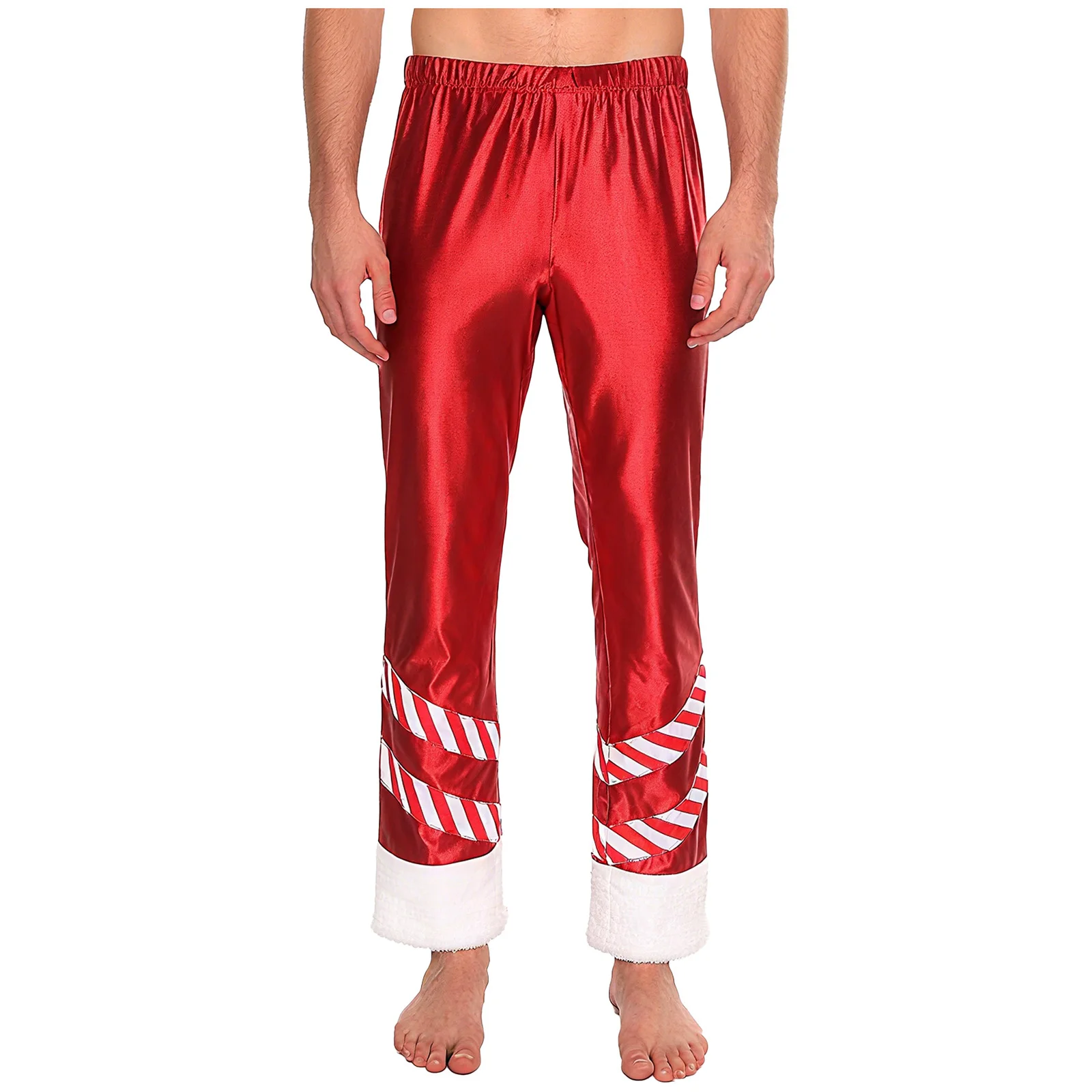 Mens Christmas Santa Claus Cosplay Party Costume Metallic Shiny Wide Red Leg Pants Striped Plush Leg Openings Loose Long Pants