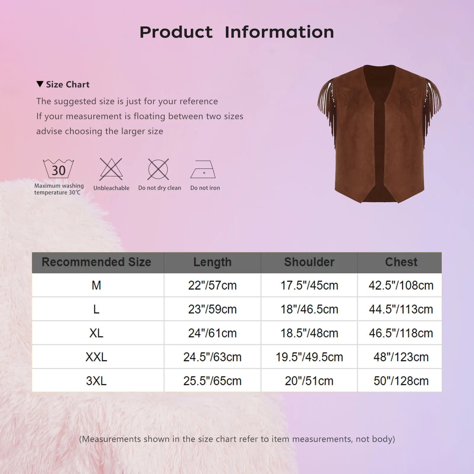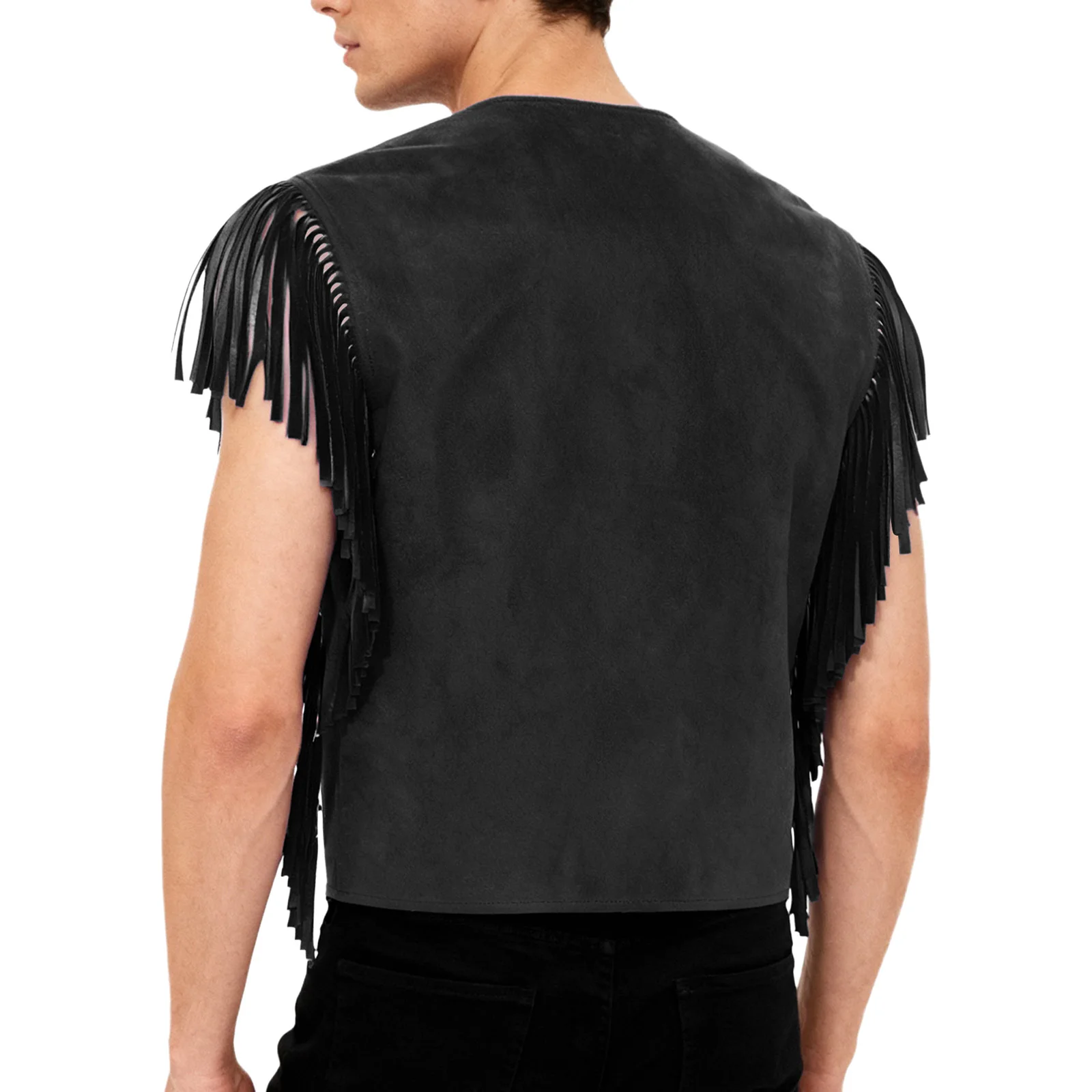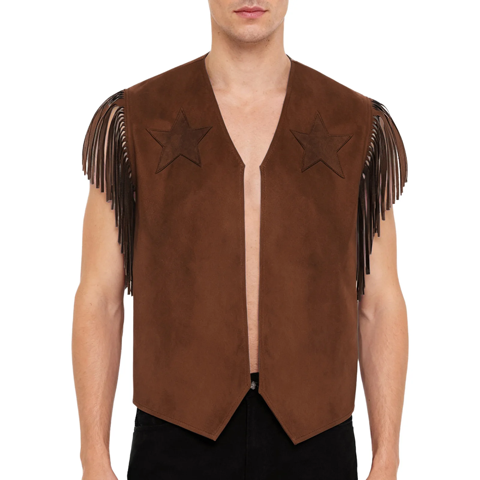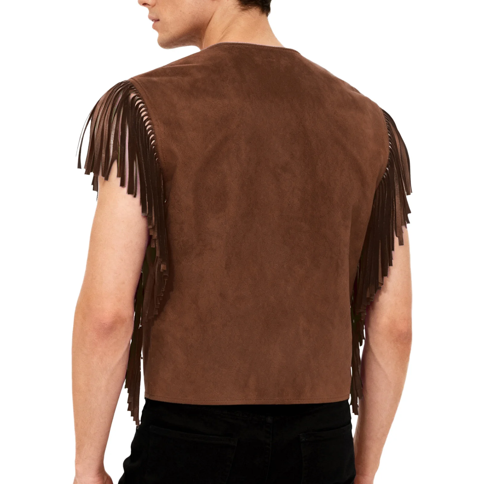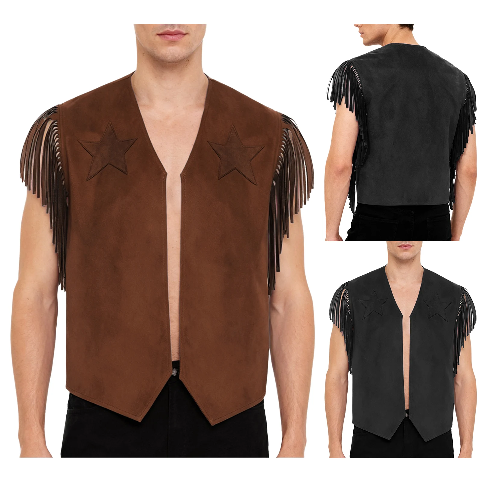 Mens Western Cowboy Carnival Cosplay Theme Party Costume Faux Suede Vest Tops Sleeveless Open Front Asymmetrical Hem Tassel Tops