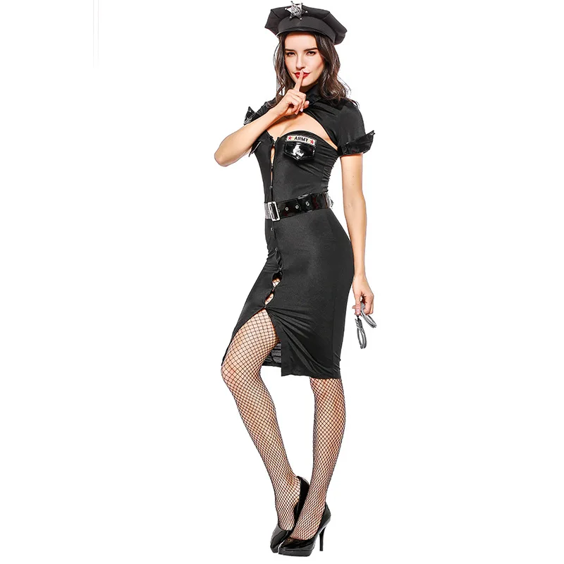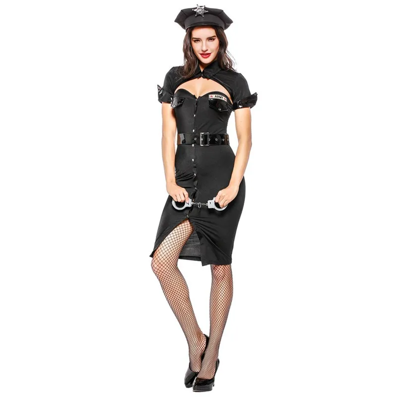 6PCS Sexy Black Adult Halloween Purim Police Cop Officer Costume Nightclub Exotic Party Policewomen Cosplay Dress for women