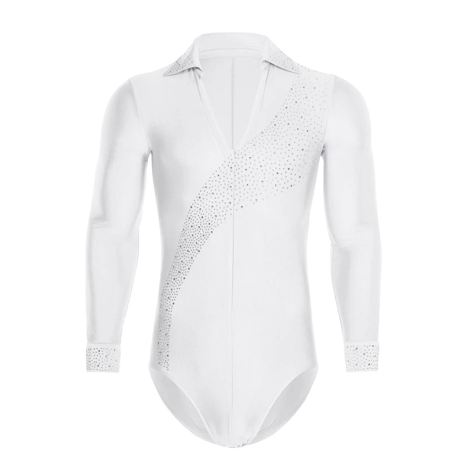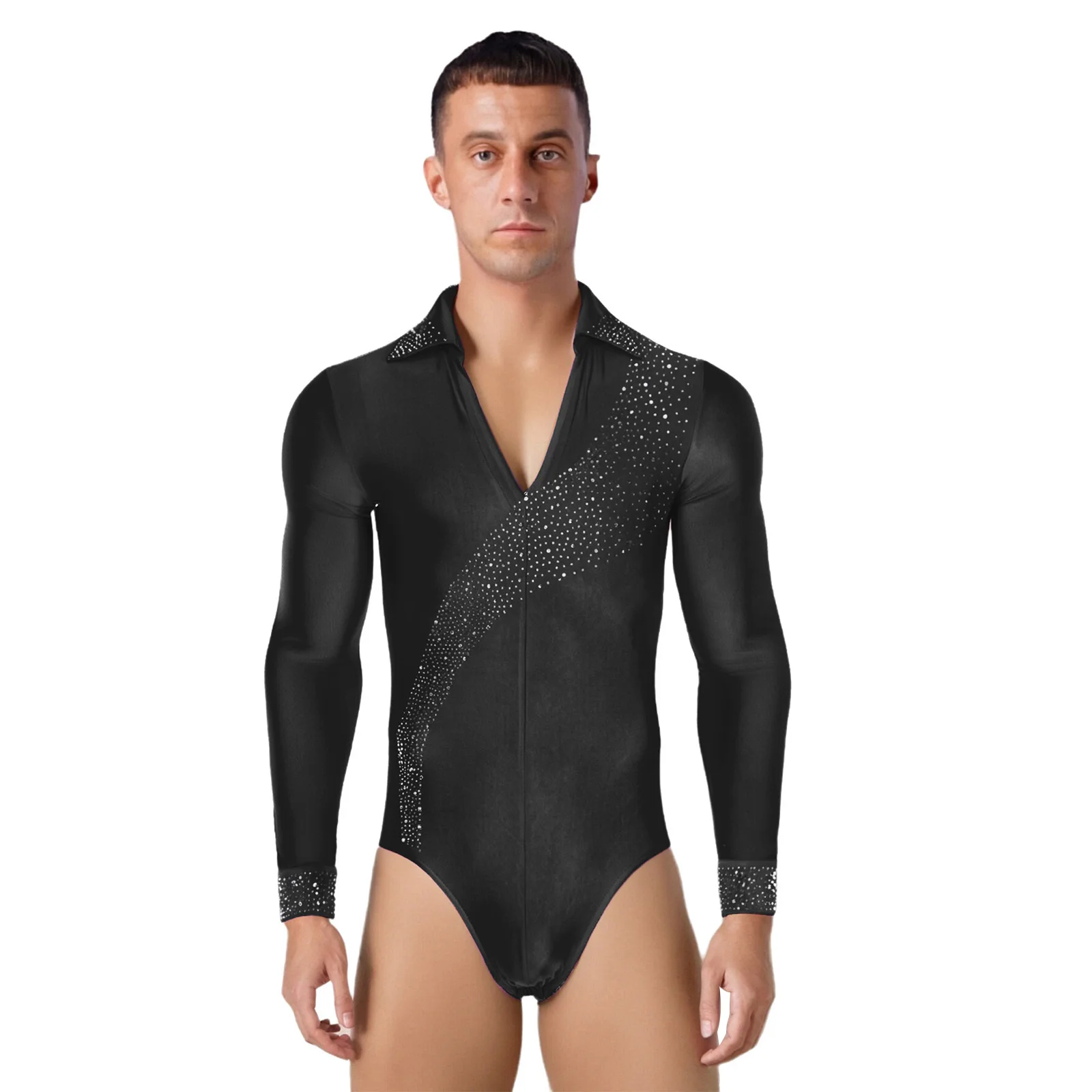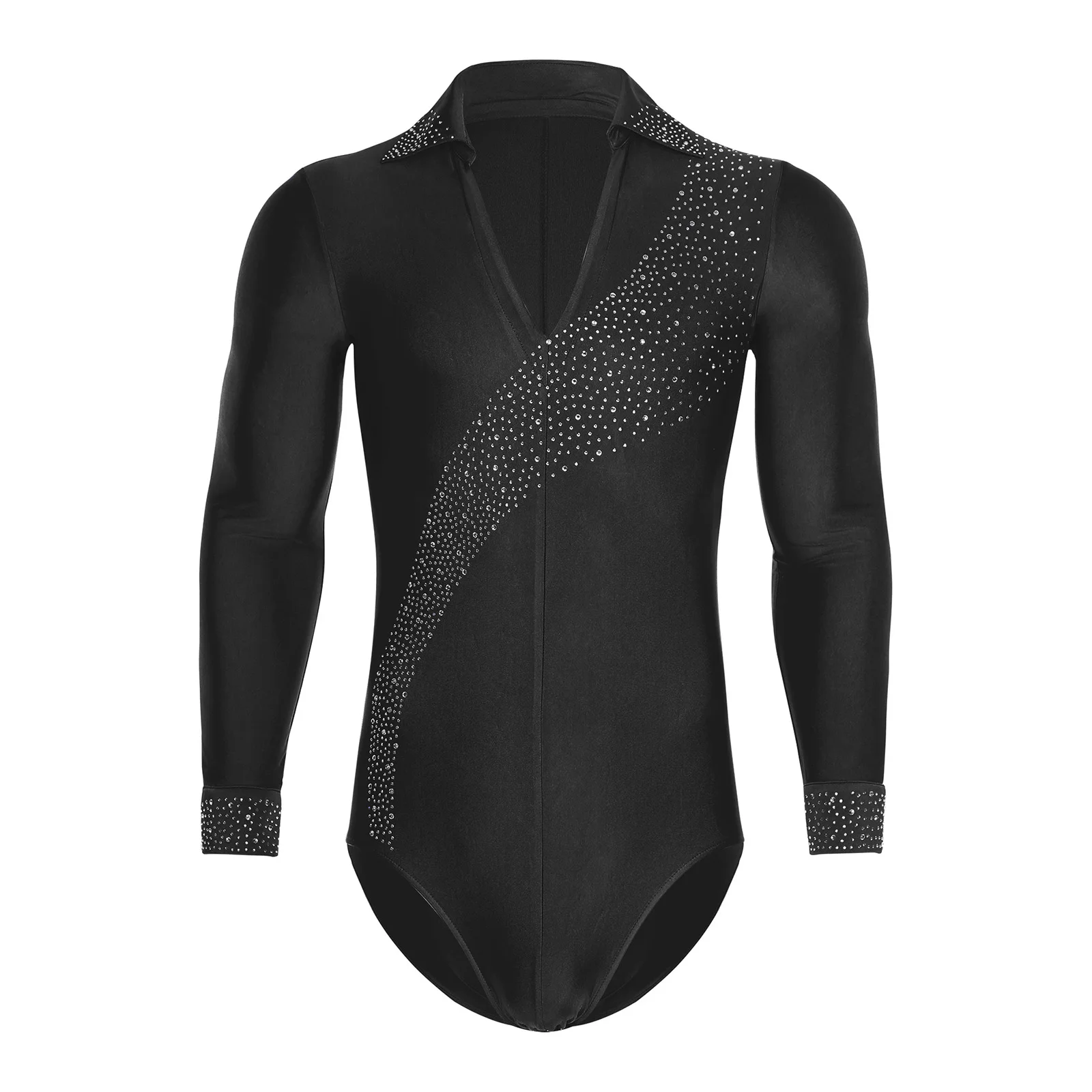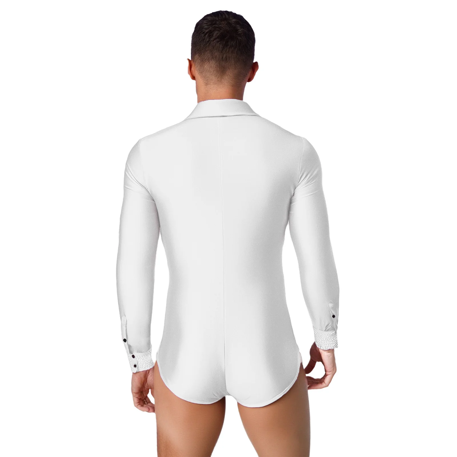 Adults Men Latin Dance Jumpsuit Shiny Rhinestones Long Sleeve Crotch Press Button Dance Bodysuit Shirt Modern Latin Dancewear