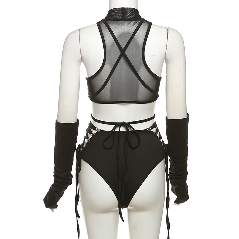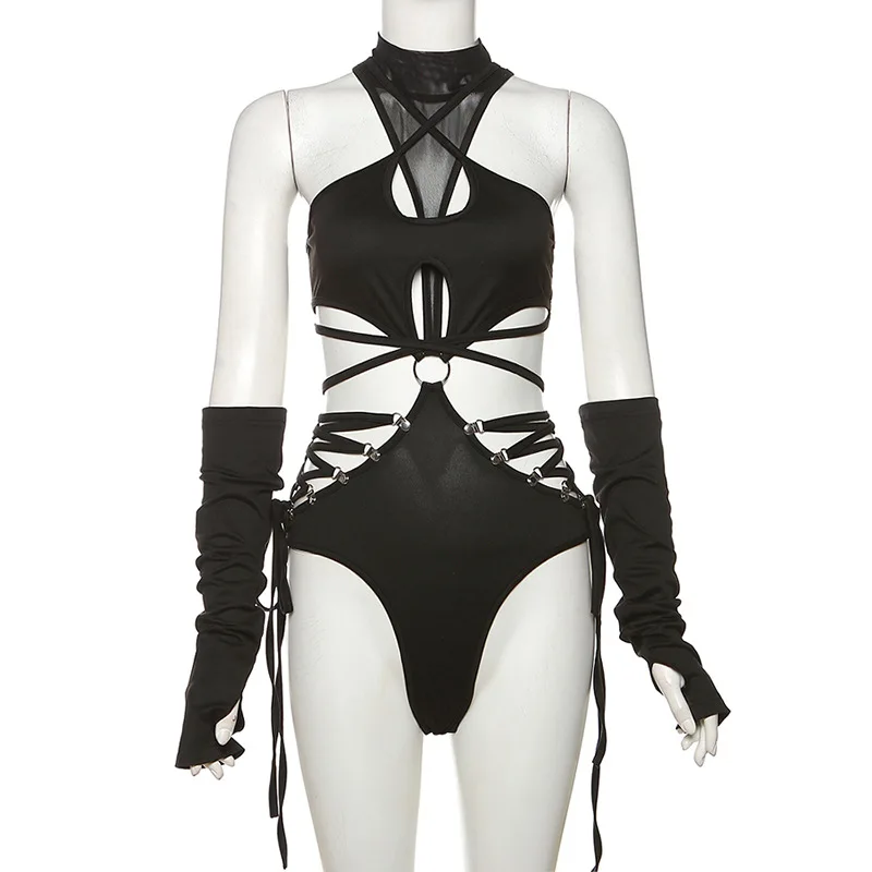 Bandage Hollow Out Sexy Cyber Bodysuits Gothic Techwear Mesh Patchwork Tops Female Glove Sleeve Mock Neck Bodysuit
