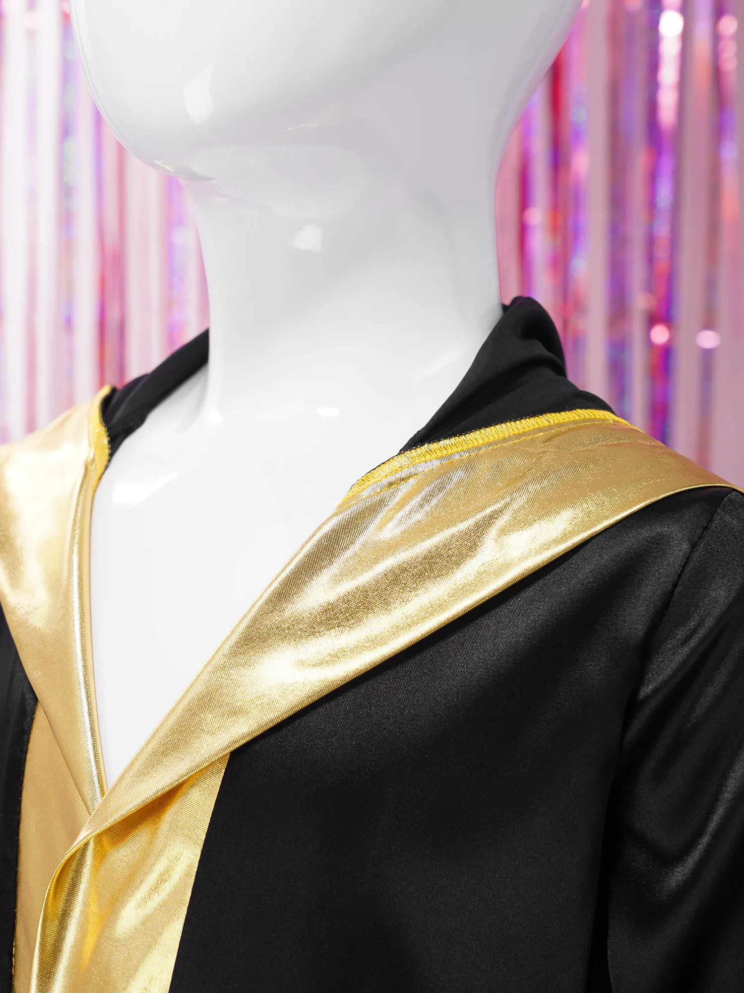 Satin hooded robe with two fake pockets and gold metallic trim to make your child look like a champion boxer.