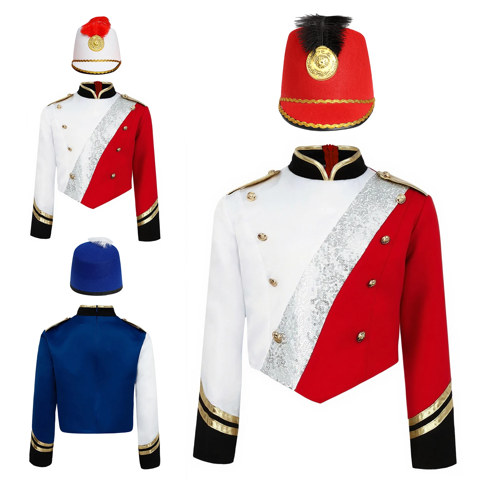 Boys Marching Band Honor Guard Halloween Cosplay Costume Uniform Set Sequins Shoulder Epaulets Buttons Zipper Tops with Hat