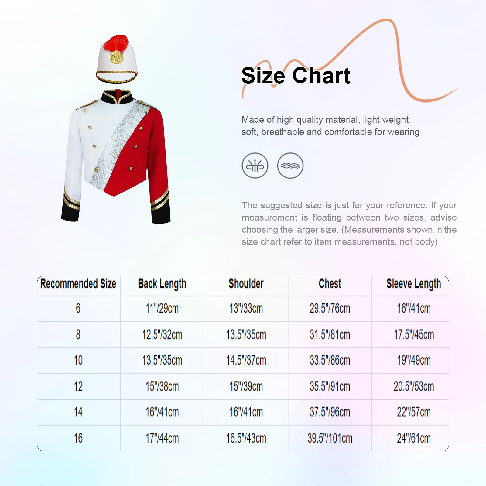 The zipper closure on the tops makes it convenient for kids to put on and take off, and the included hat completes the entire marching band look. This costume is perfect for school marching band performances, parades, or any special events where a formal and trendy outfit is needed.