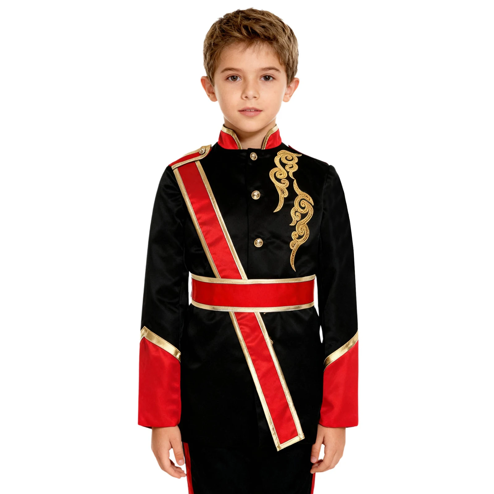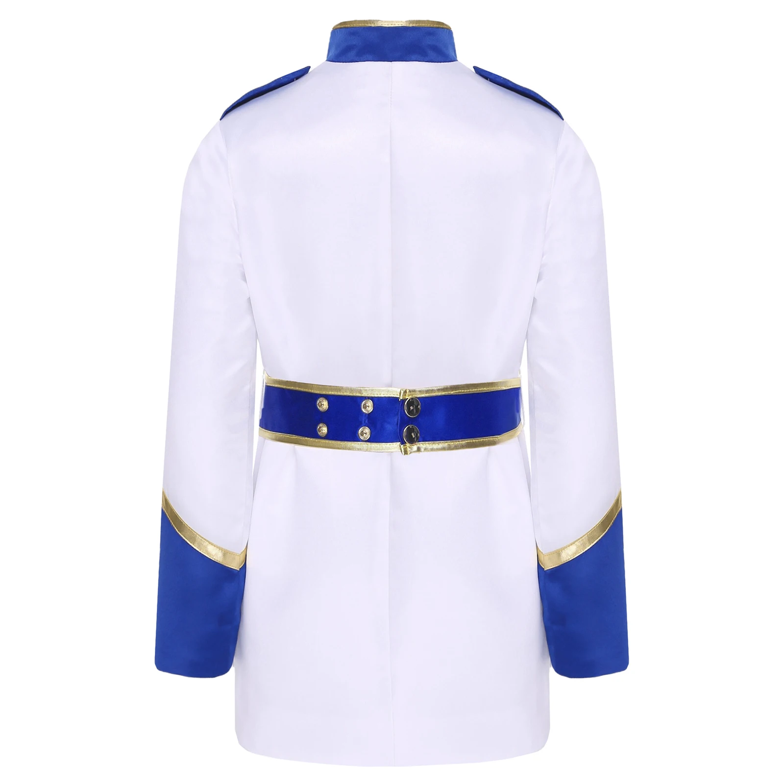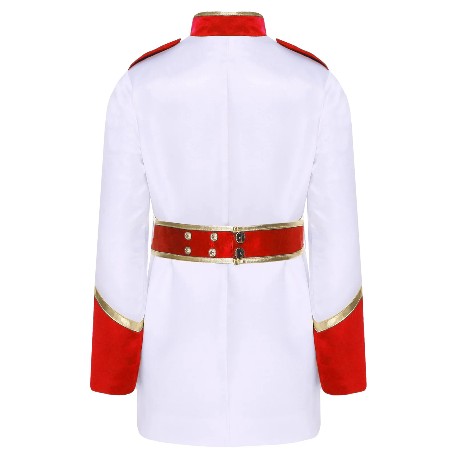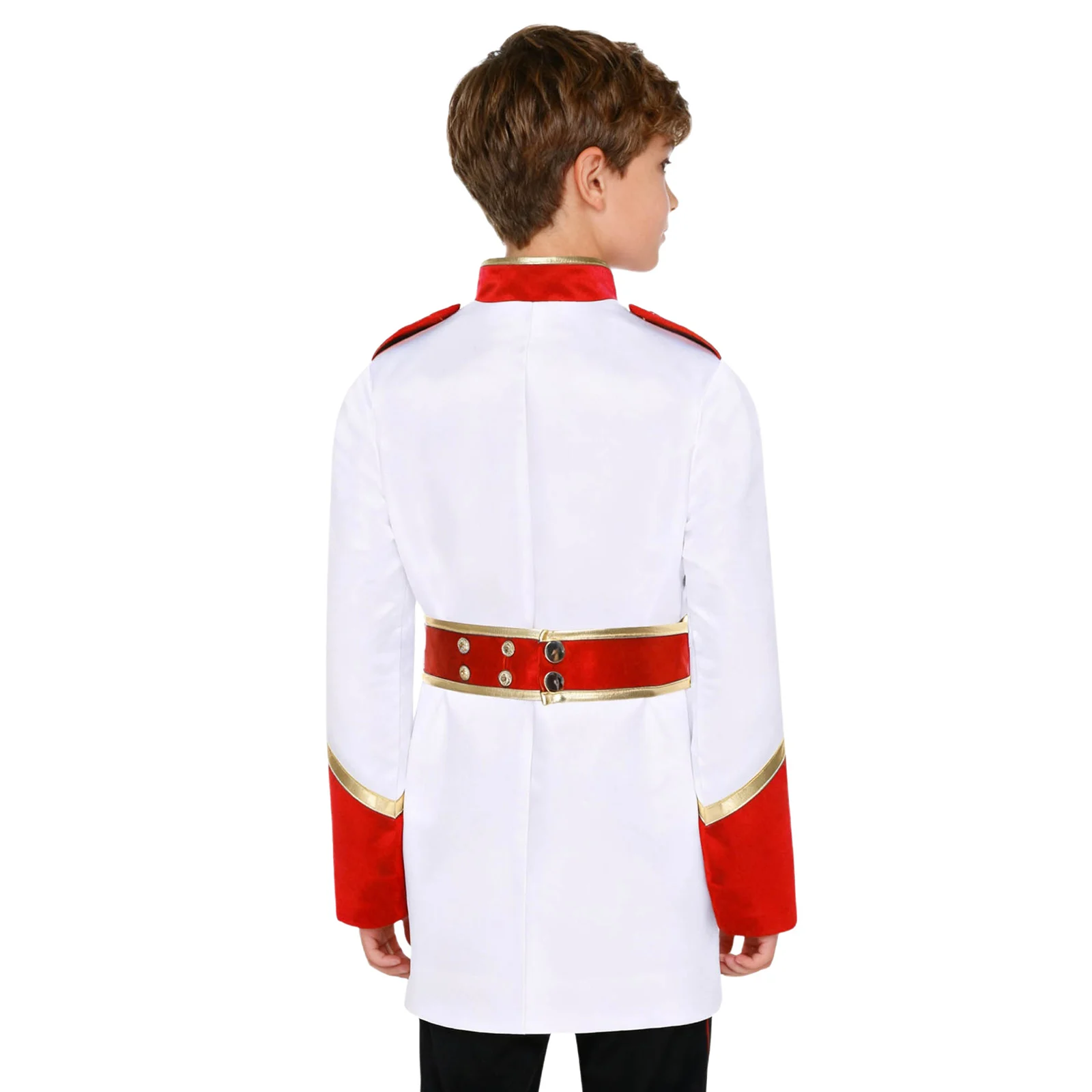 Boys Royal Prince Guard Drummer Marching Band Cosplay Costume Sequins Front Buttons Outwear Jacket with Press Buttons Waistbelt