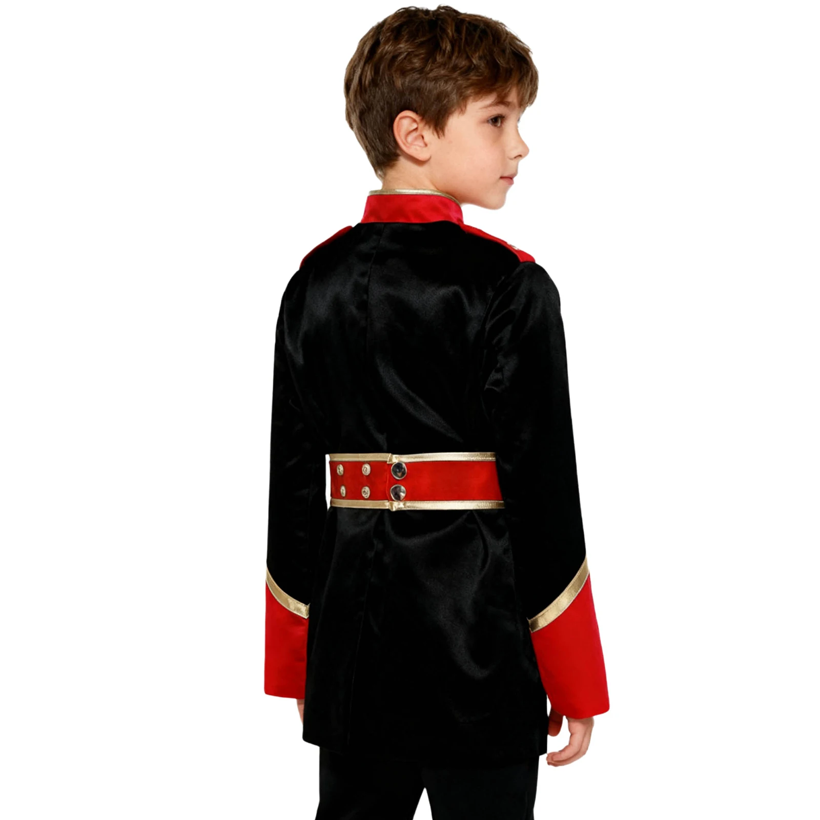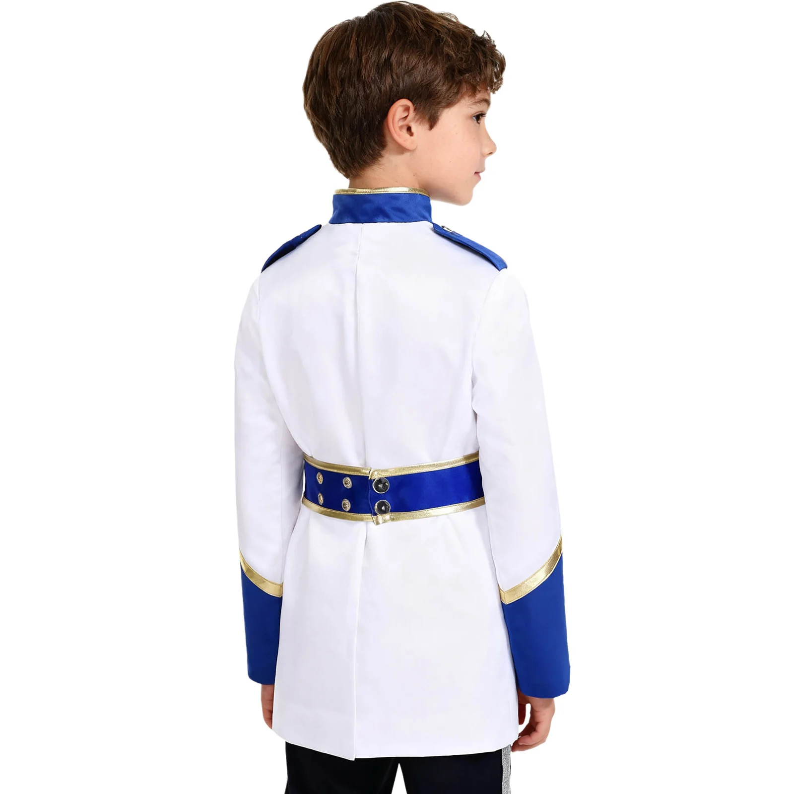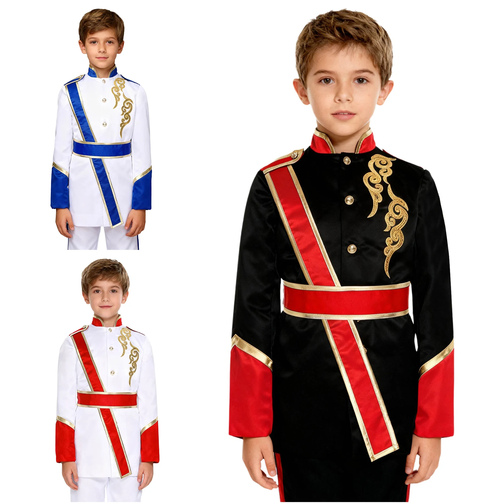 Boys Royal Prince Guard Drummer Marching Band Cosplay Costume Sequins Front Buttons Outwear Jacket with Press Buttons Waistbelt
