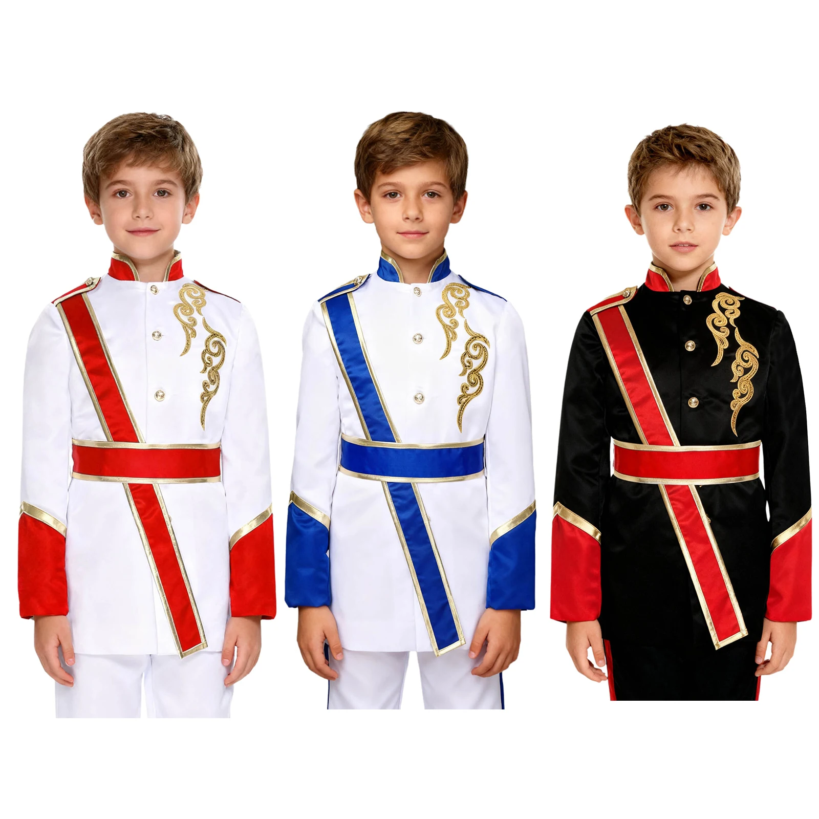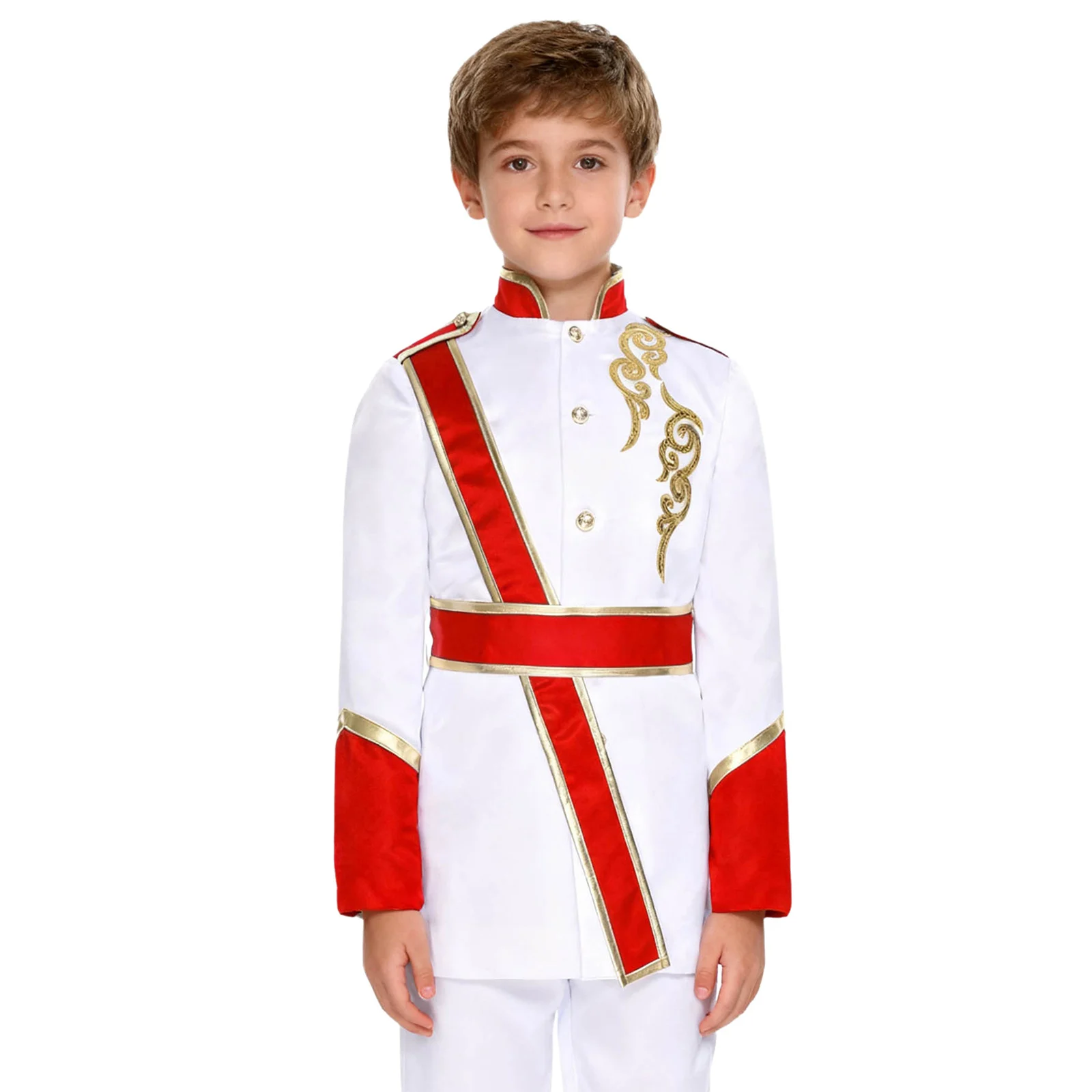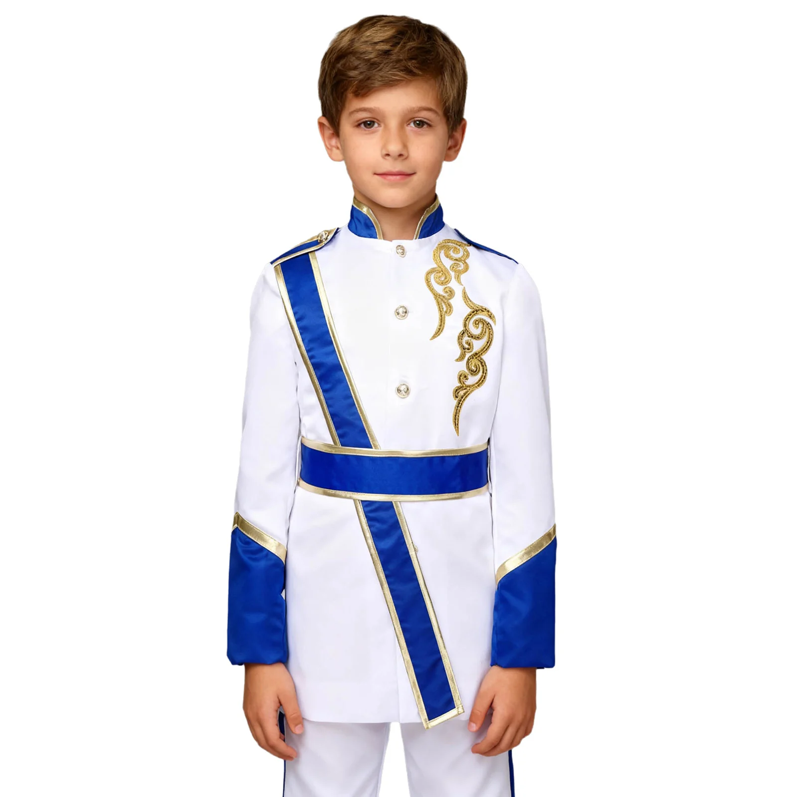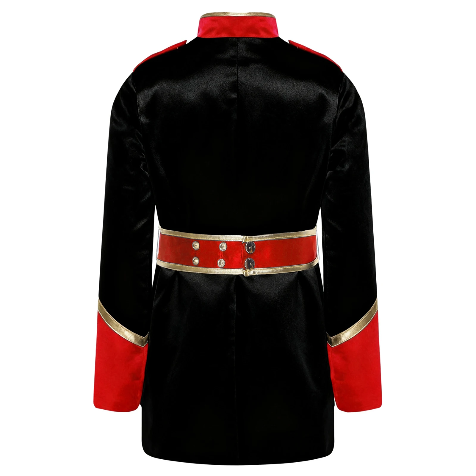 Boys Royal Prince Guard Drummer Marching Band Cosplay Costume Sequins Front Buttons Outwear Jacket with Press Buttons Waistbelt