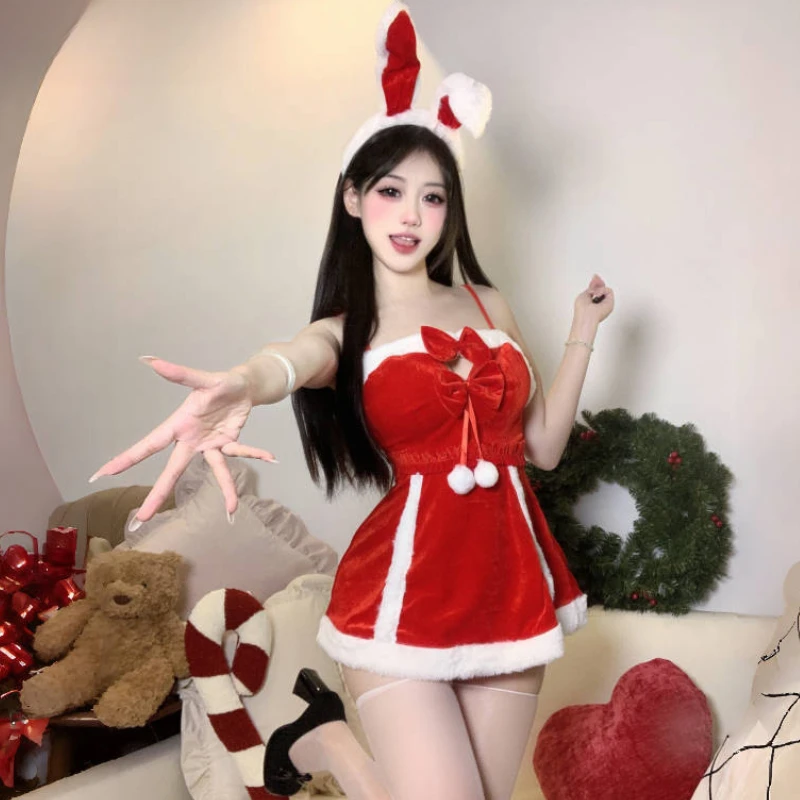 Christmas Red New Year Uniform Cosplay Costume Bow Bunny Girl Cute Dress Xmas Velvet Underwear Santa Claus Role Play Outfits