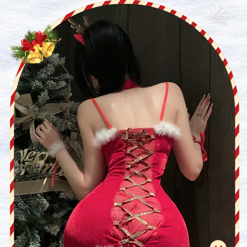 Christmas Sexy Elk Velvet Uniform Cosplay Costume See Through Bandage Nightdress Red New Year Outfits Girls Role Play Underwear