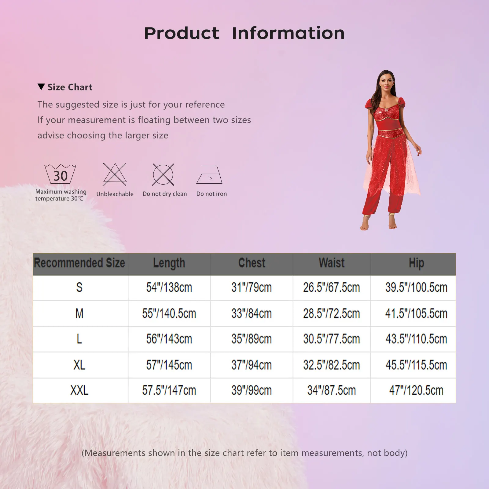 Size Chart: The suggested size is just for your reference. If your measurement is floating between two sizes, advise choosing the larger size. (Measurements shown in the size chart refer to item measurements, not body)
