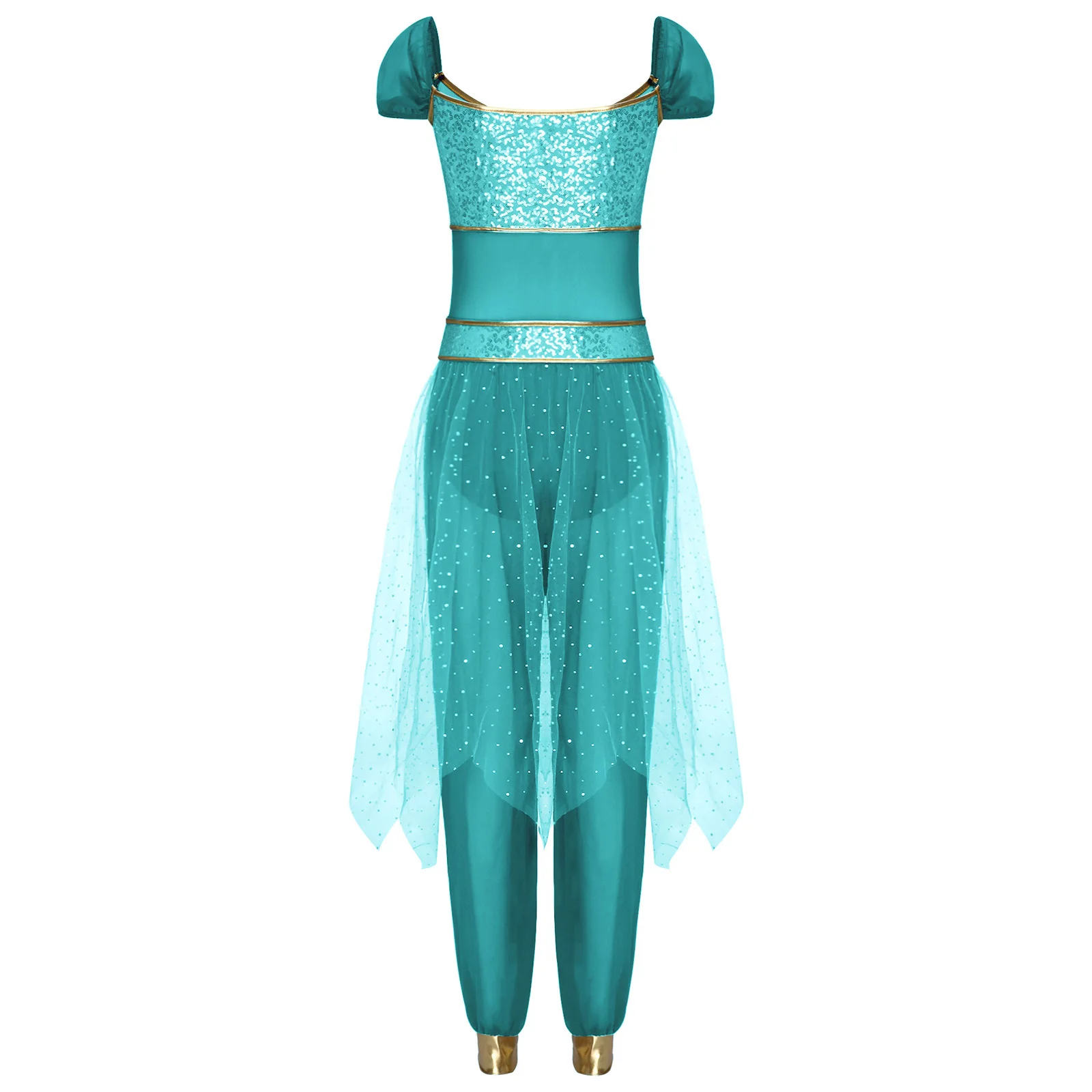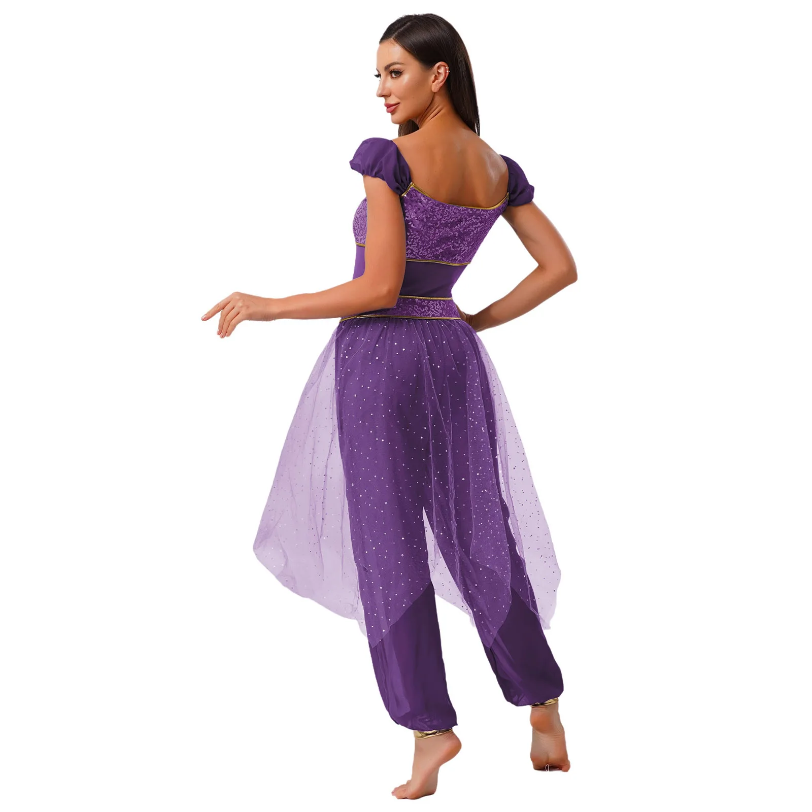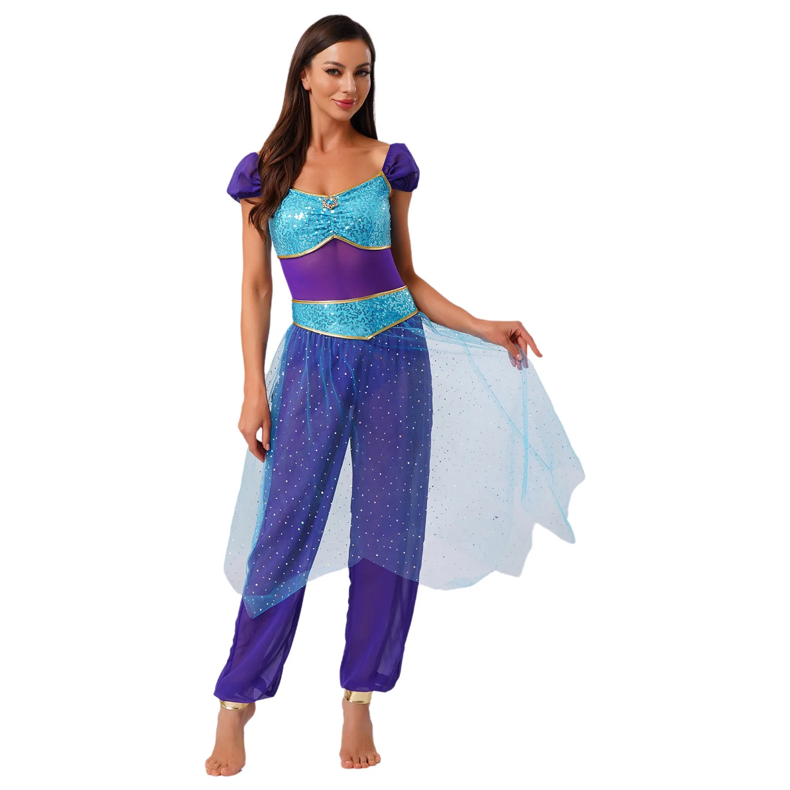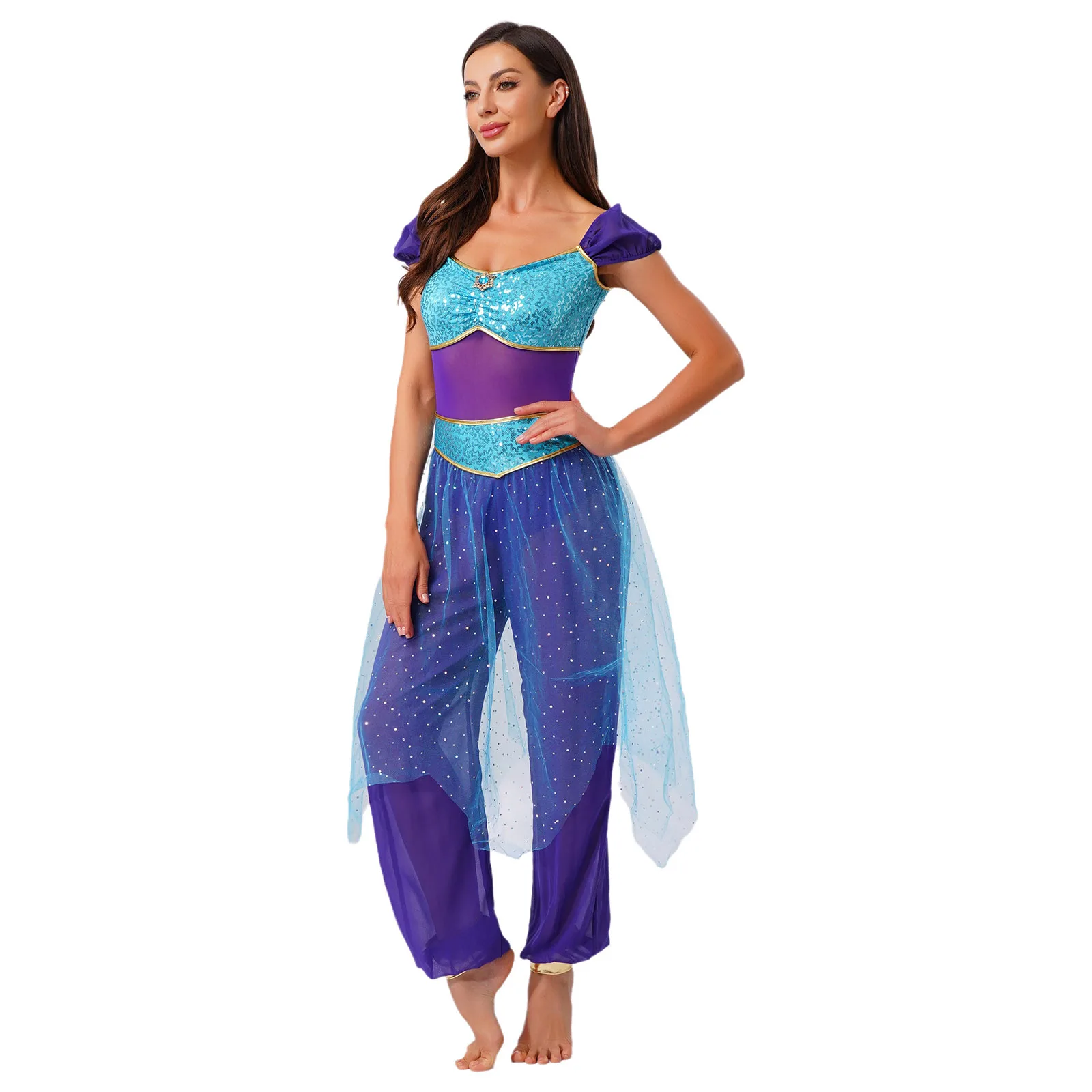 Festival Halloween Arabian Princess Costume Indian Dance Jumpsuit Gem Decor Sequin Tulle Overlay Dresses for Women Cosplay Party