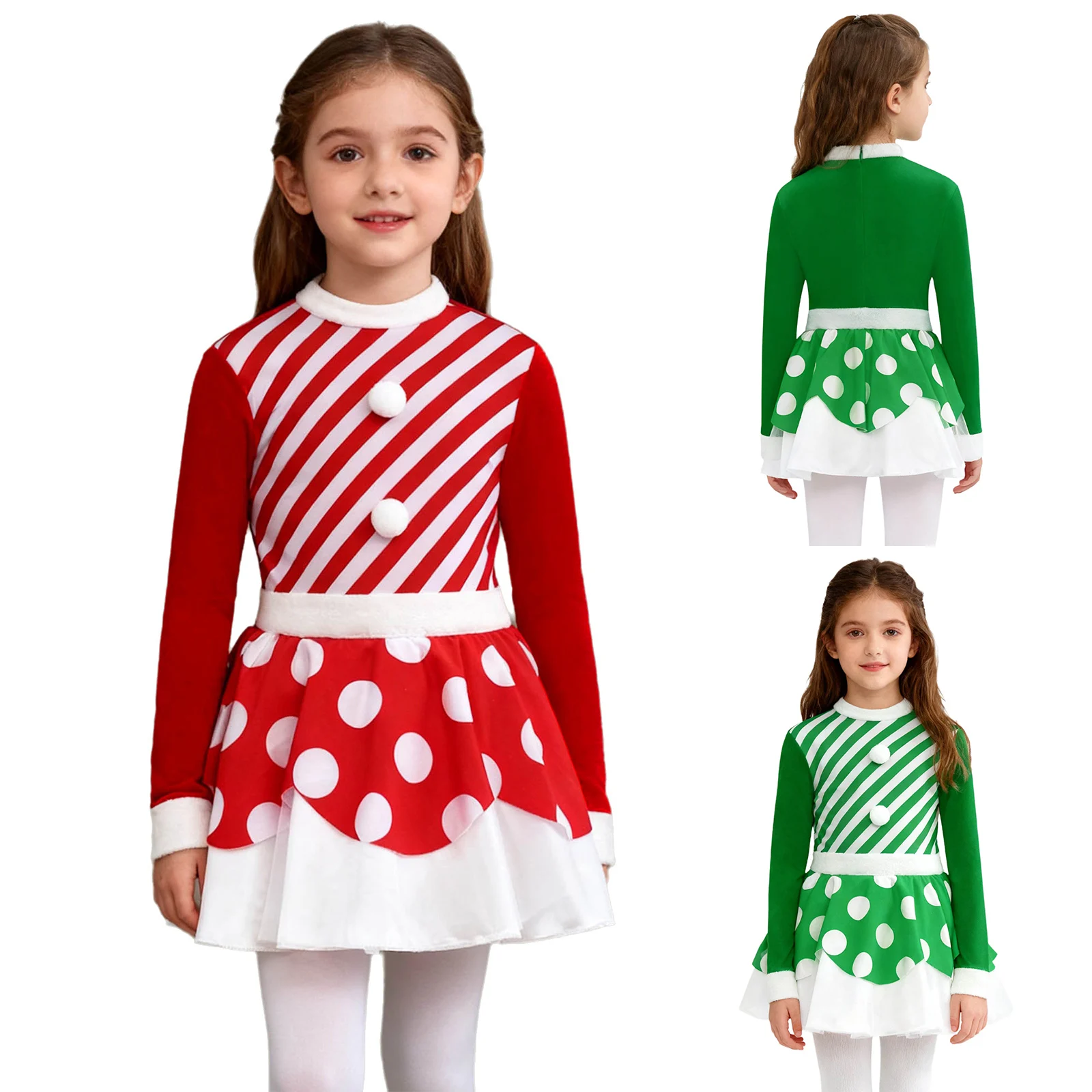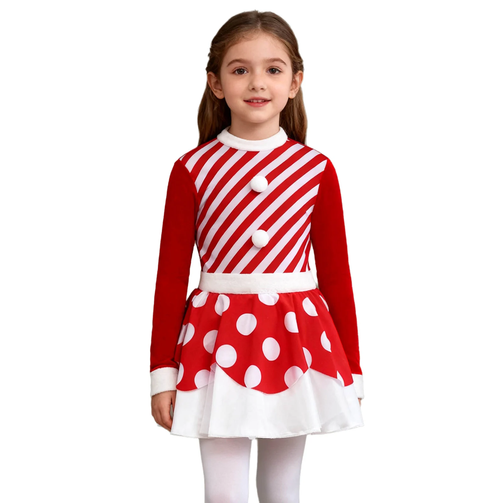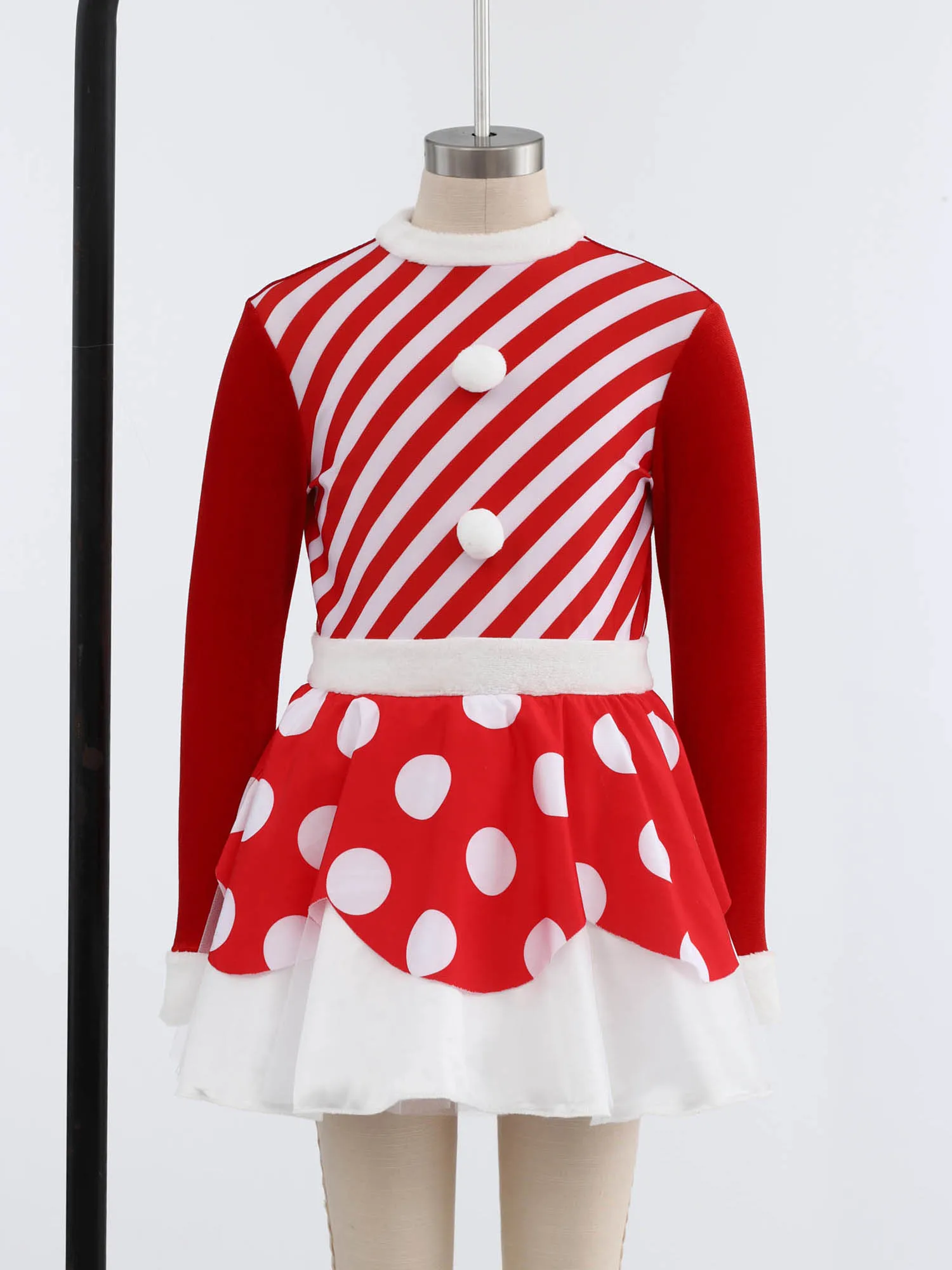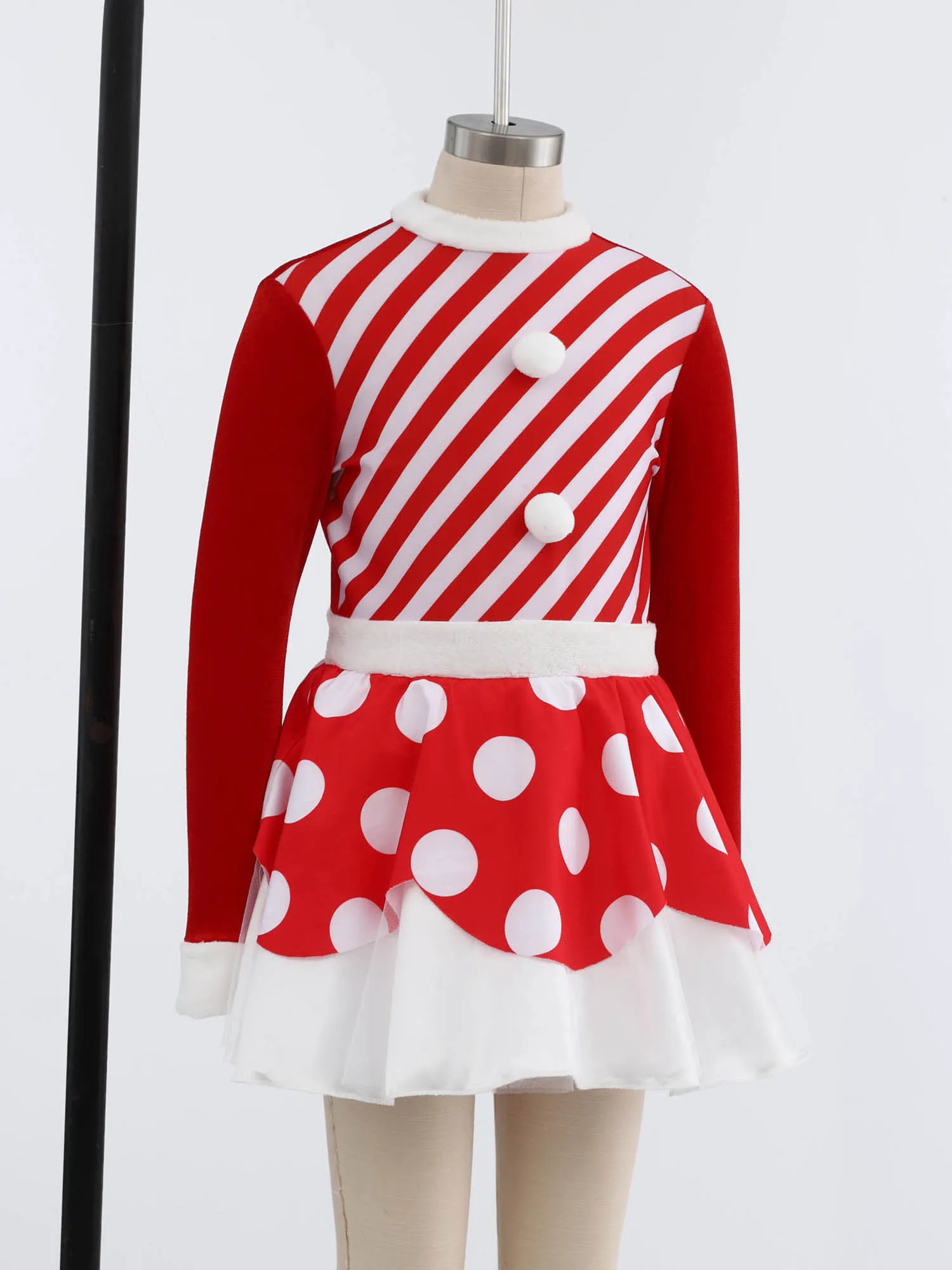 Girls Candy Cane Christmas Cosplay Costume Ballet Tutu Dress Striped Santa Dress Long Sleeve Pompom Back Invisible Zipper Dress