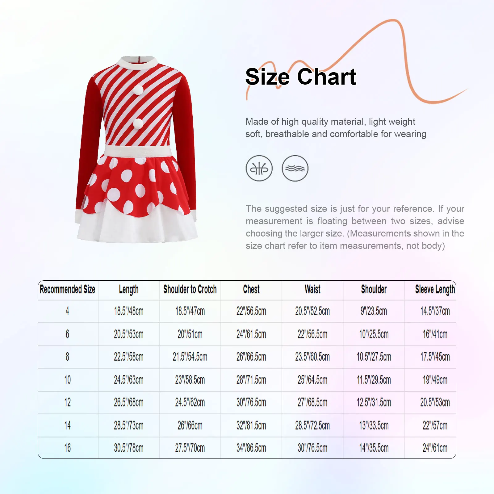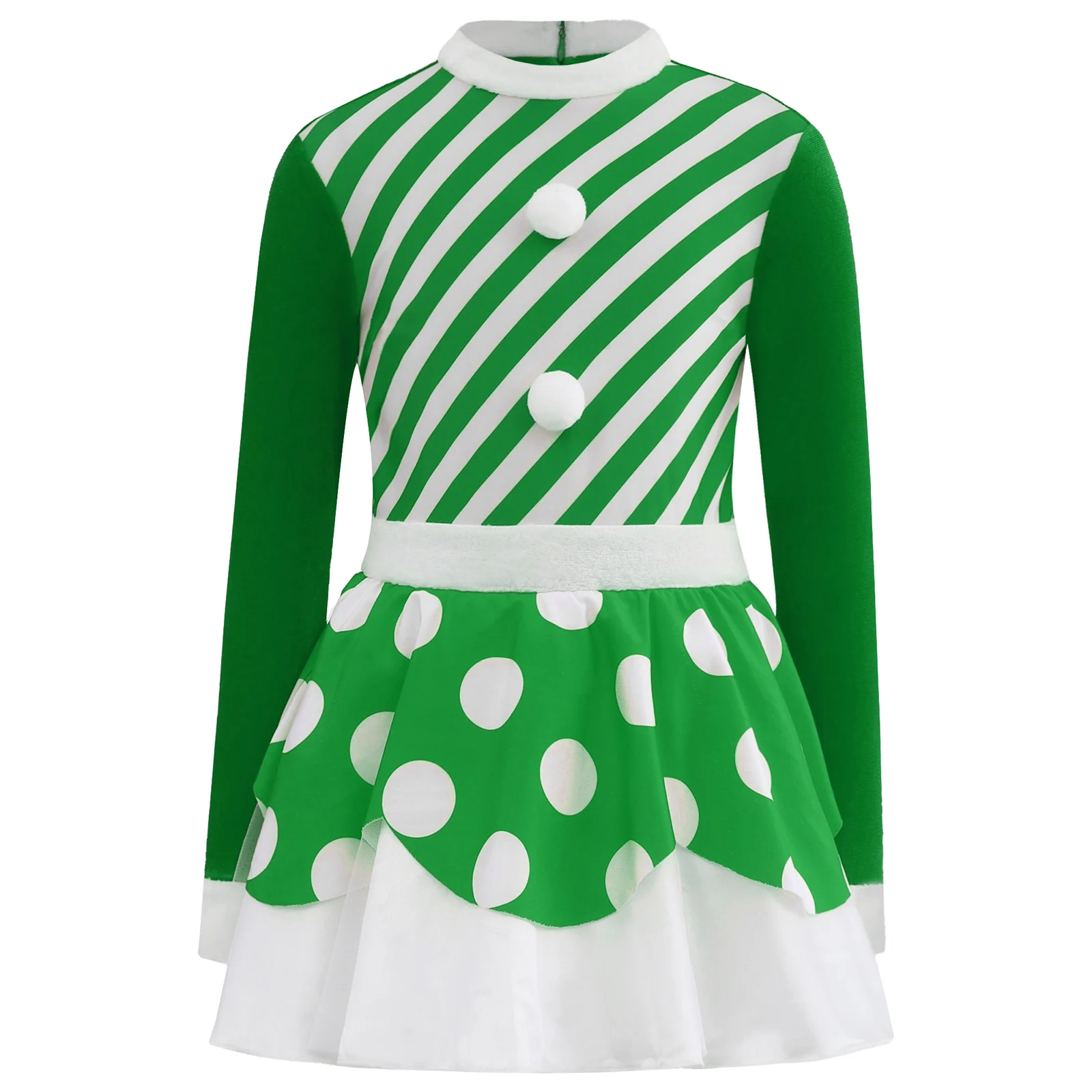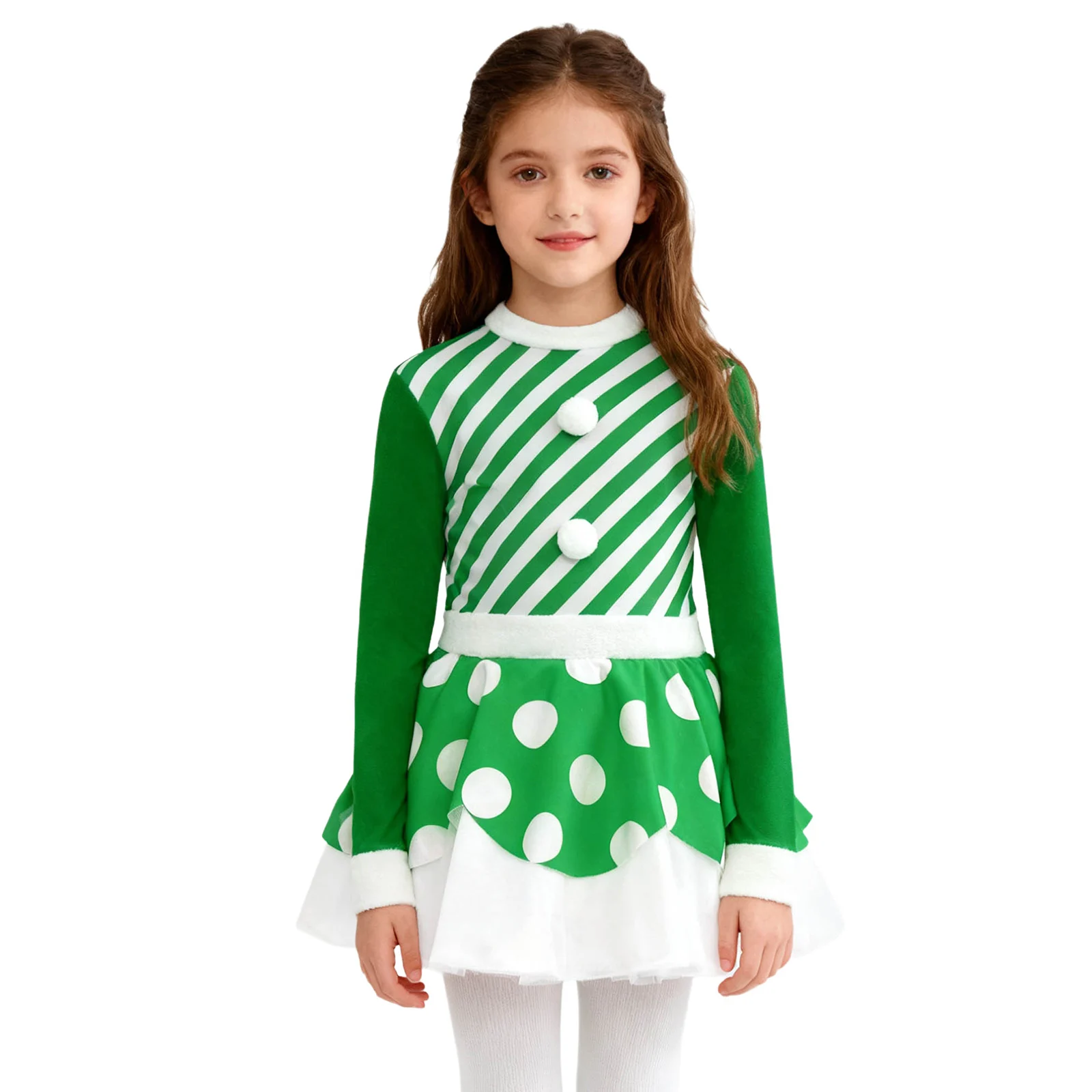 Girls Candy Cane Christmas Cosplay Costume Ballet Tutu Dress Striped Santa Dress Long Sleeve Pompom Back Invisible Zipper Dress