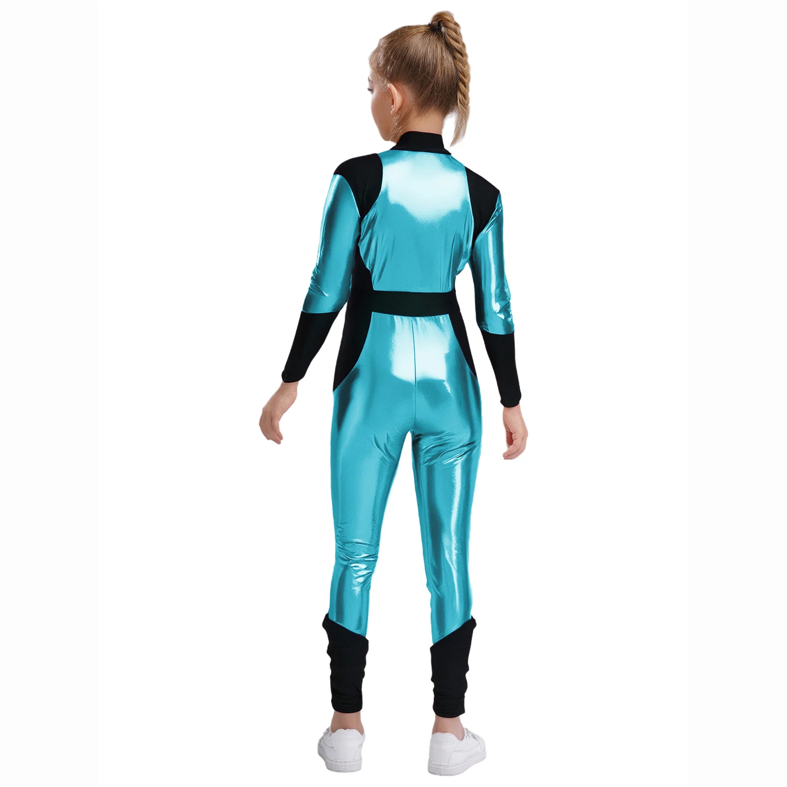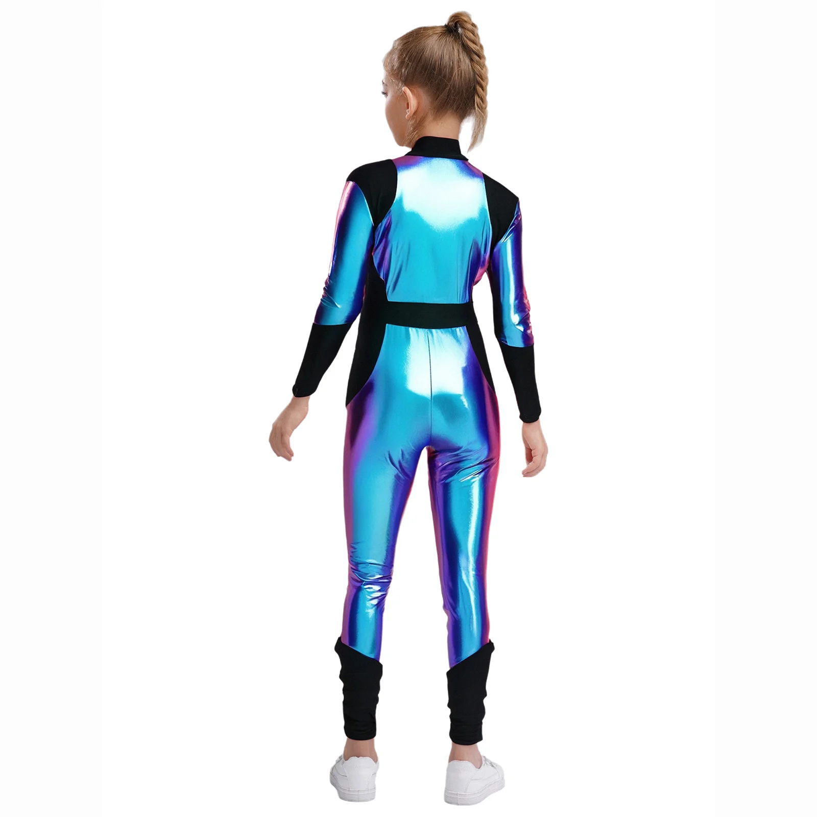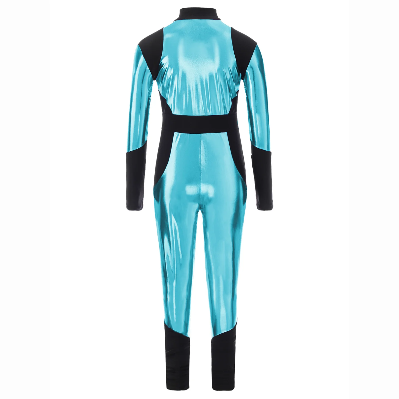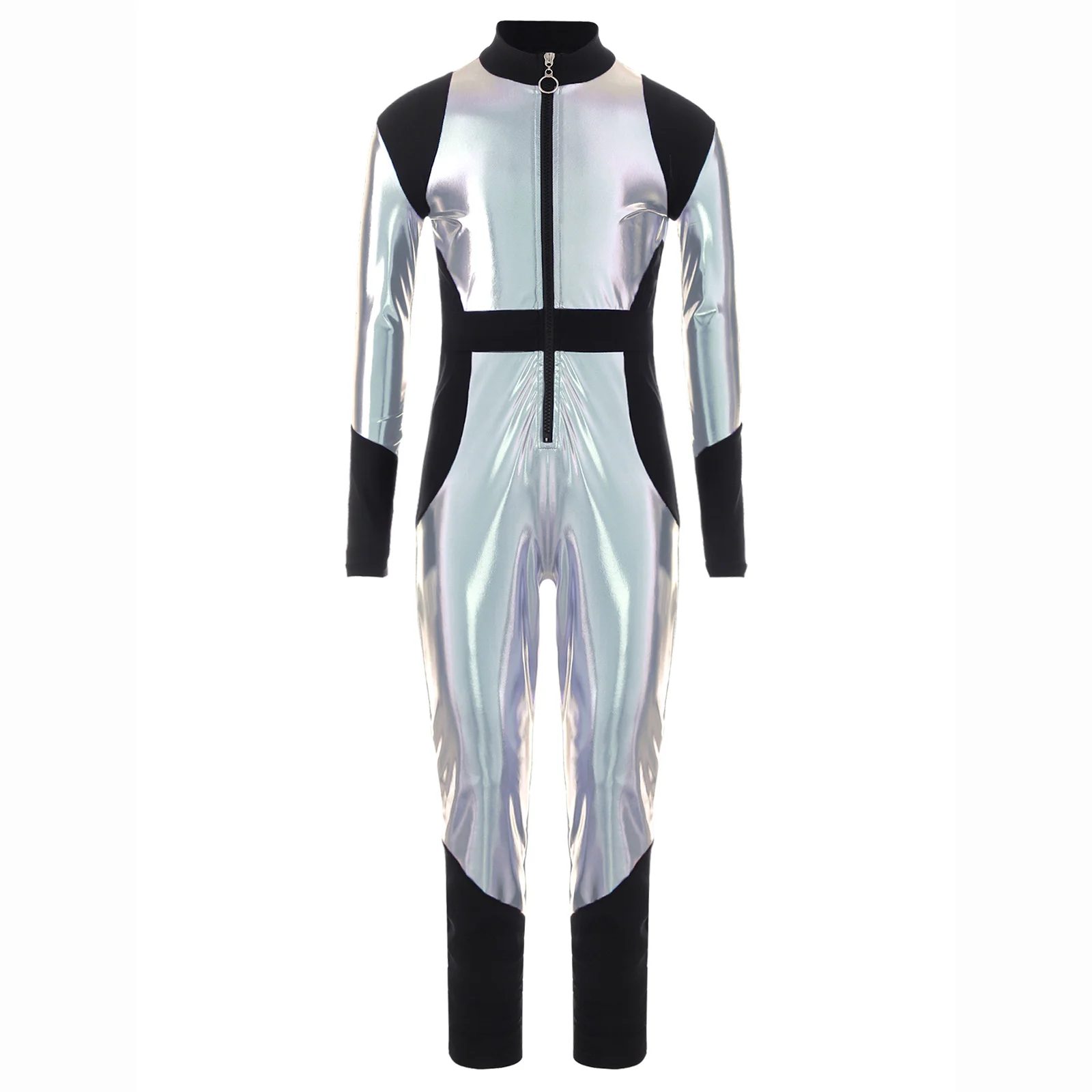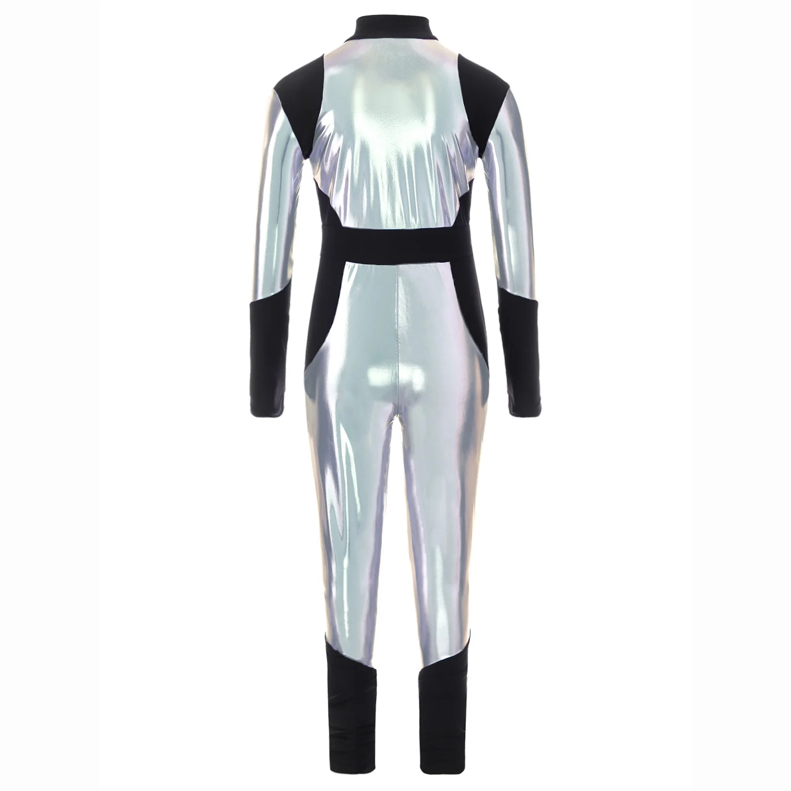 Girls Halloween Alien Outer Space Cadet Cosplay Costume Shiny Metallic Zipper Astronaut Jumpsuit Athletic Robot Bodysuit