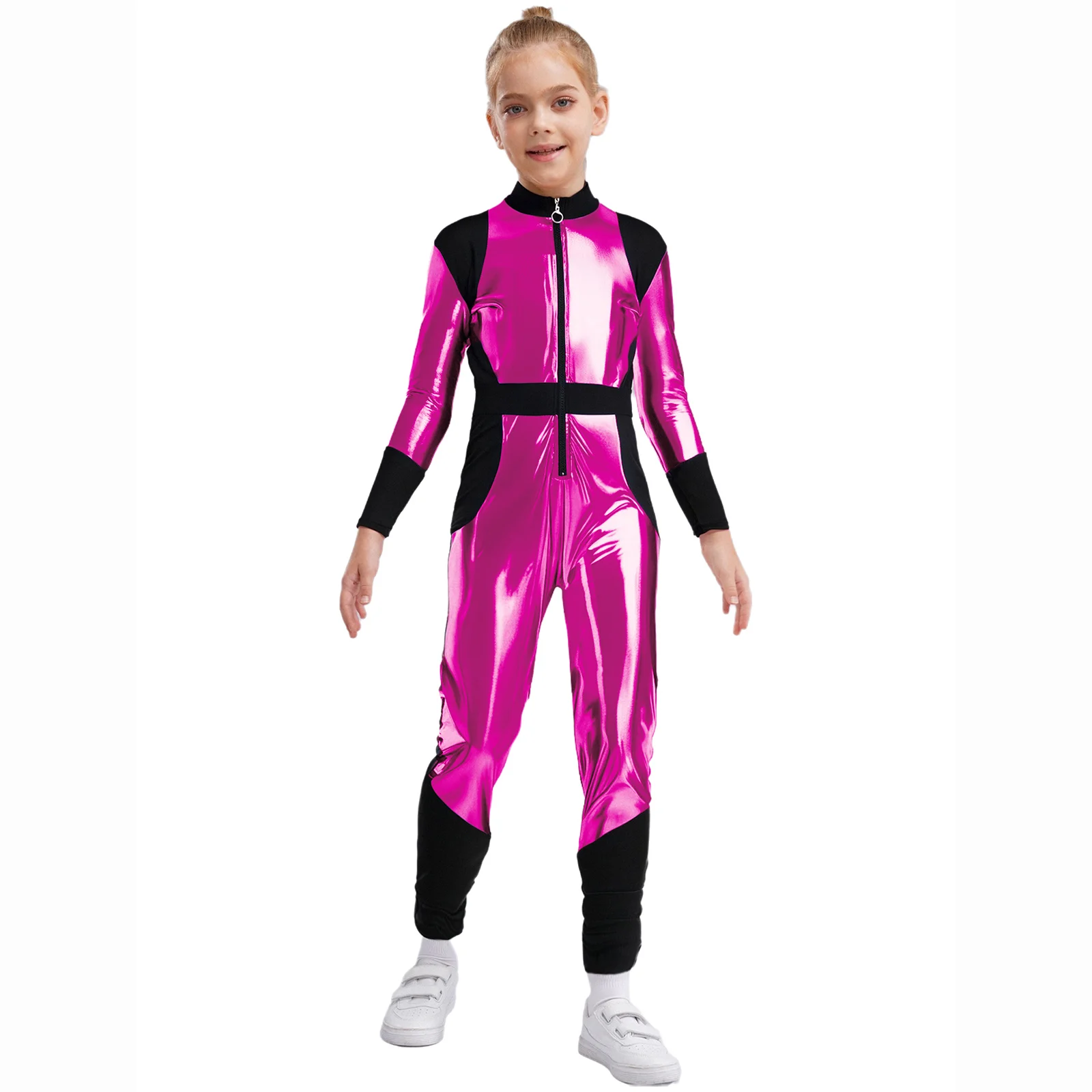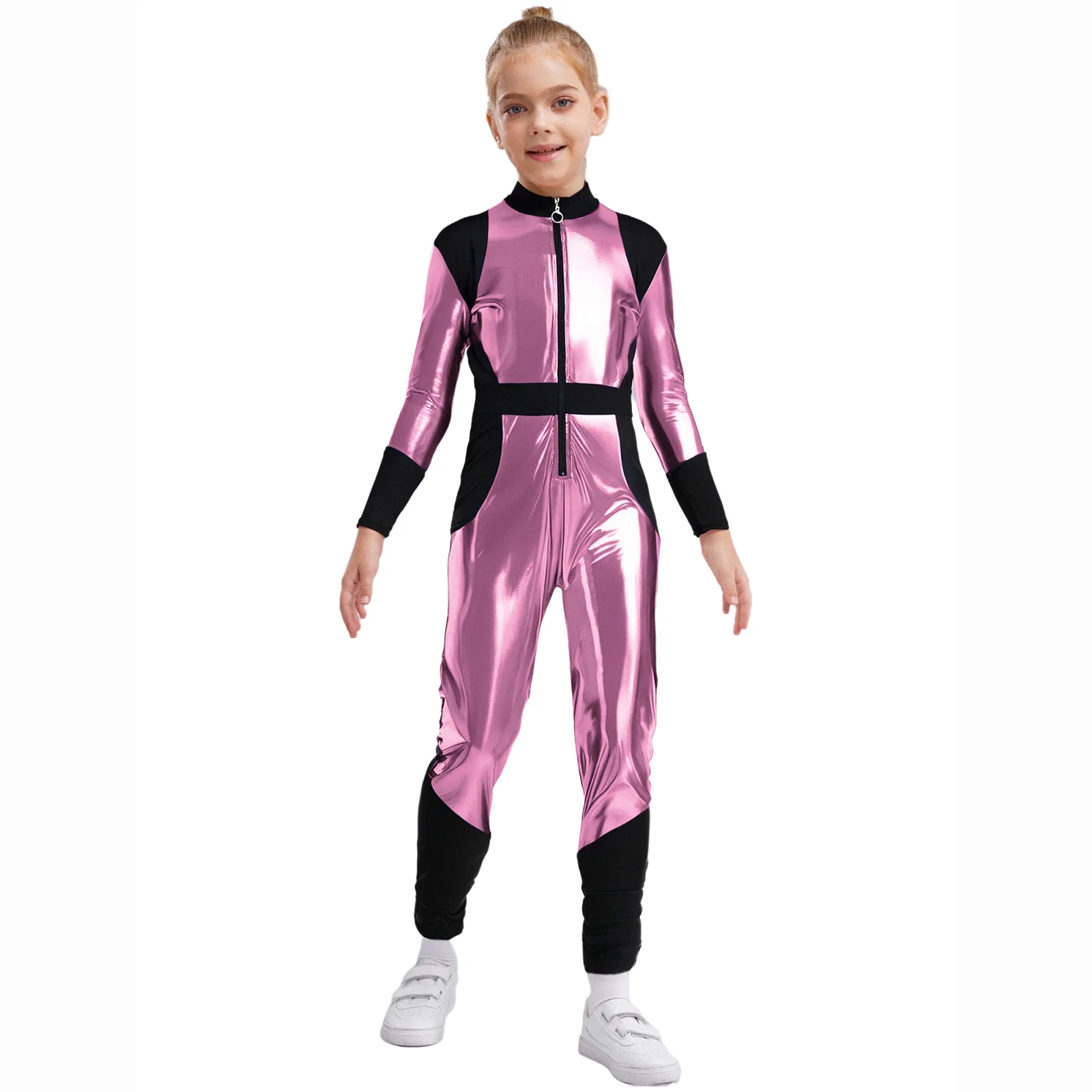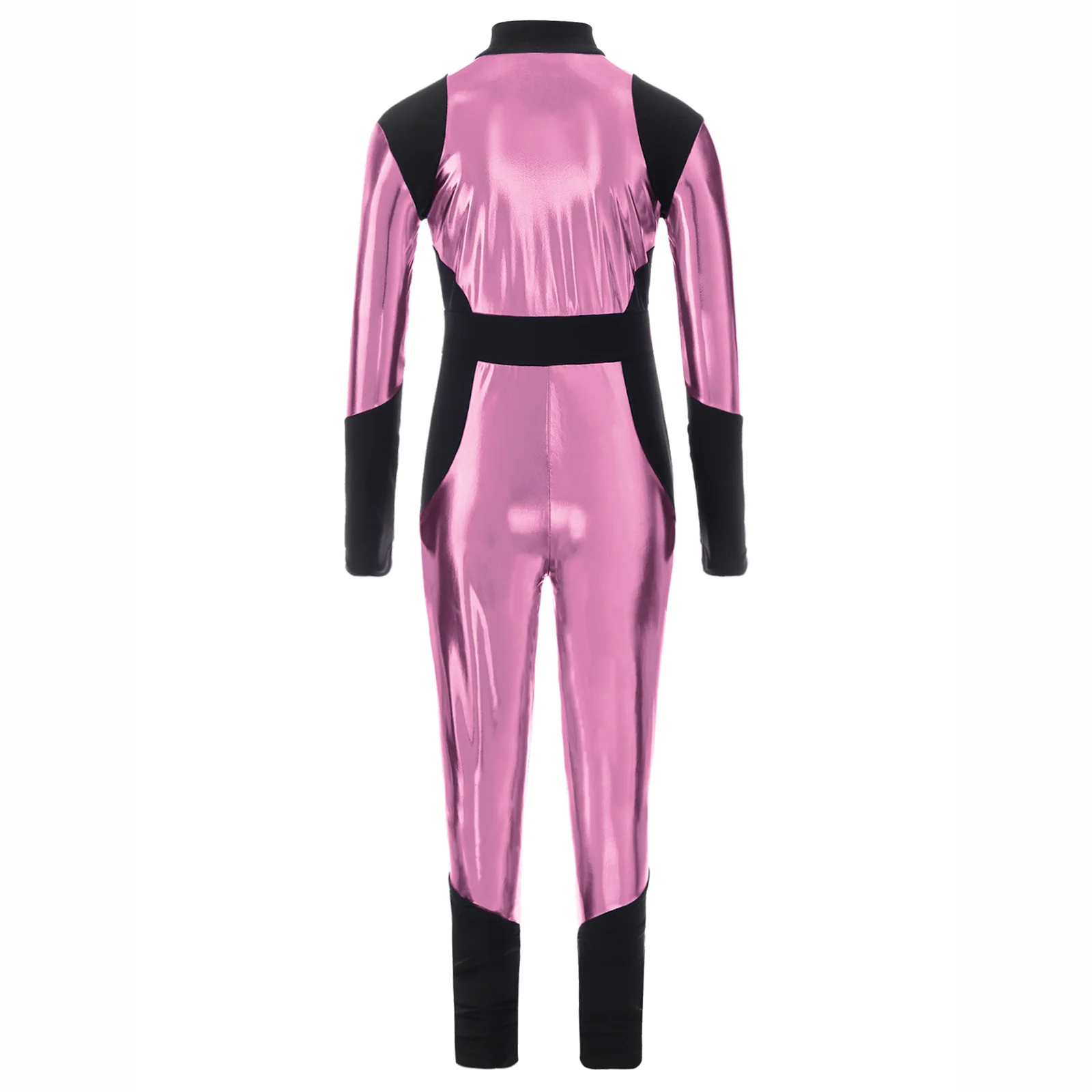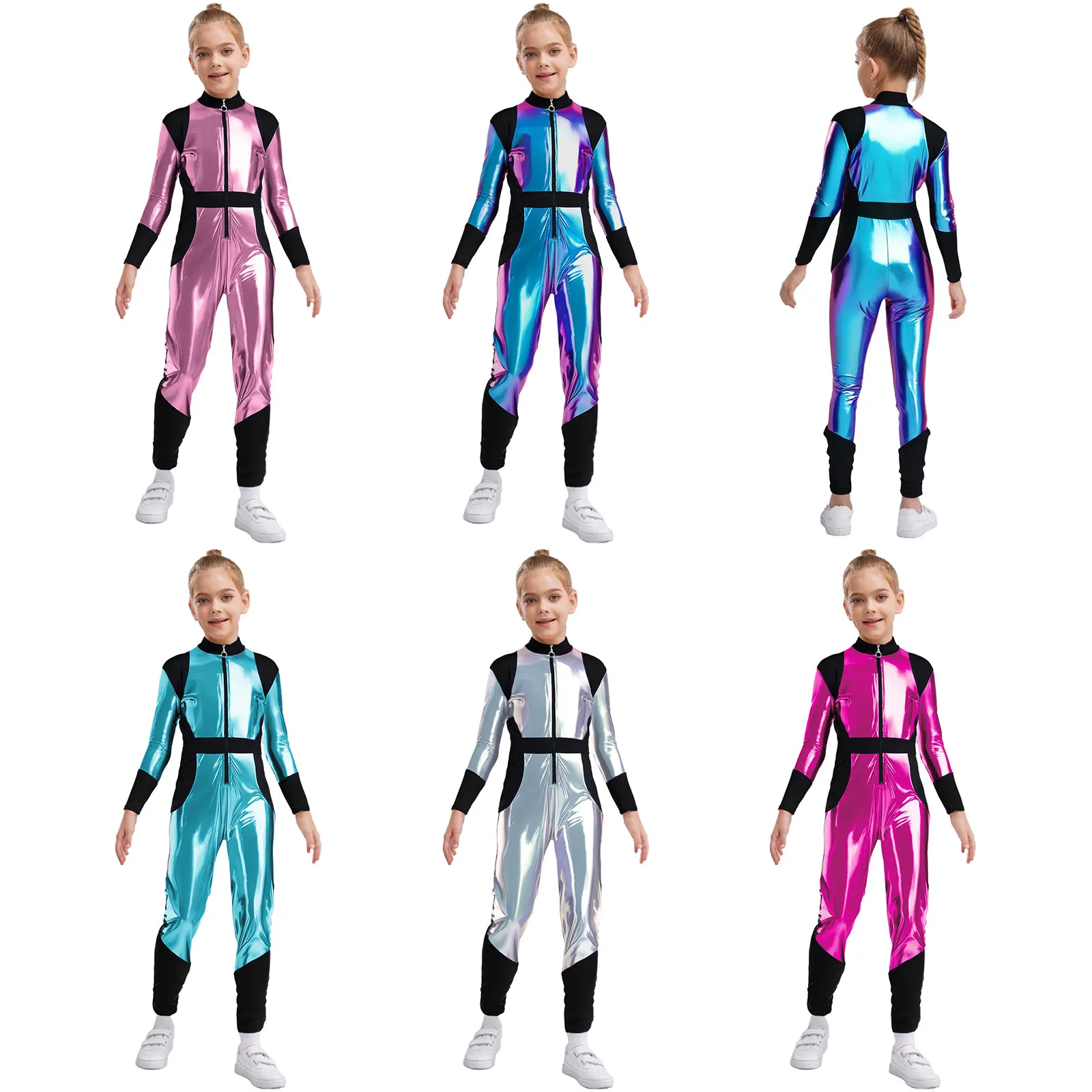 Girls Halloween Alien Outer Space Cadet Cosplay Costume Shiny Metallic Zipper Astronaut Jumpsuit Athletic Robot Bodysuit