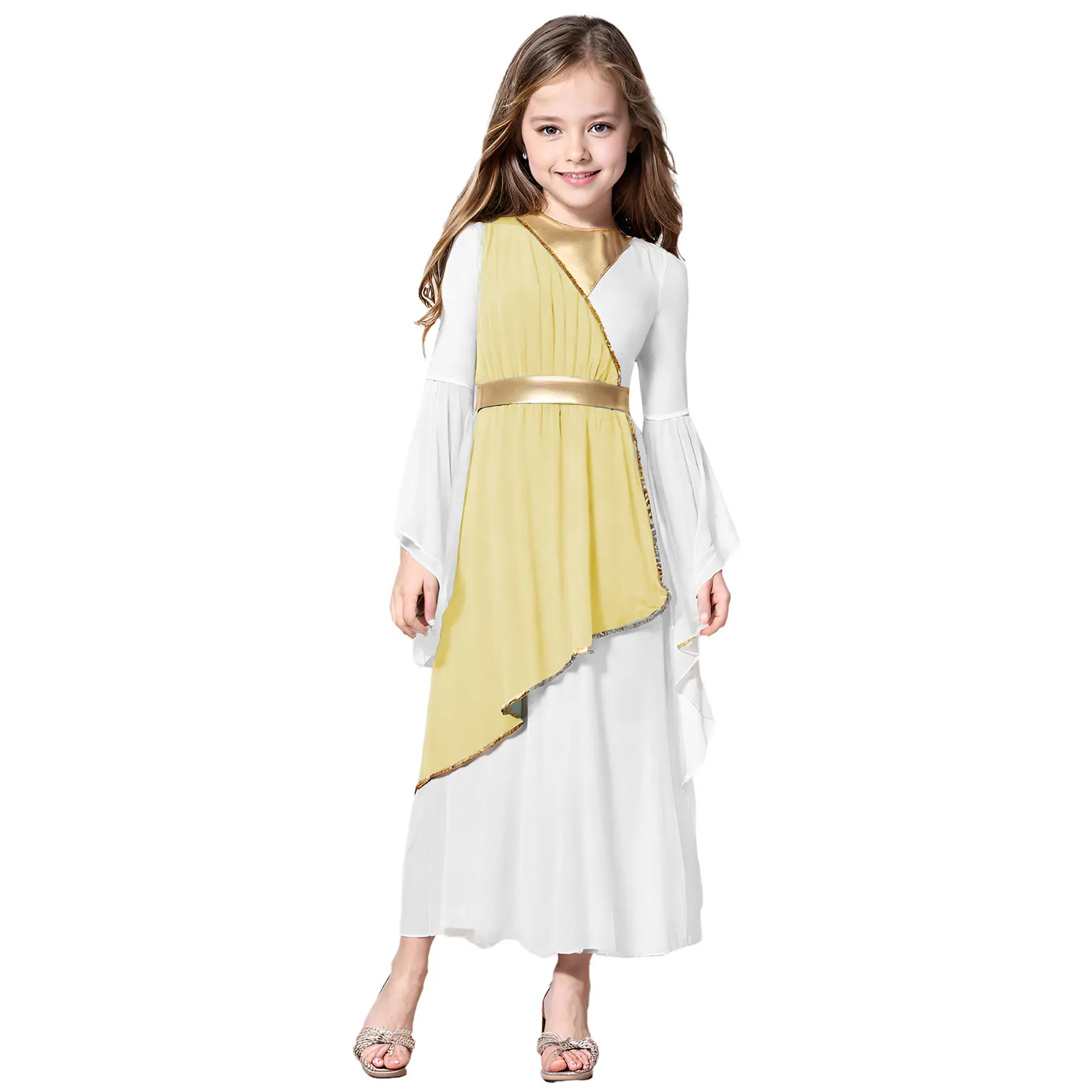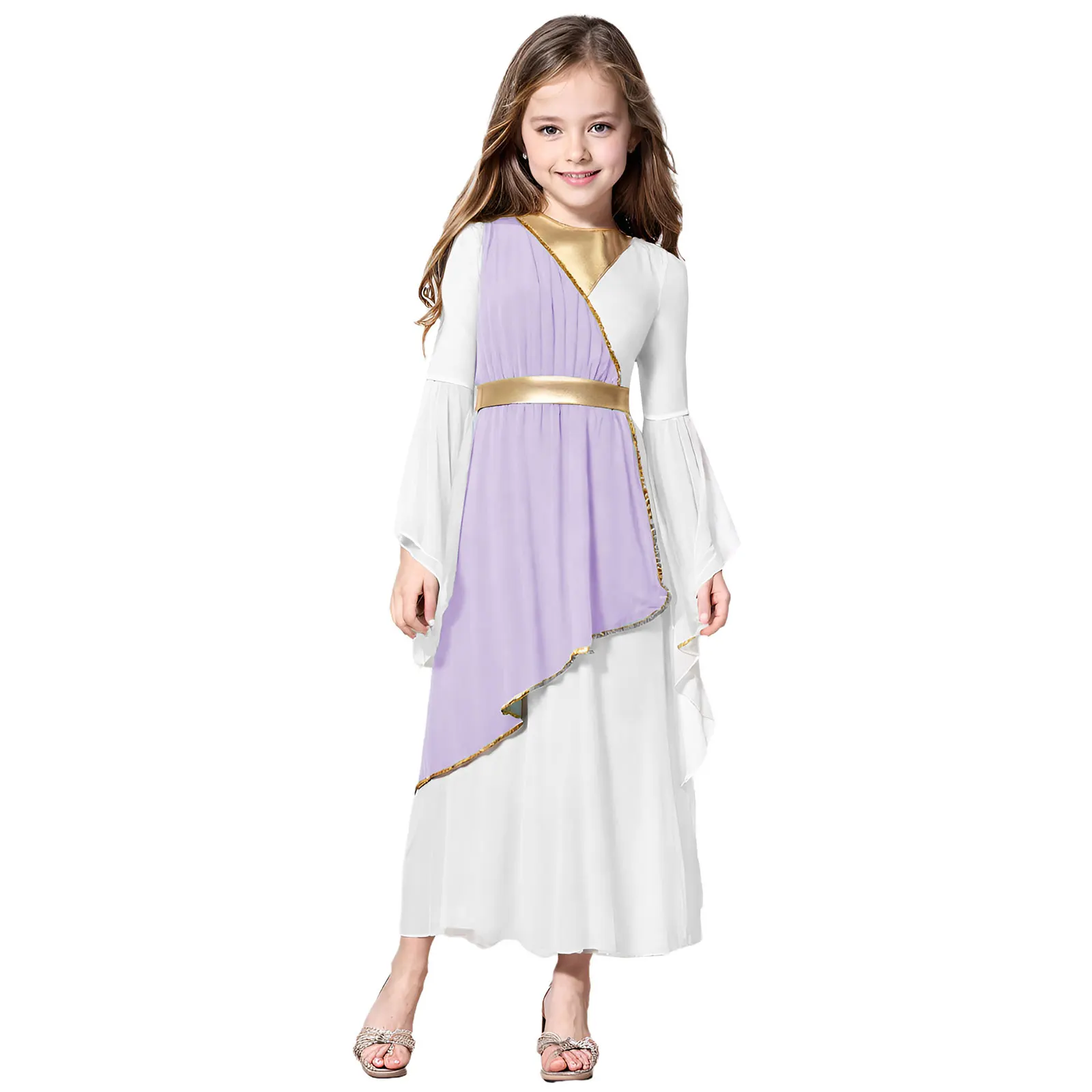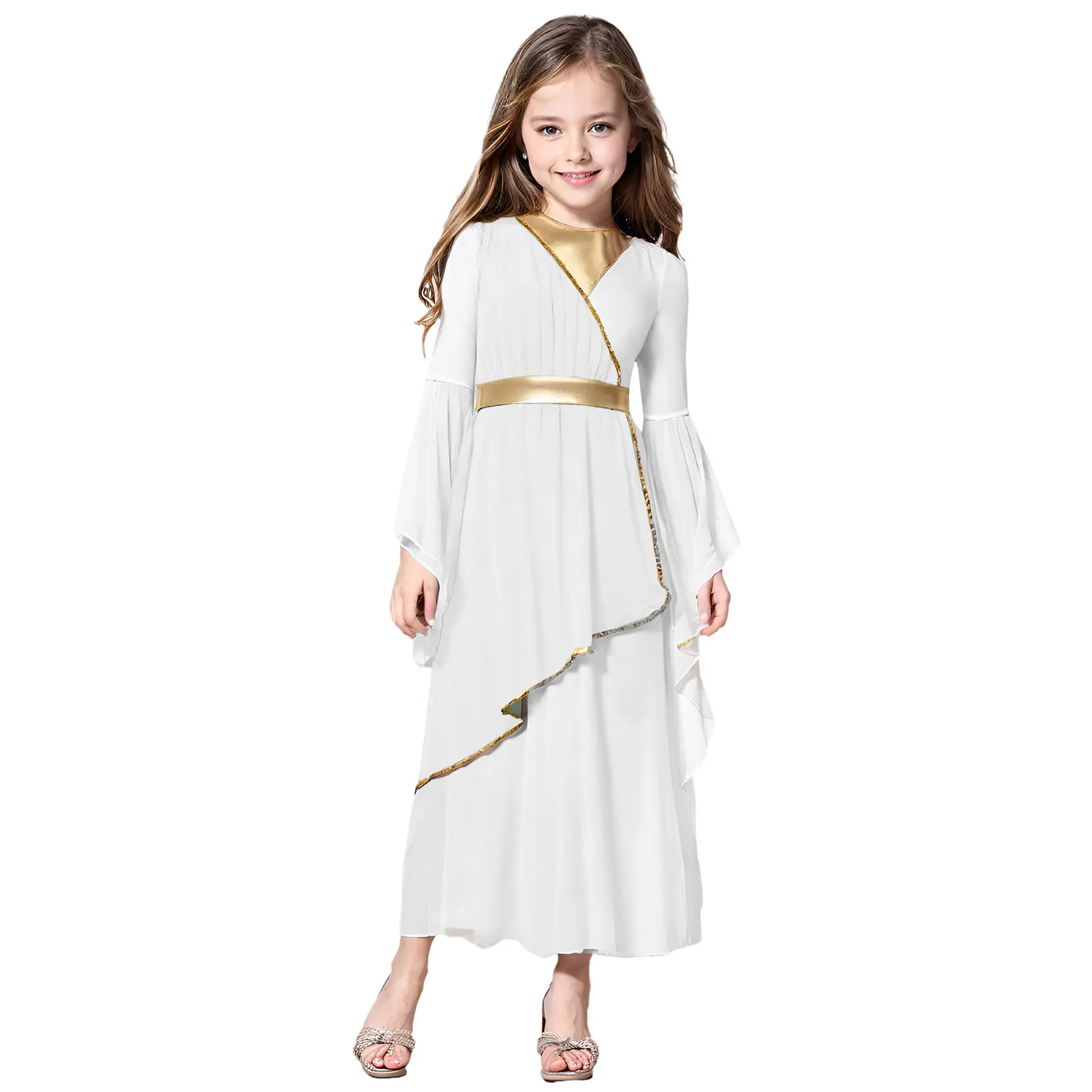 Girls Halloween Ancient Greek Princess Roman Toga Dress Cosplay Costume Long Sleeve Church Choir Robe Tunic Overlay Dress