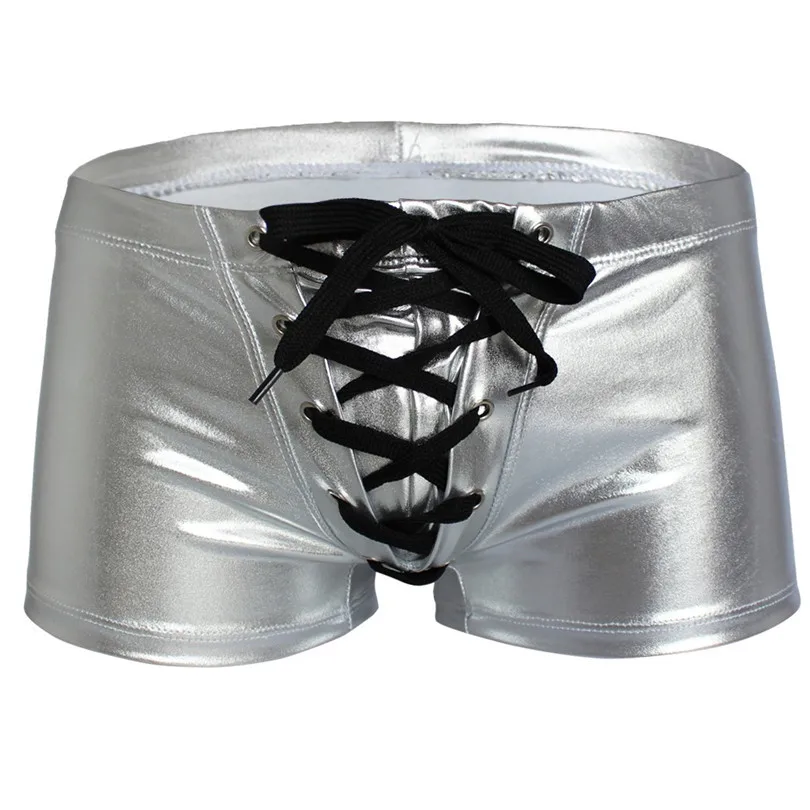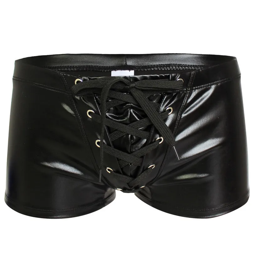 Hot Fashion Men Patent Leather Drawstring Boxer Briefs Swimwear Underwear Clubwear Performance Male Shiny Boxer Shorts Underpants