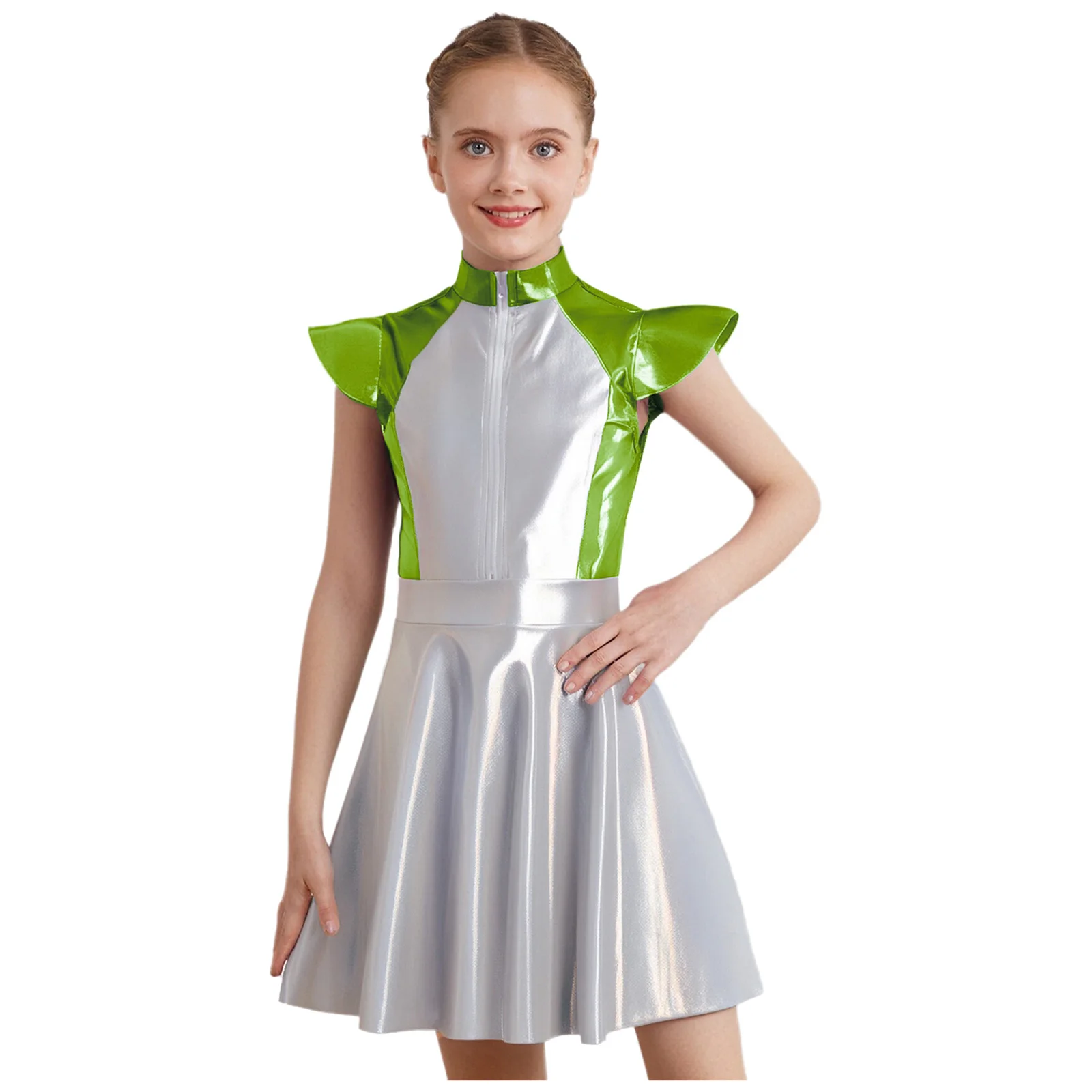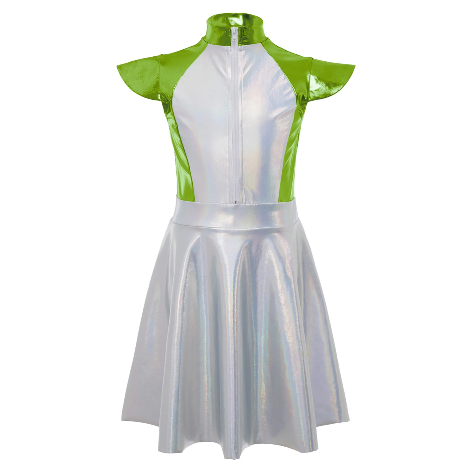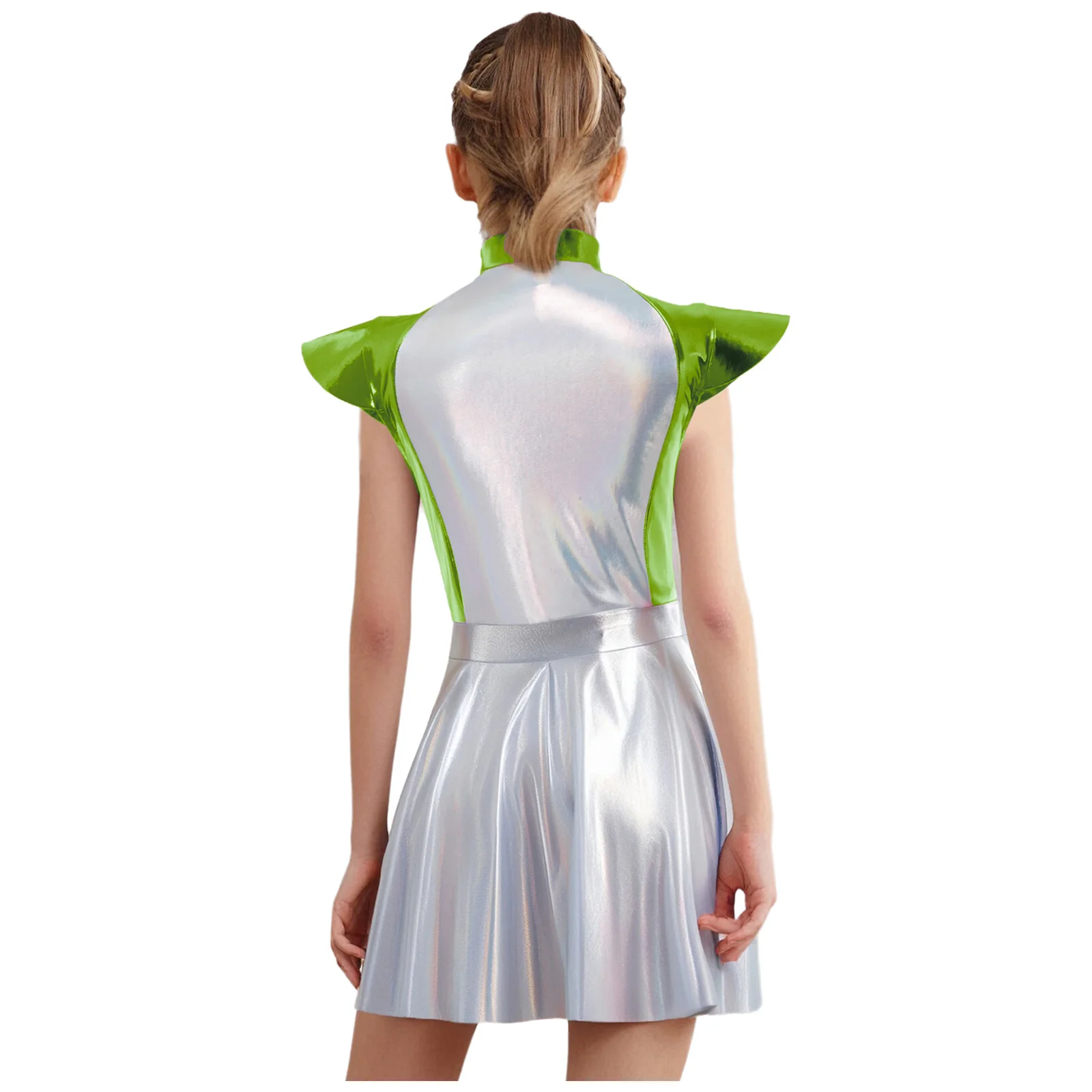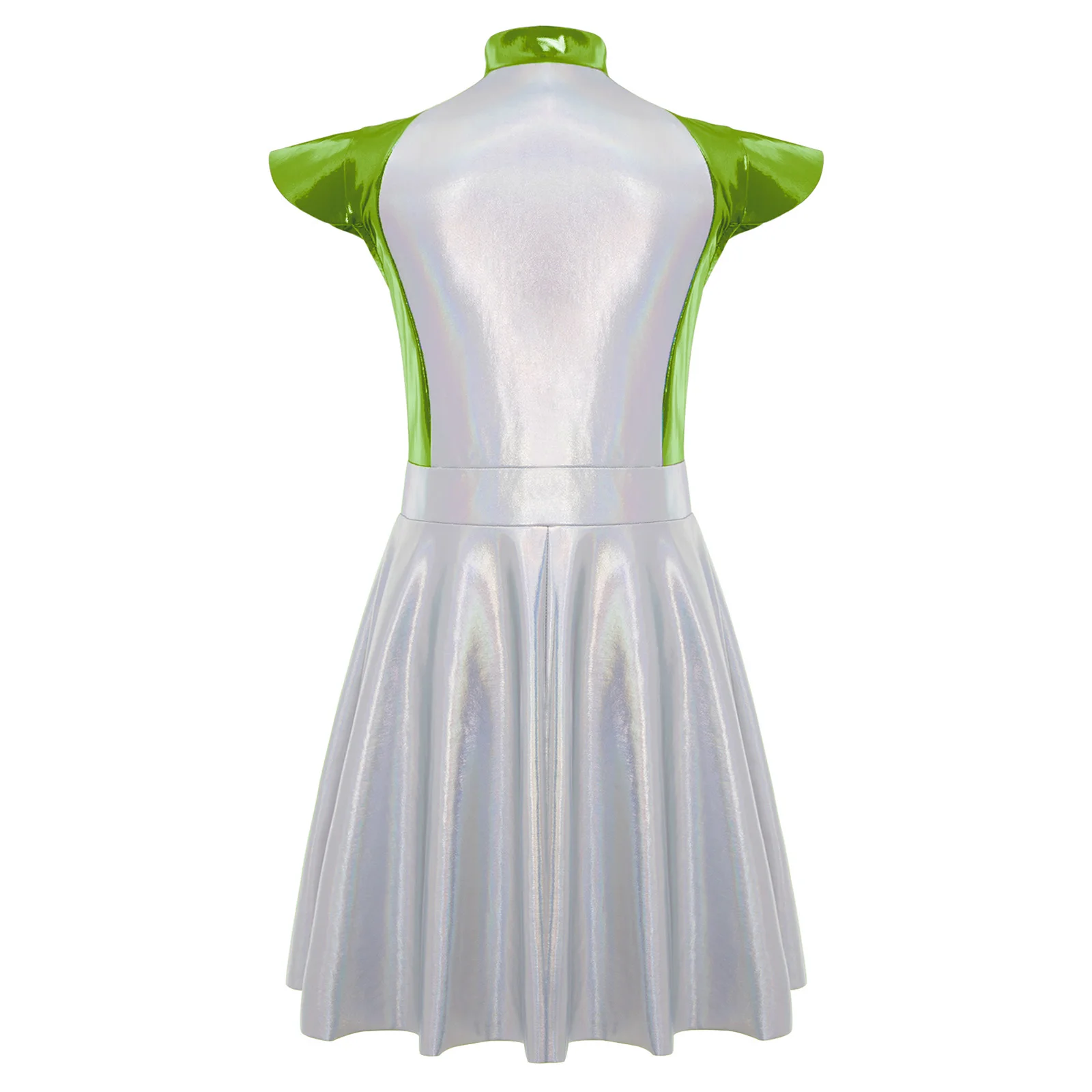 An Alien costume dress for girl, is designed with stand collar, cap sleeves, high wasit, flared a-line dress, front zipper closure.