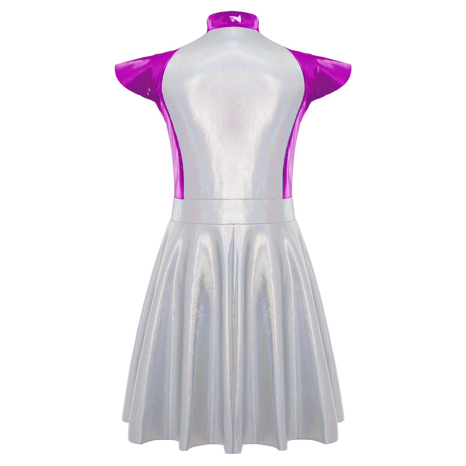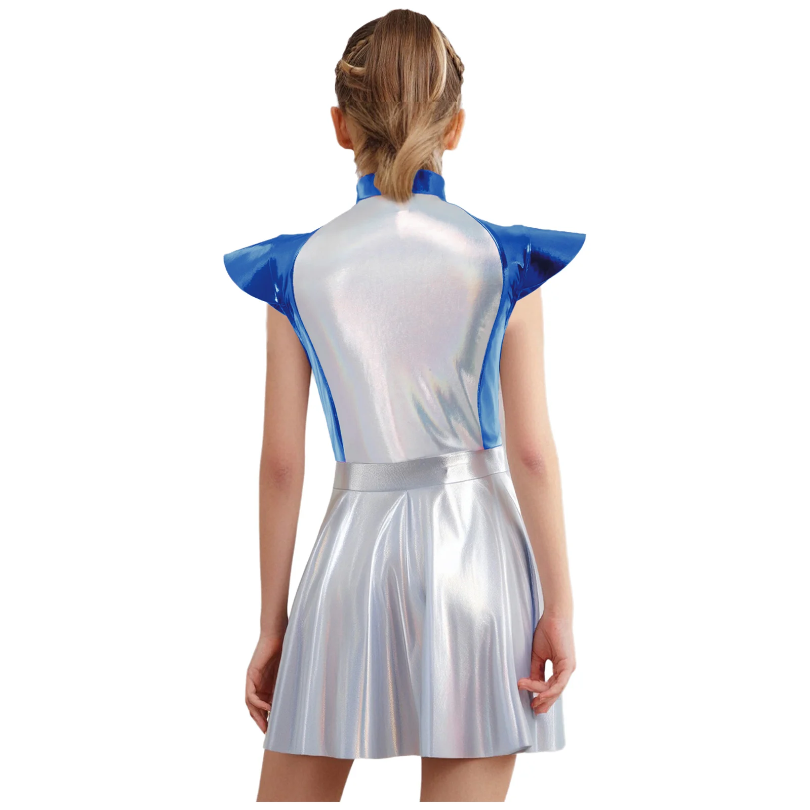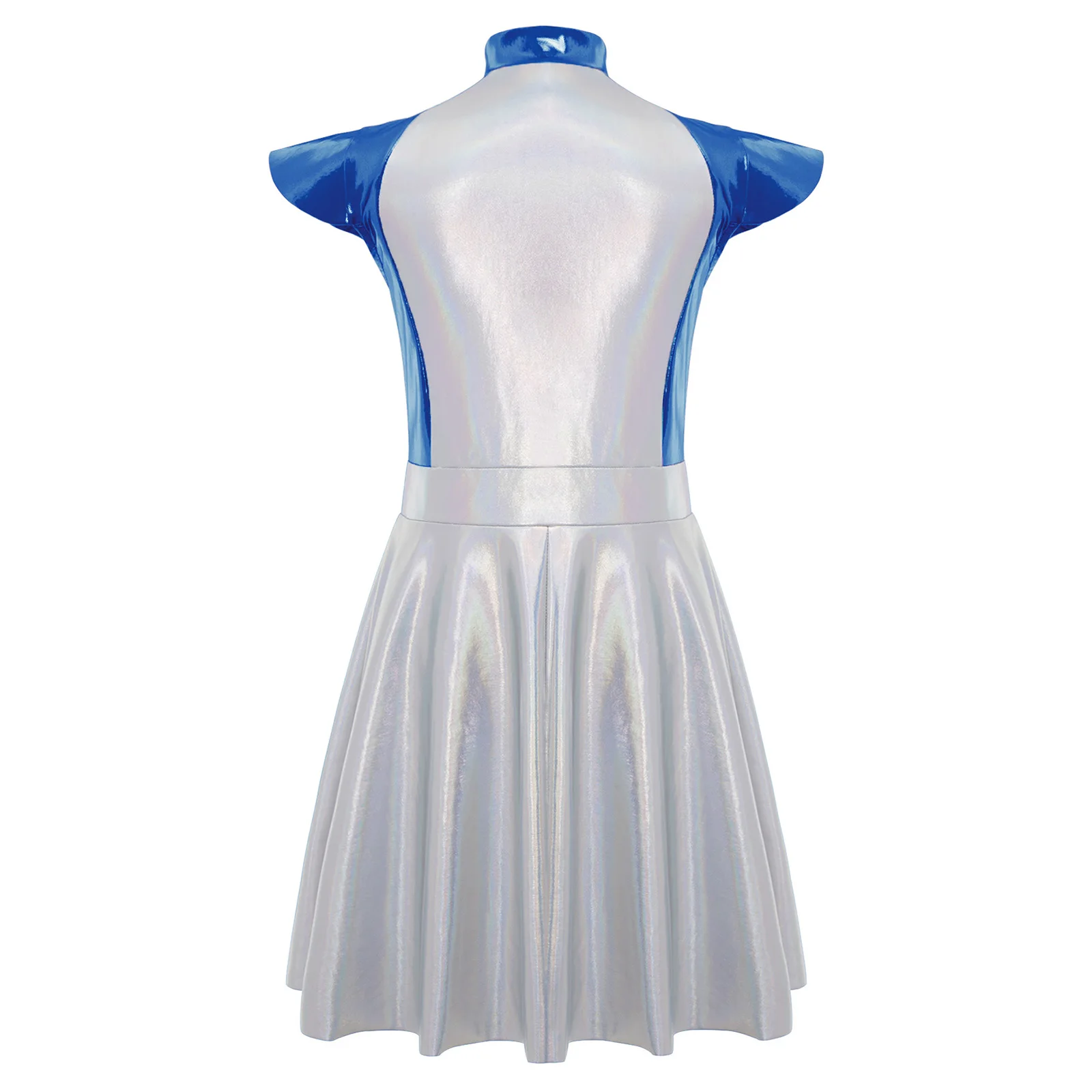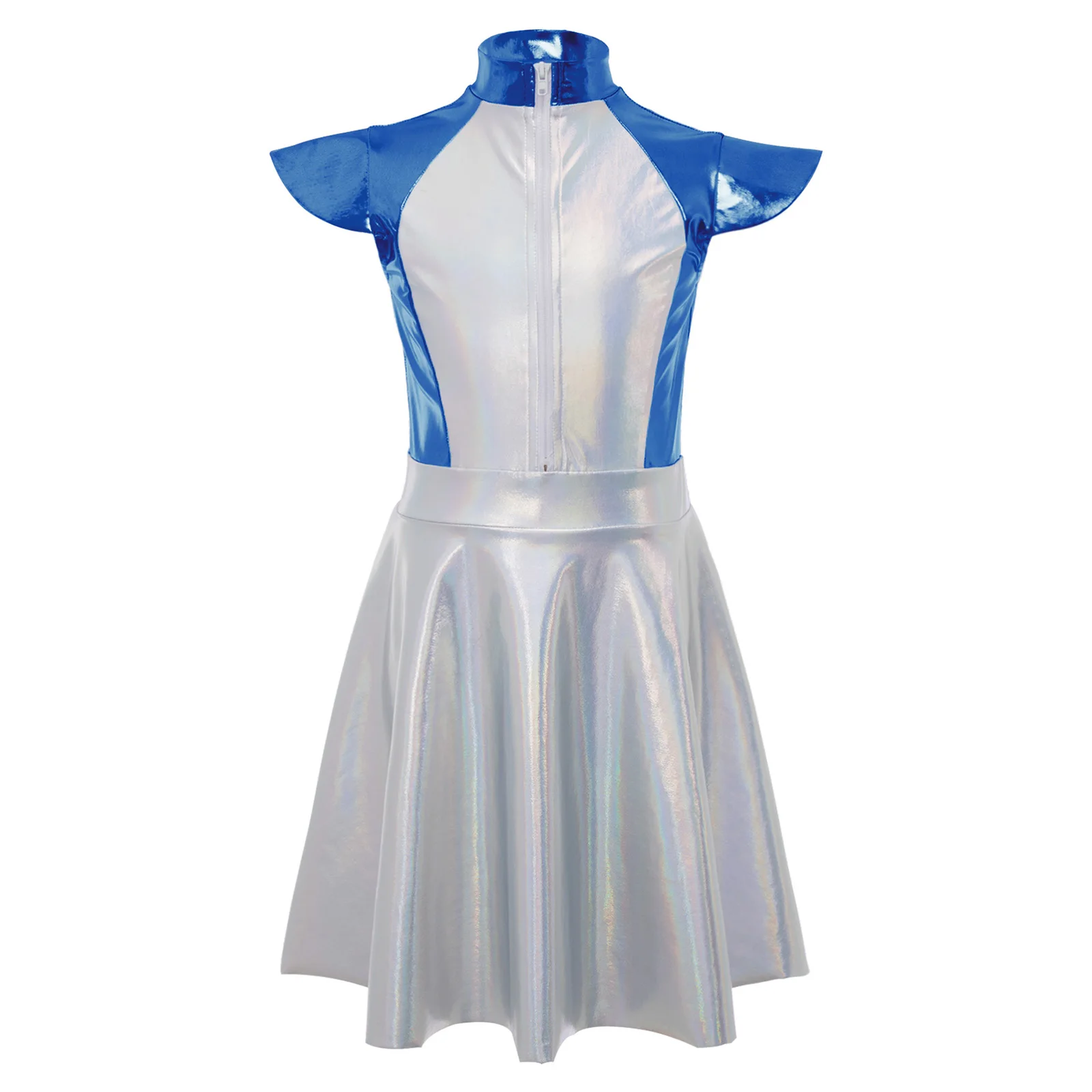An Alien costume dress for girl, is designed with stand collar, cap sleeves, high wasit, flared a-line dress, front zipper closure.