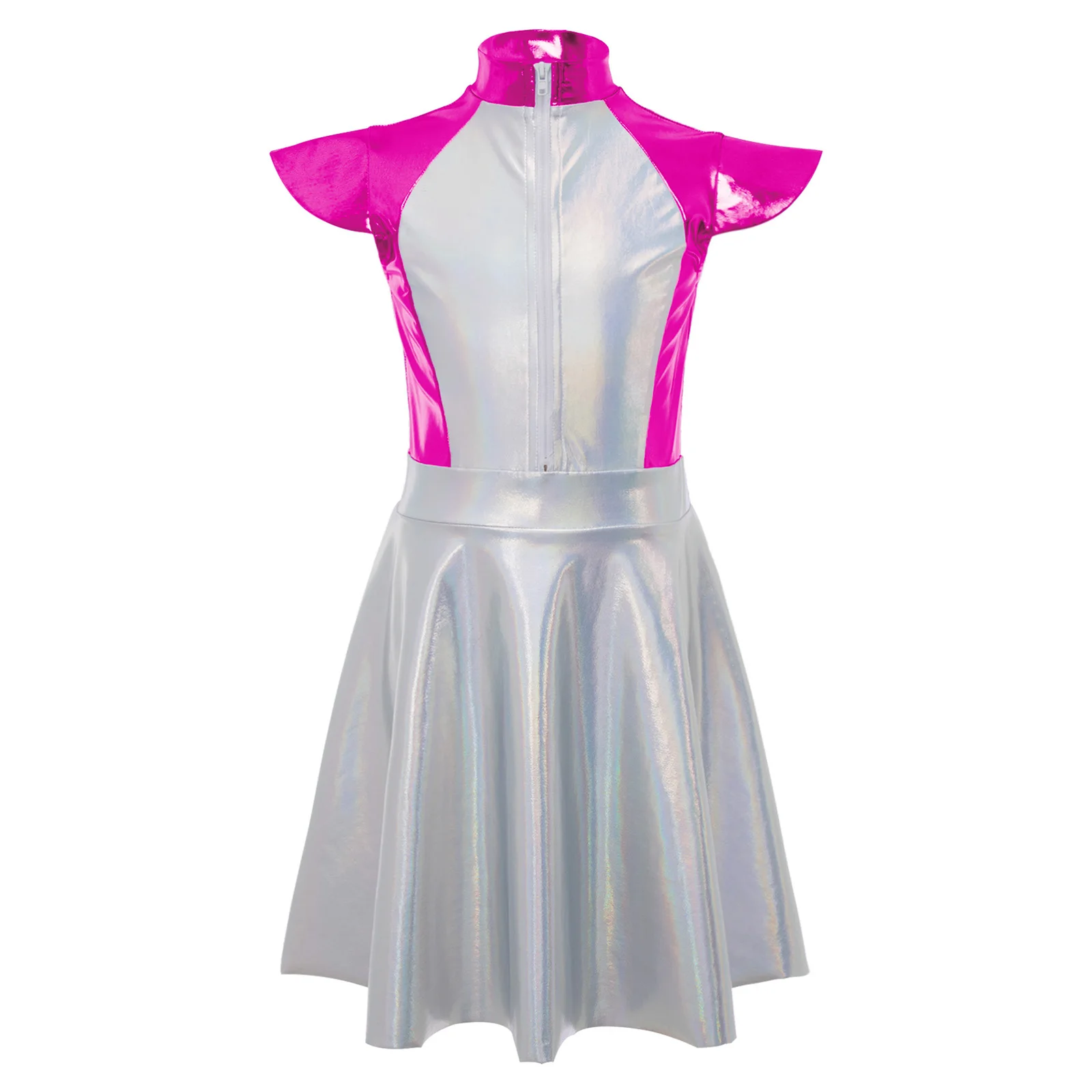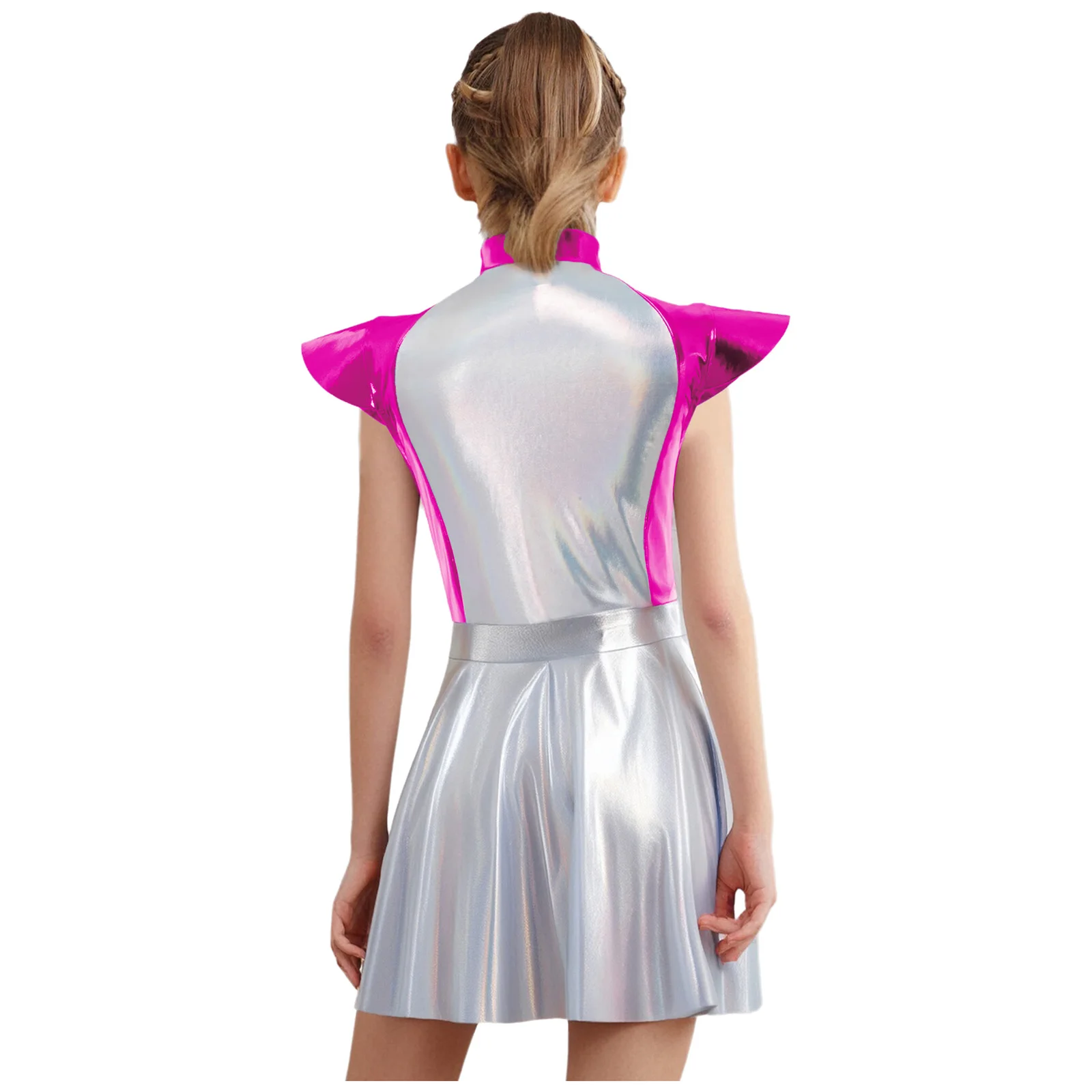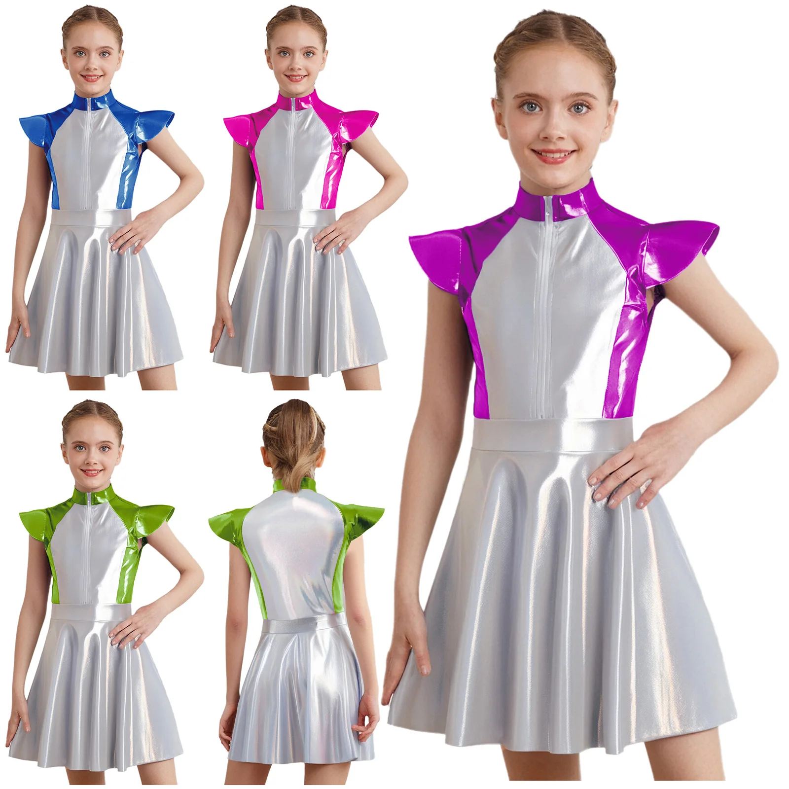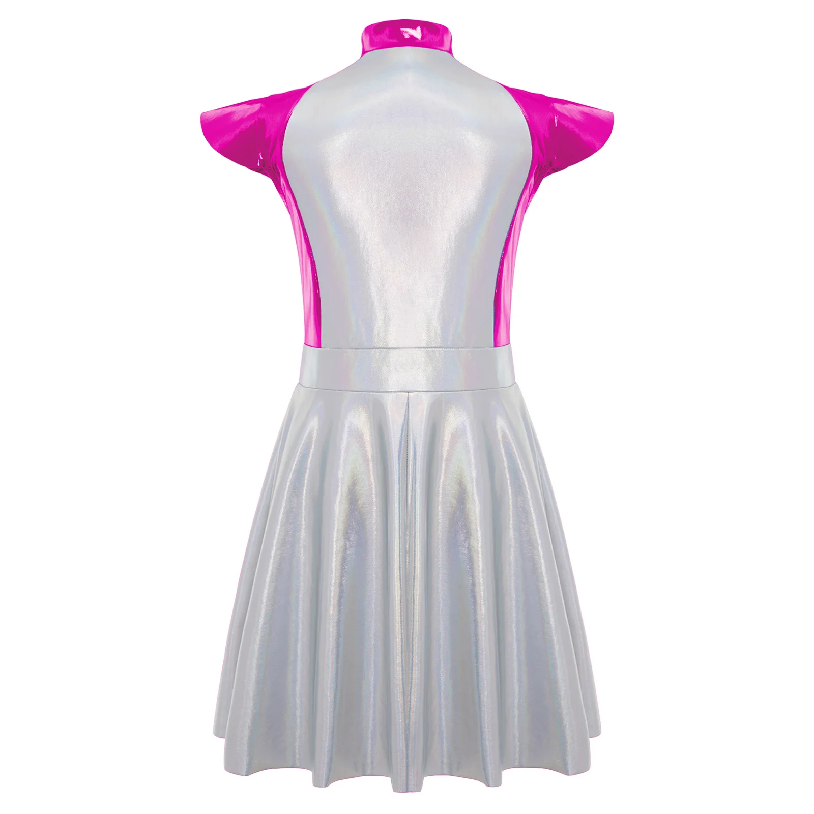 An Alien costume dress for girl, is designed with stand collar, cap sleeves, high wasit, flared a-line dress, front zipper closure.