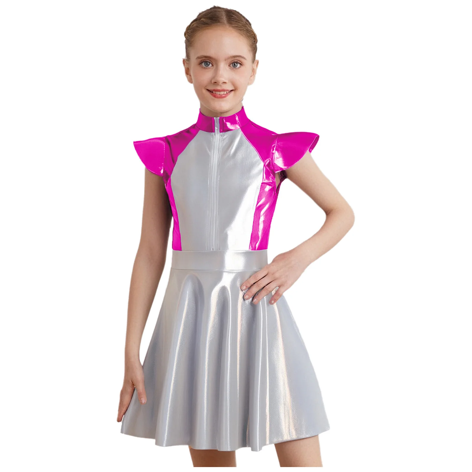 Made from a blend of polyester, PU, and spandex, the dress is stretchy and durable, providing a flexible and long-lasting fit for kids.