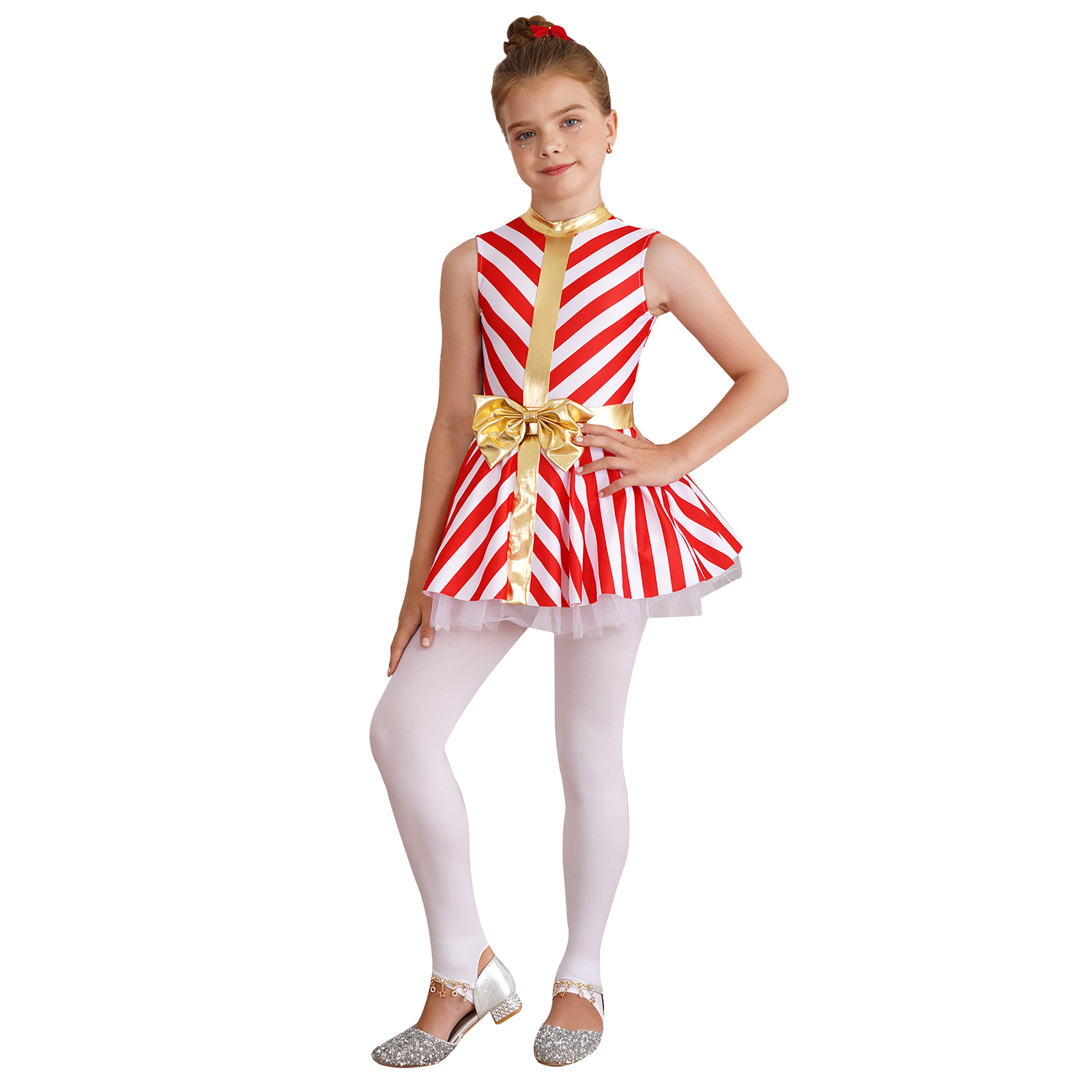 Girls Christmas striped tutu dress bodysuit for xmas parties dancing skating stage performance.