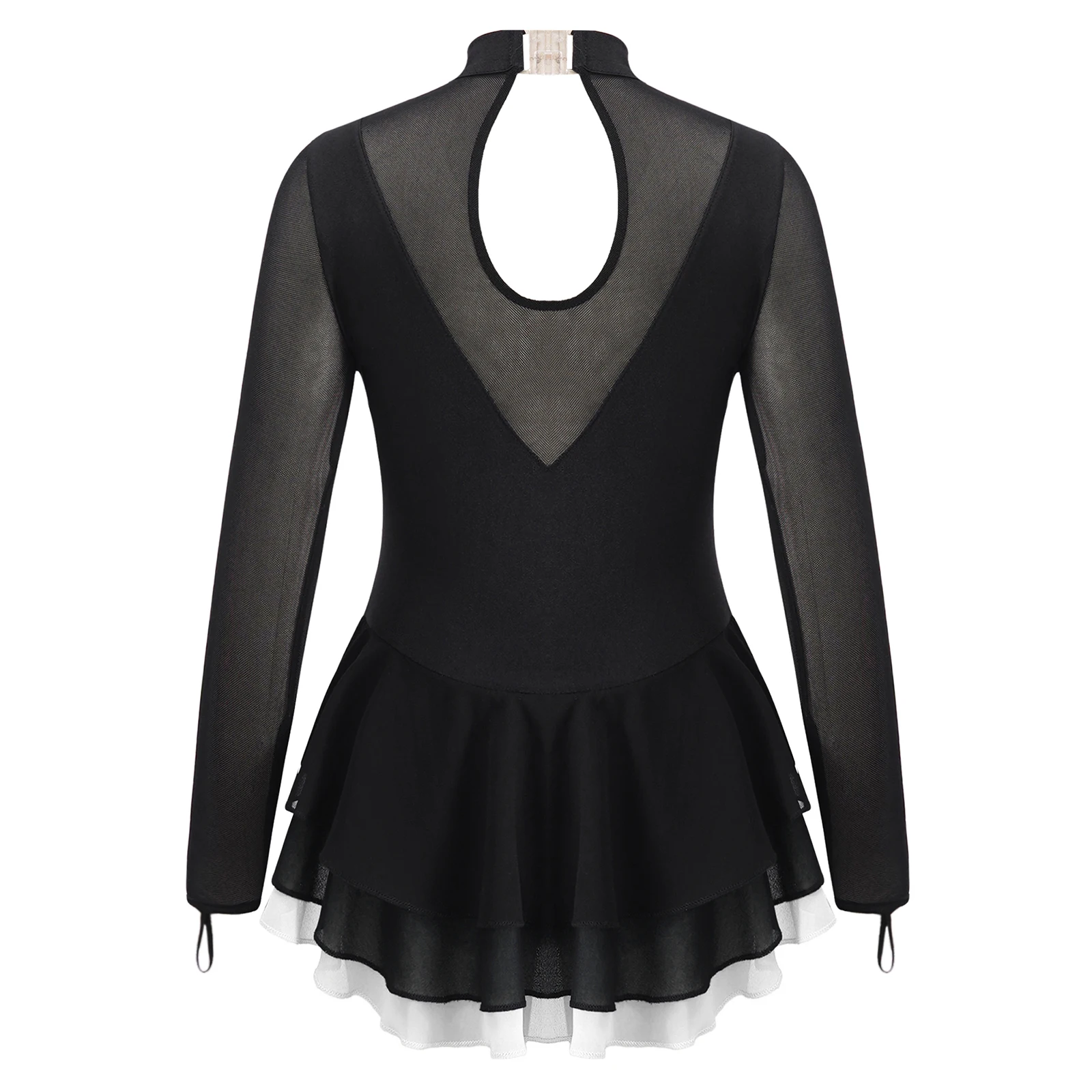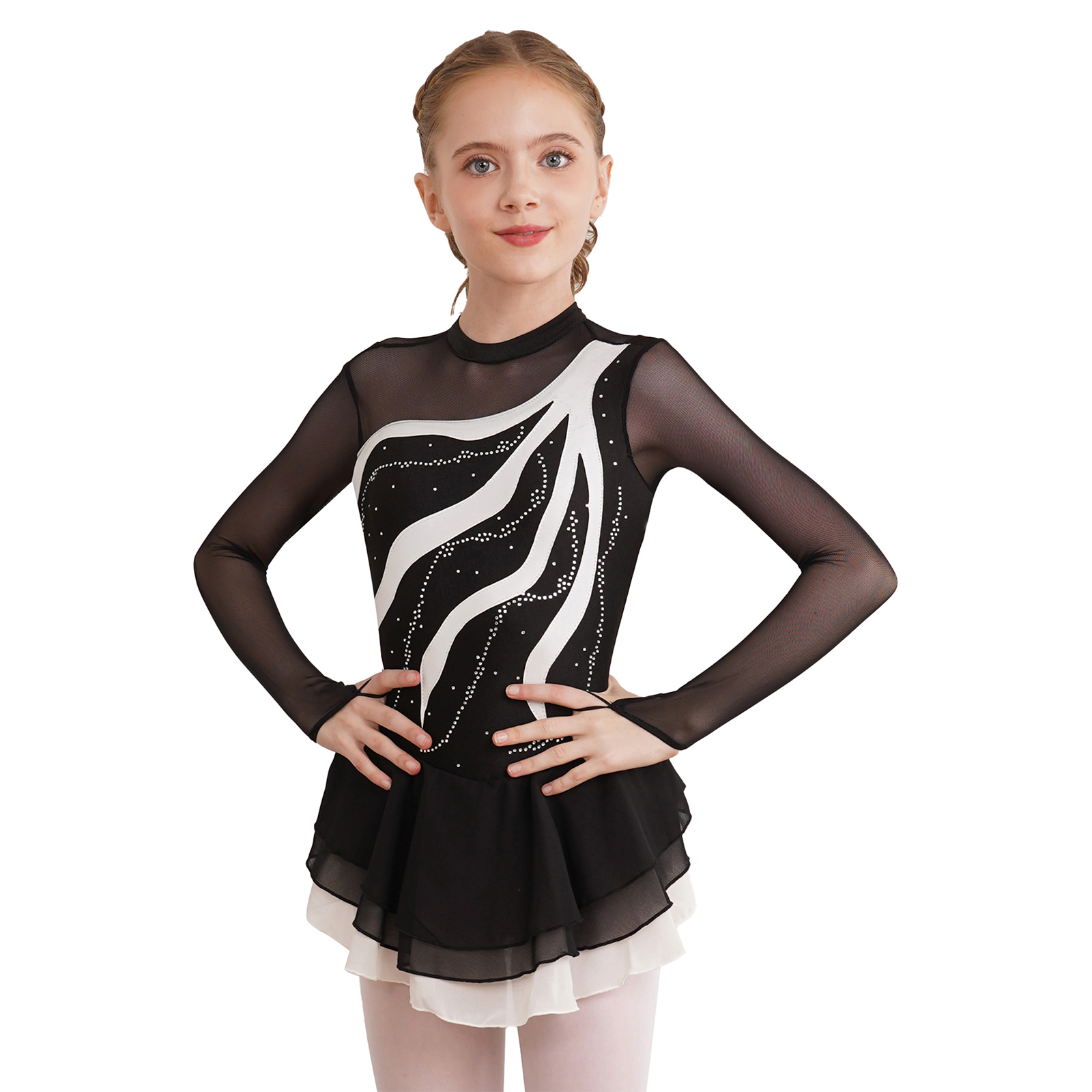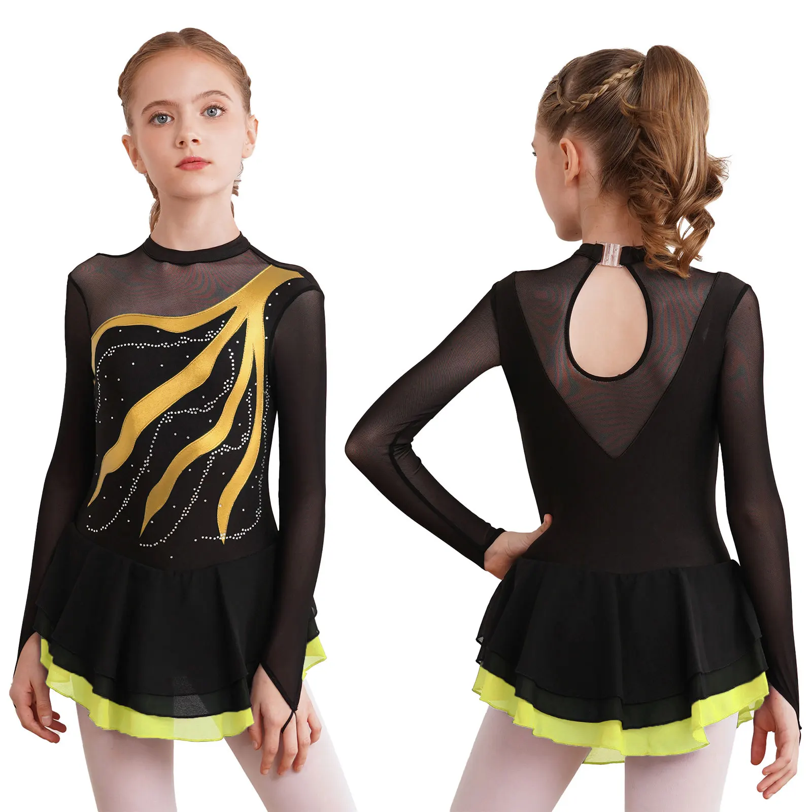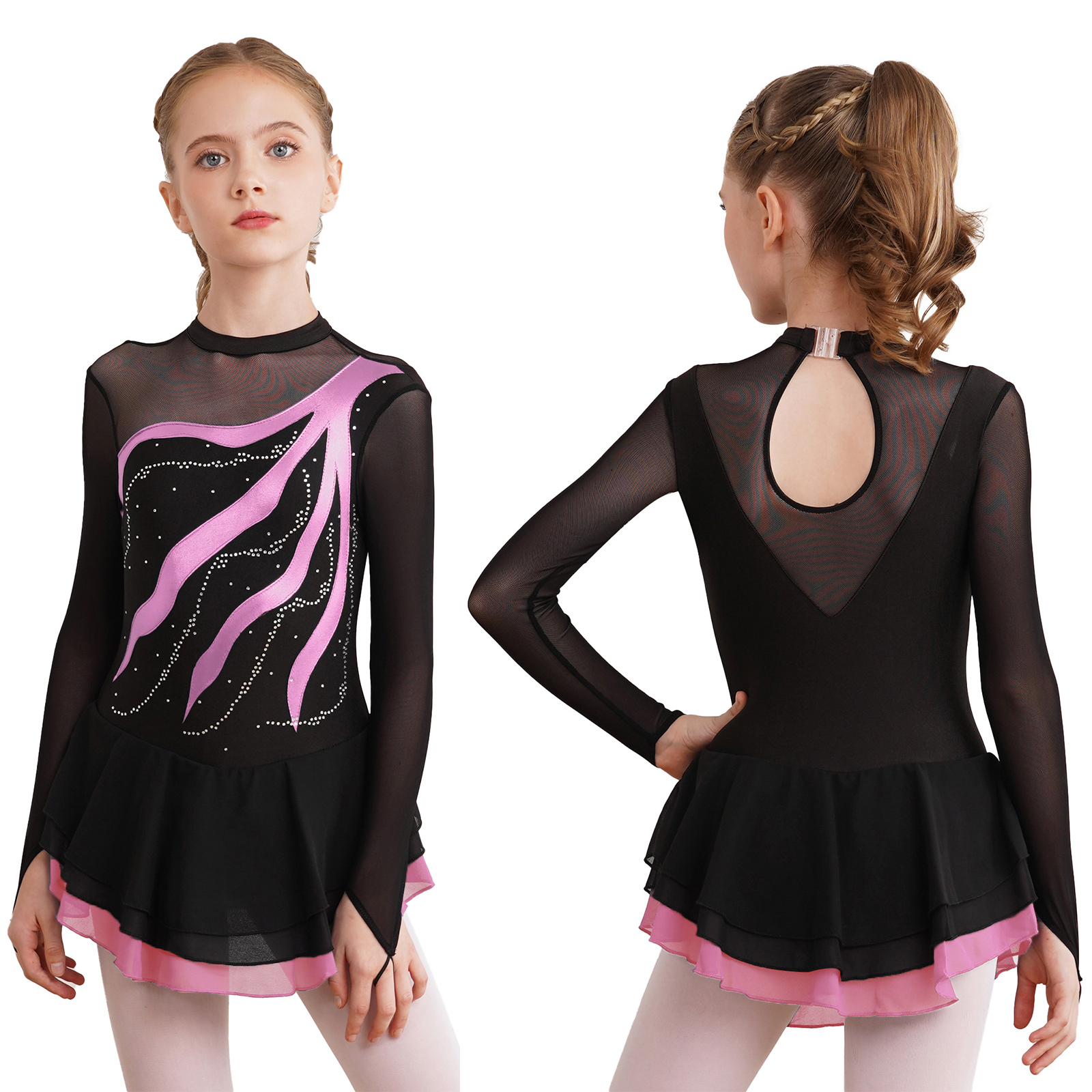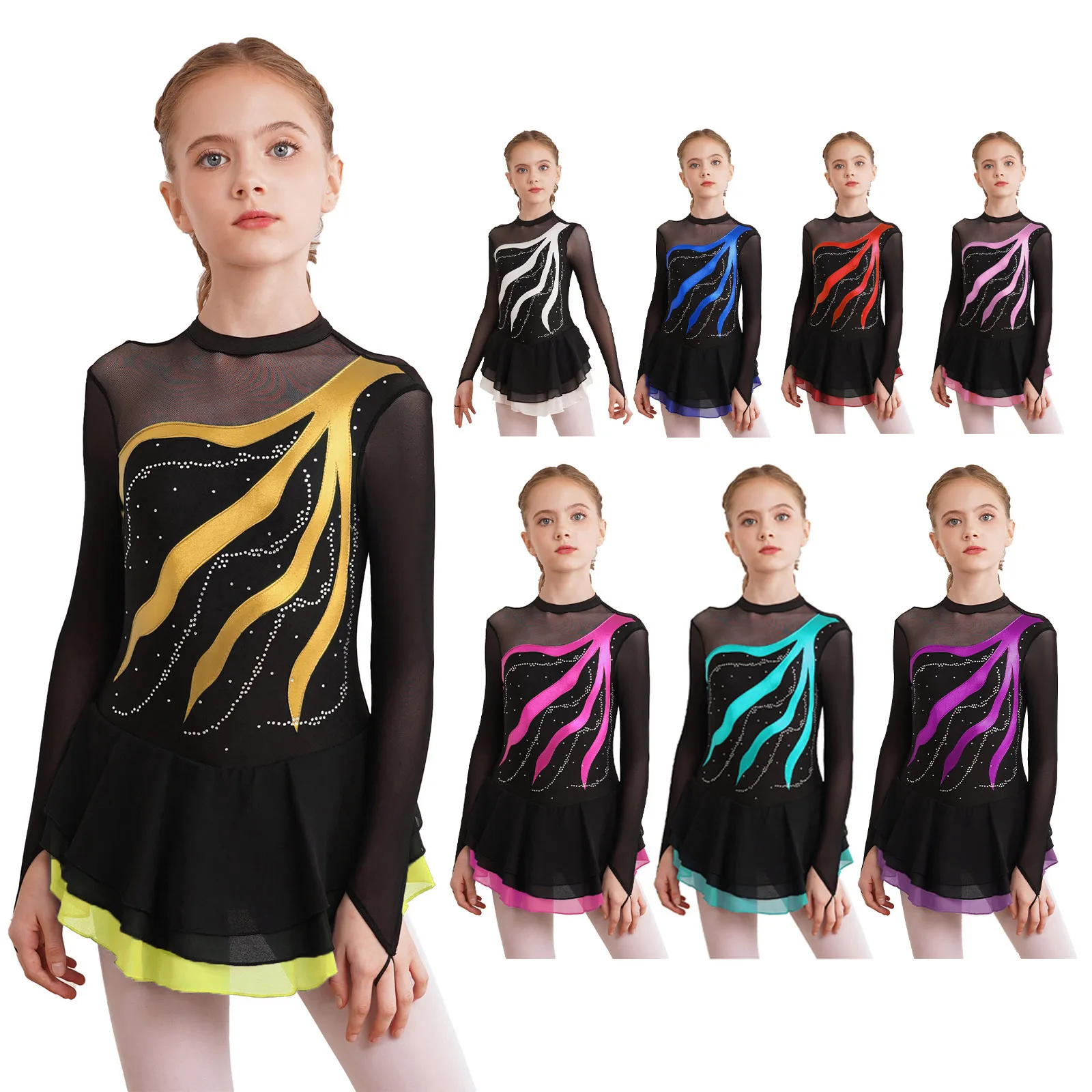 Kids Girls Gymnastics Leotards Artistic Figure Skating Performance Costume Shiny Rhinestone Ballet Jersey Lyrical Dance Dress