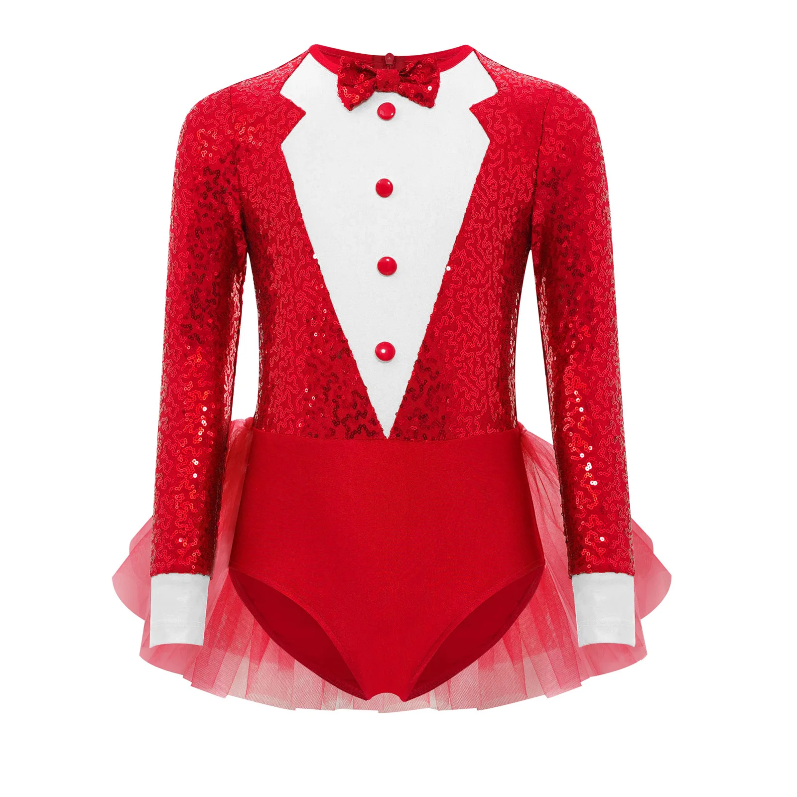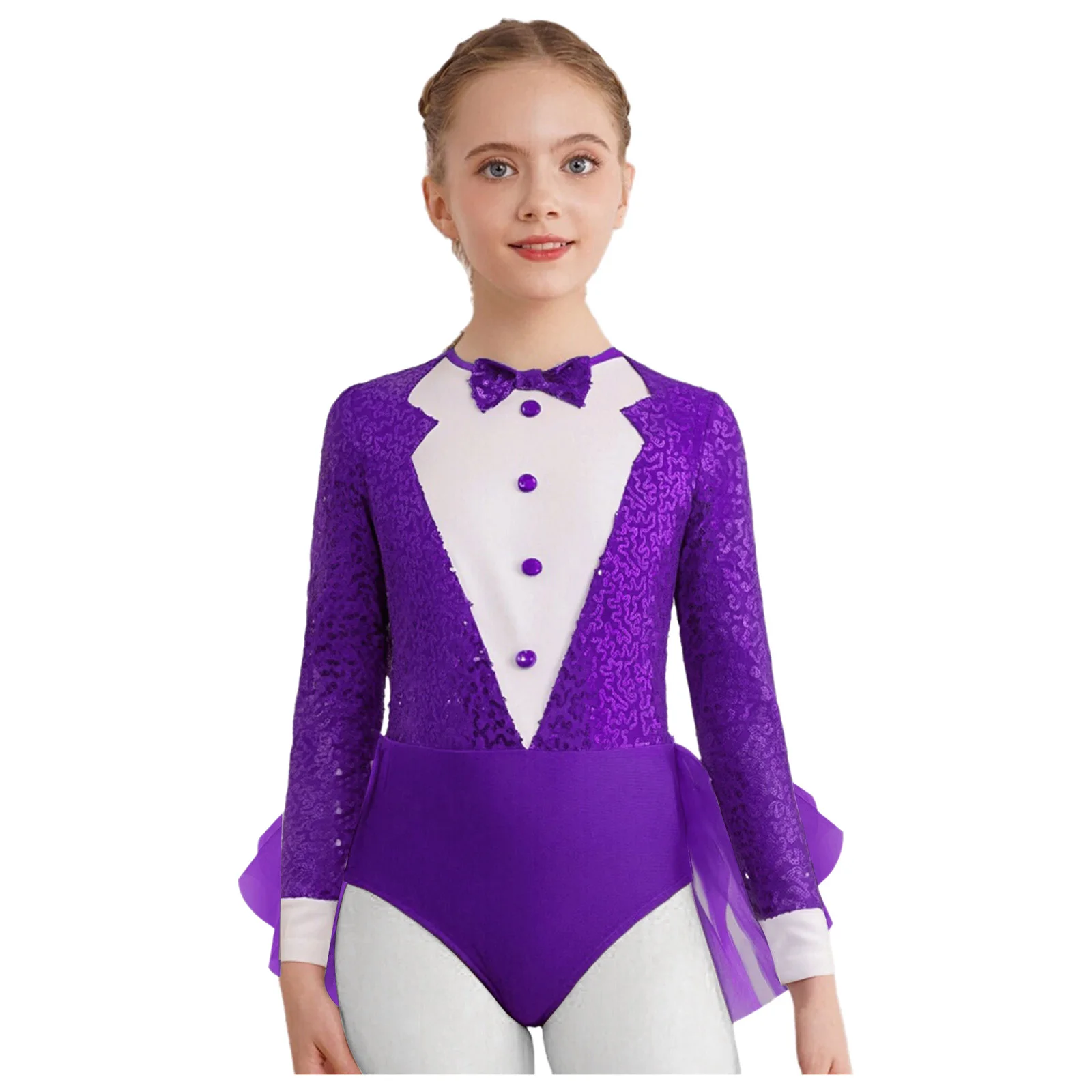 The sparkly sequins add a touch of glamour and make the leotard eye-catching, color block design with a sequin bow and decorative buttons.