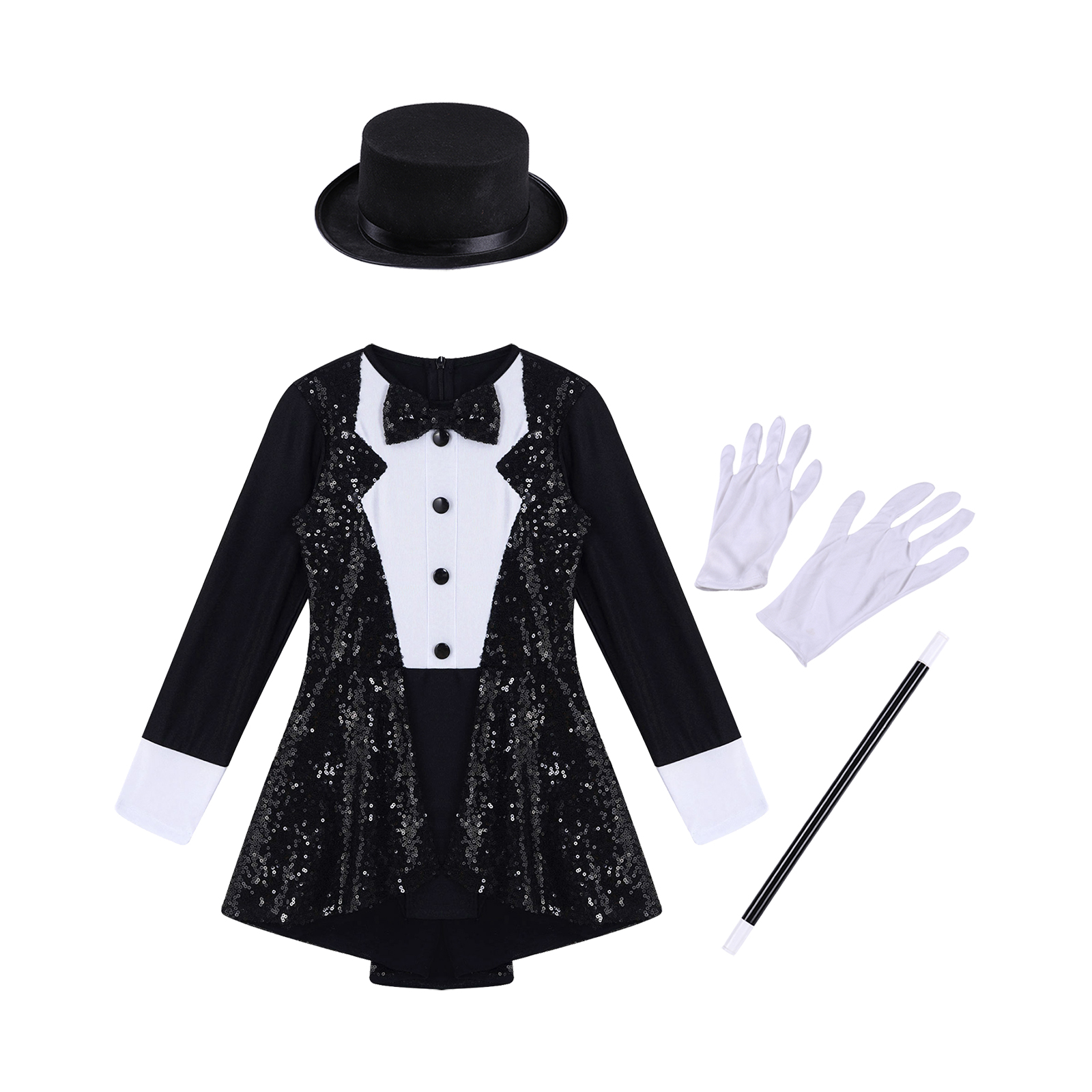 Kids Girls Magician Circus Ringmaster Cosplay Costume Shiny Bow Tie Sequin Adorned Ballet Leotard with Hem Hat Magic Wand Gloves