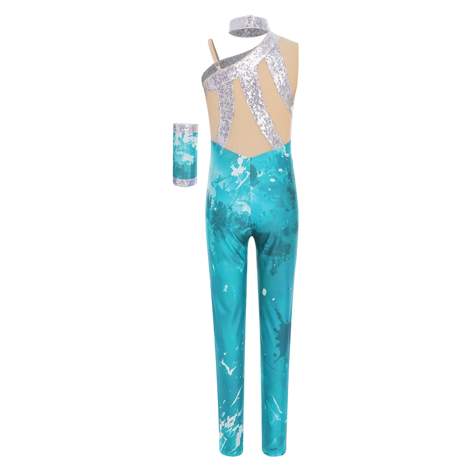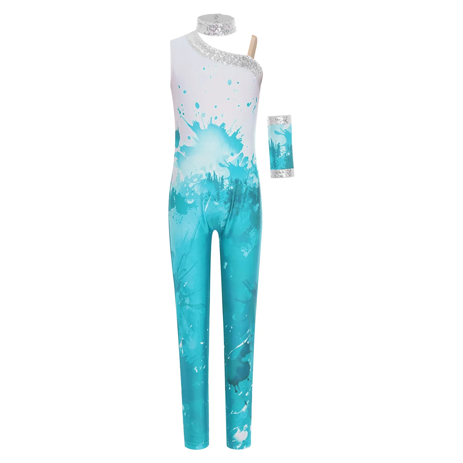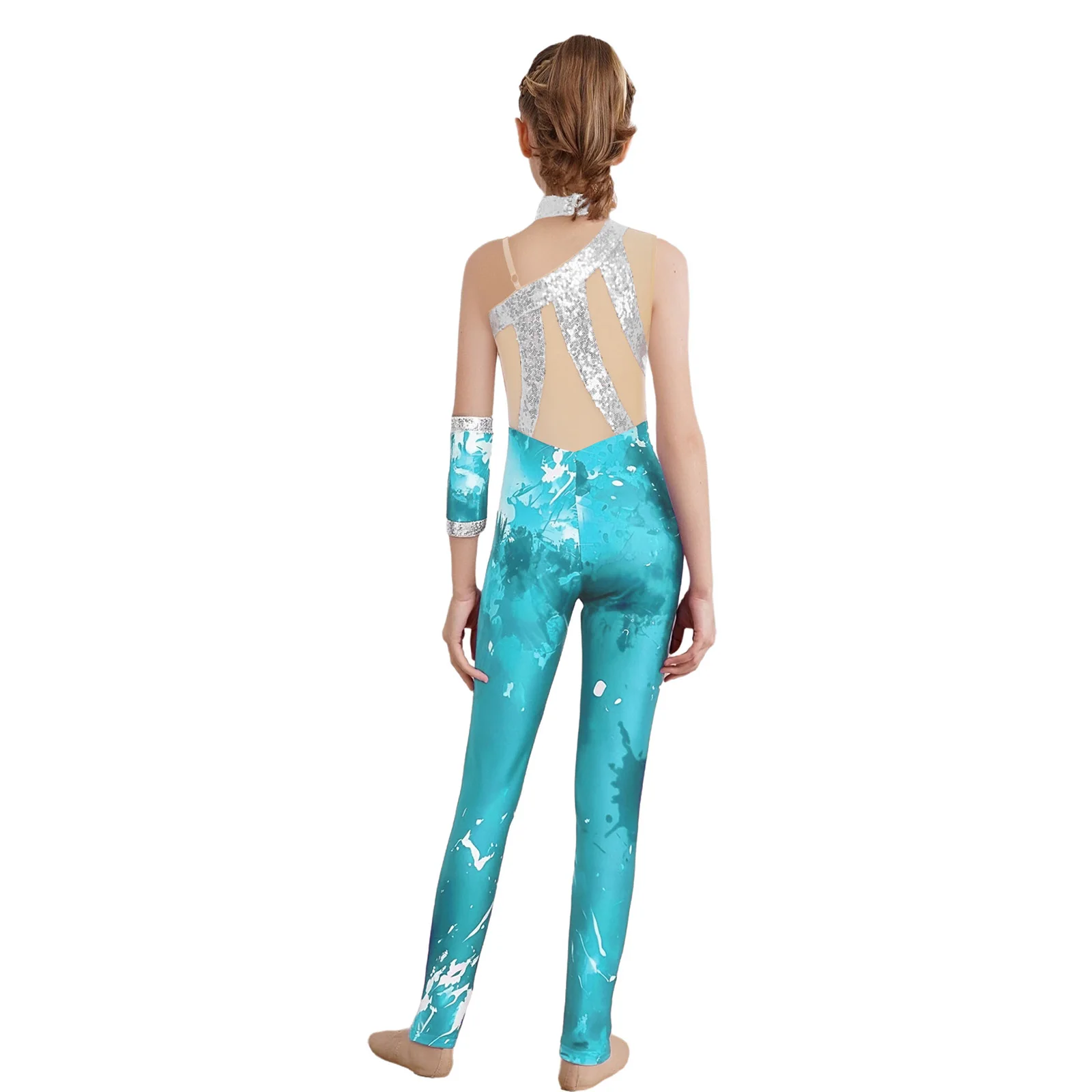 The sleeveless and asymmetrical bodysuit design is modern and stylish, presenting a fashionable look that is popular among young girls.