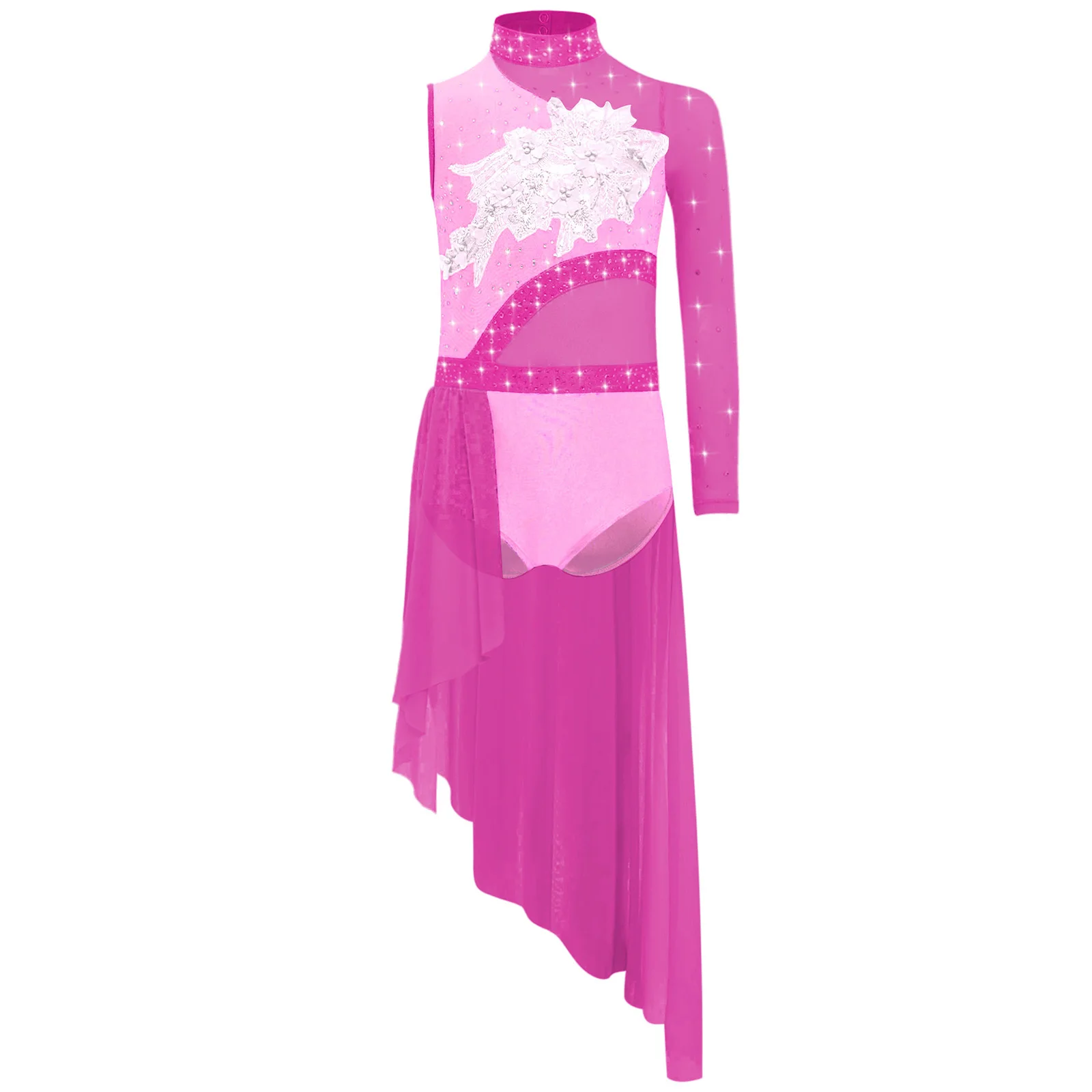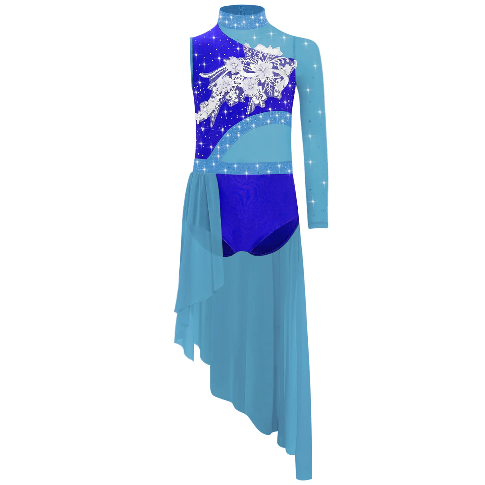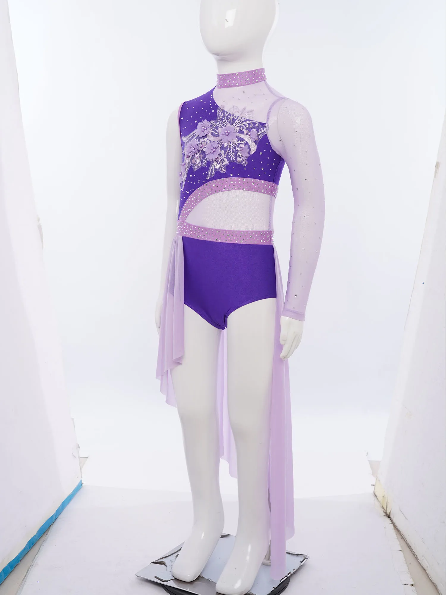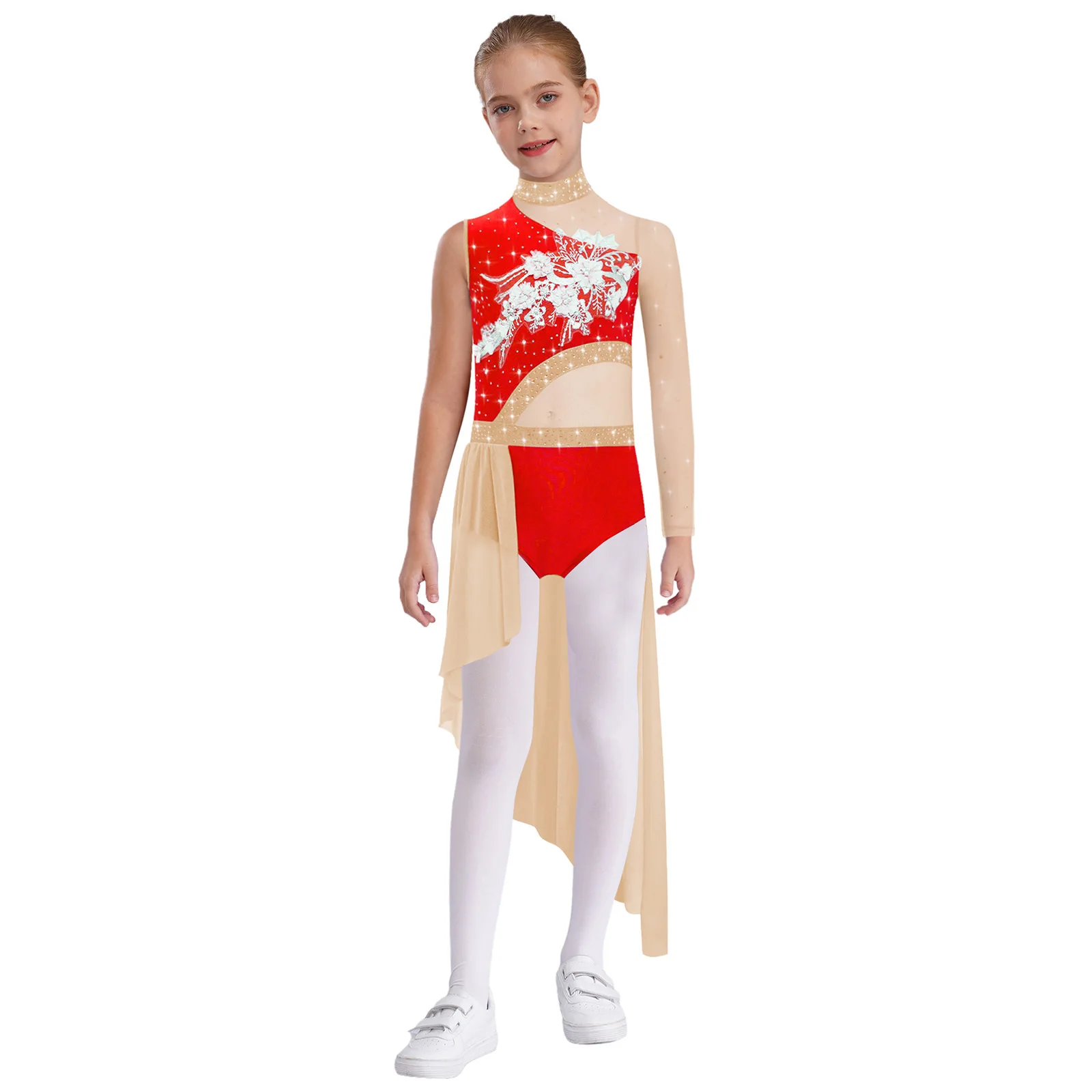 Kids Girls Rhythmic Gymnastics Skating Ballet Jersey Lyrical Ballroom Lyrical Dance Costume Rhinestone Flower Overlay Dress