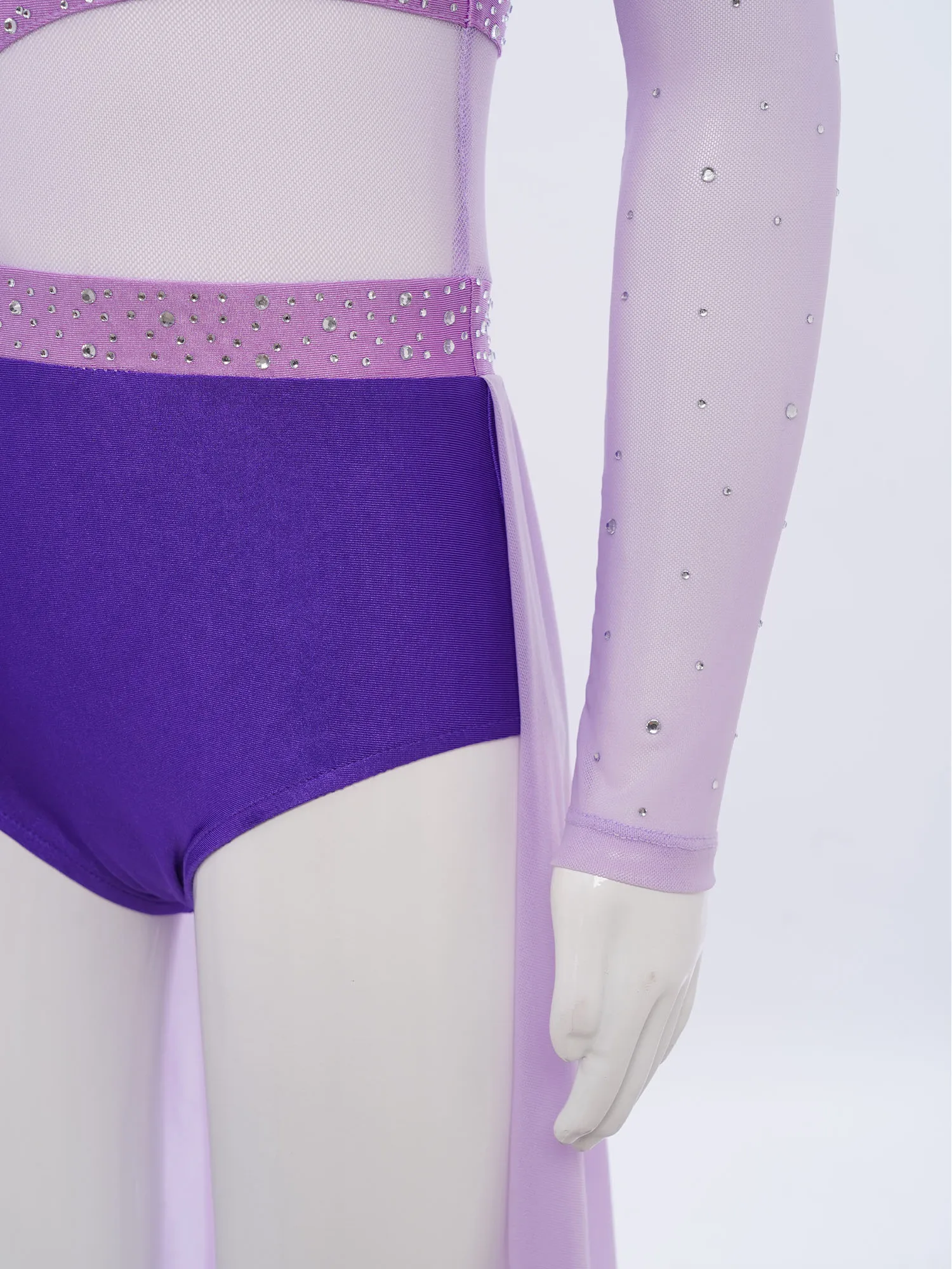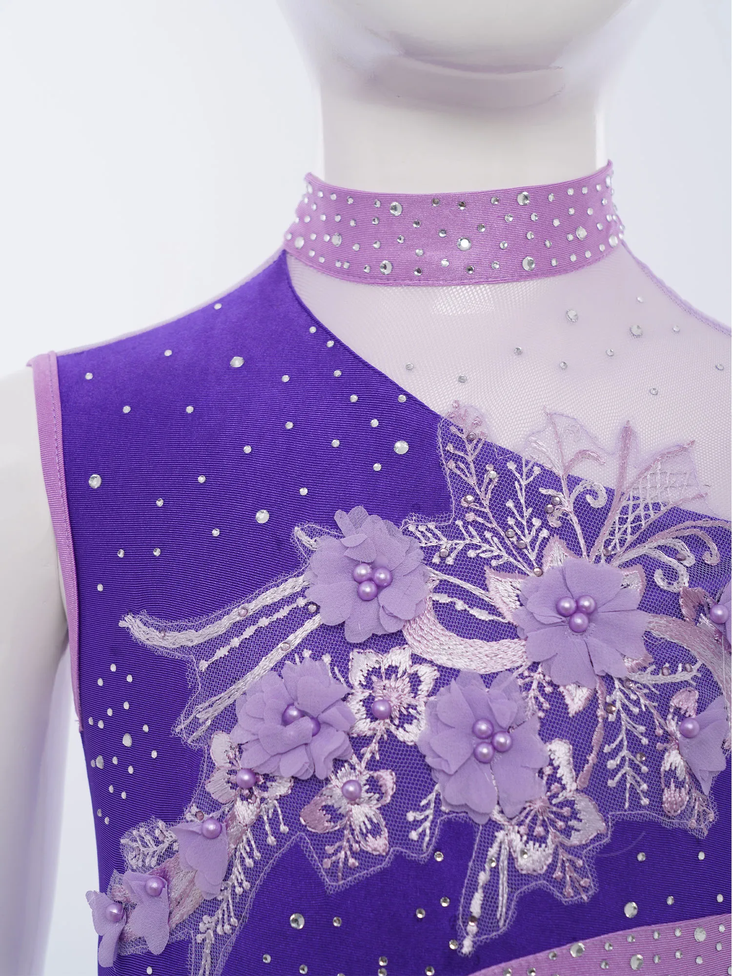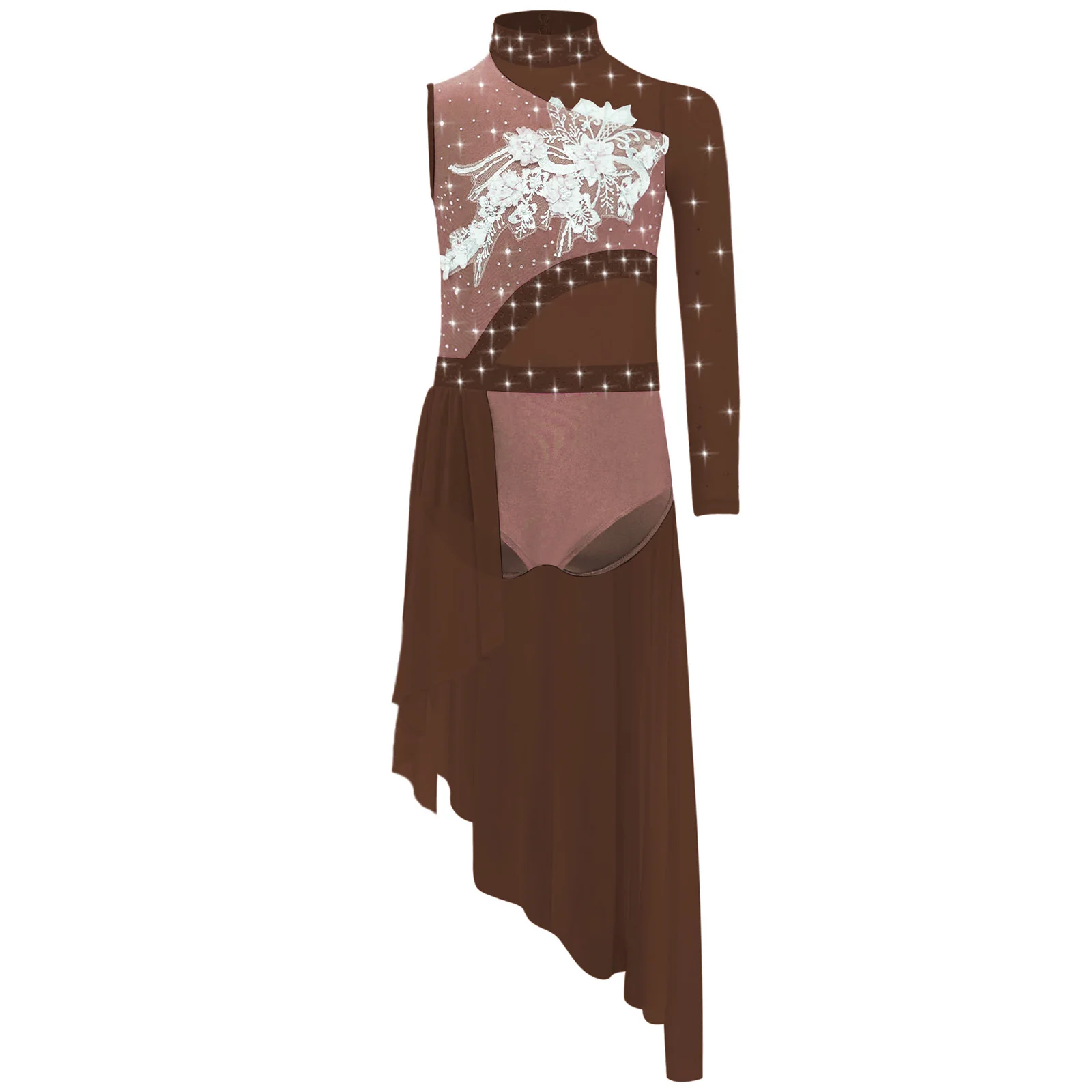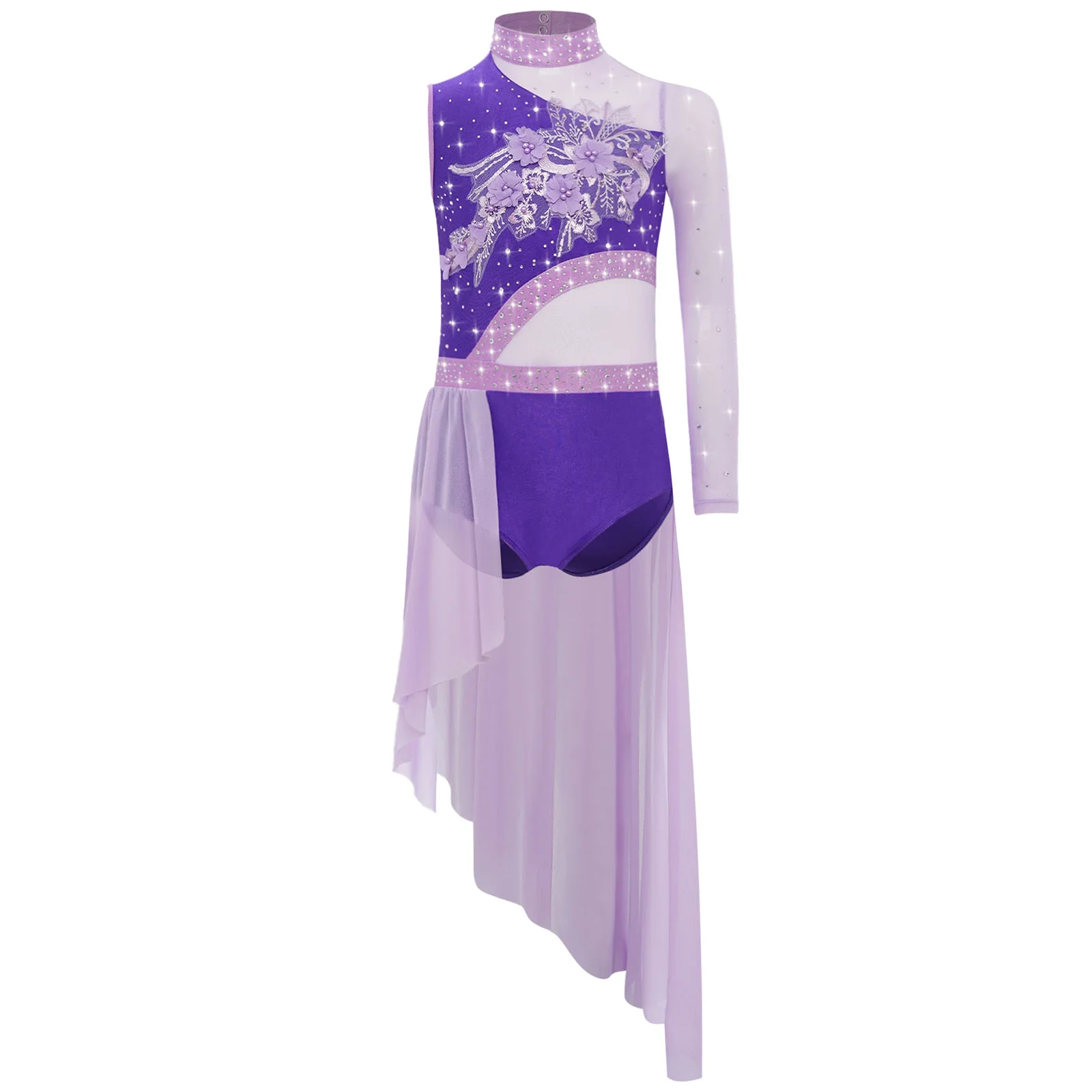 Kids Girls Rhythmic Gymnastics Skating Ballet Jersey Lyrical Ballroom Lyrical Dance Costume Rhinestone Flower Overlay Dress