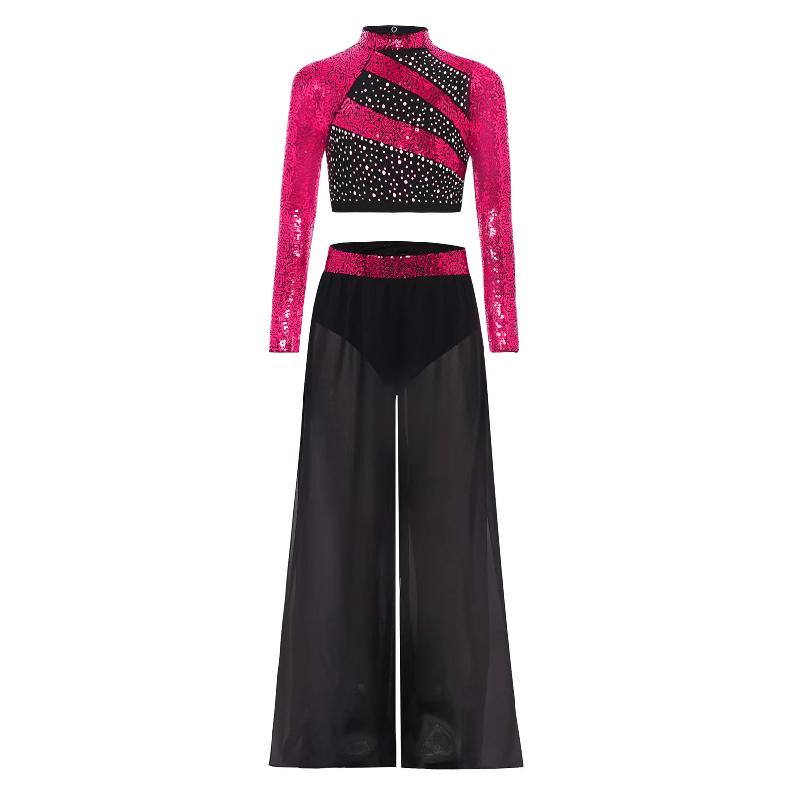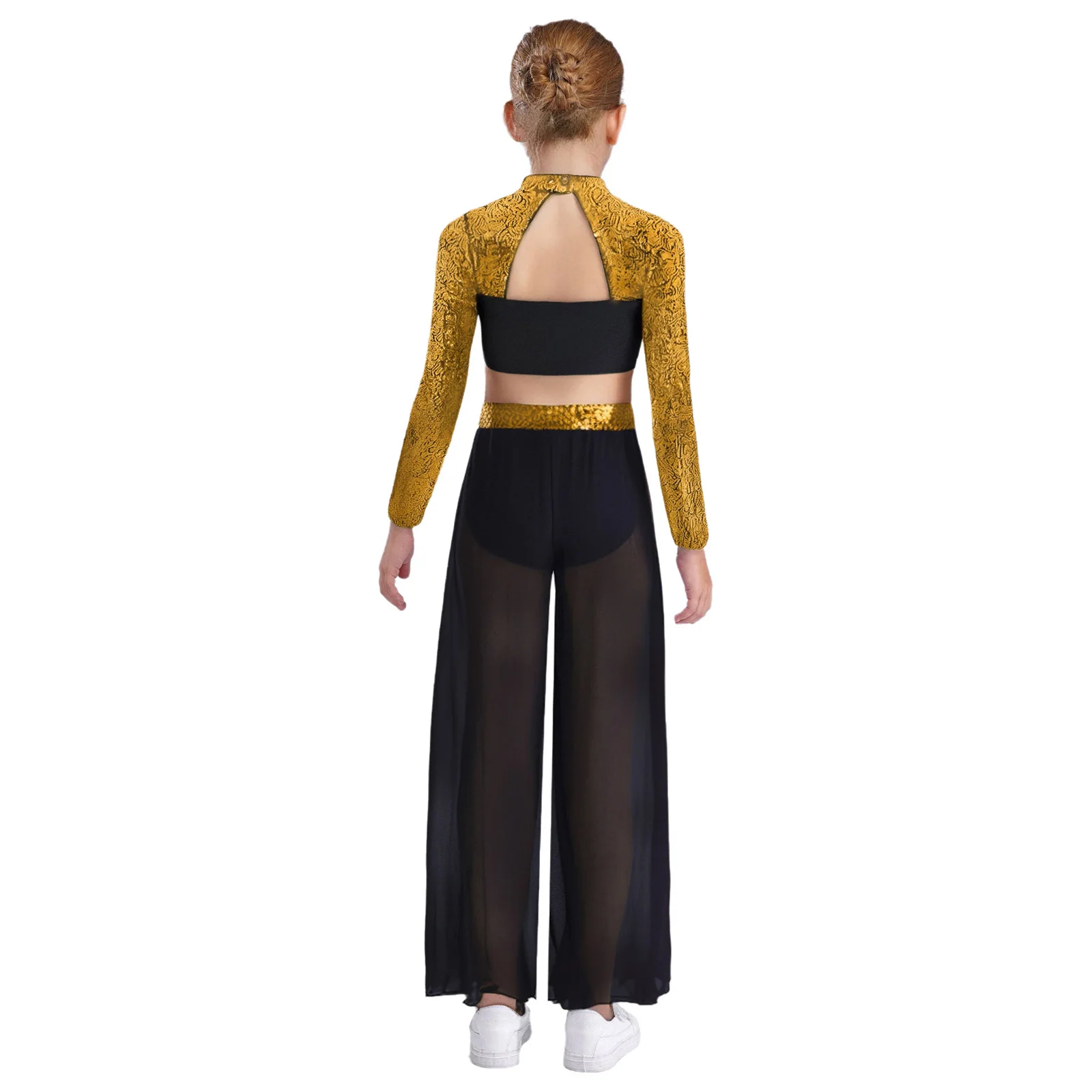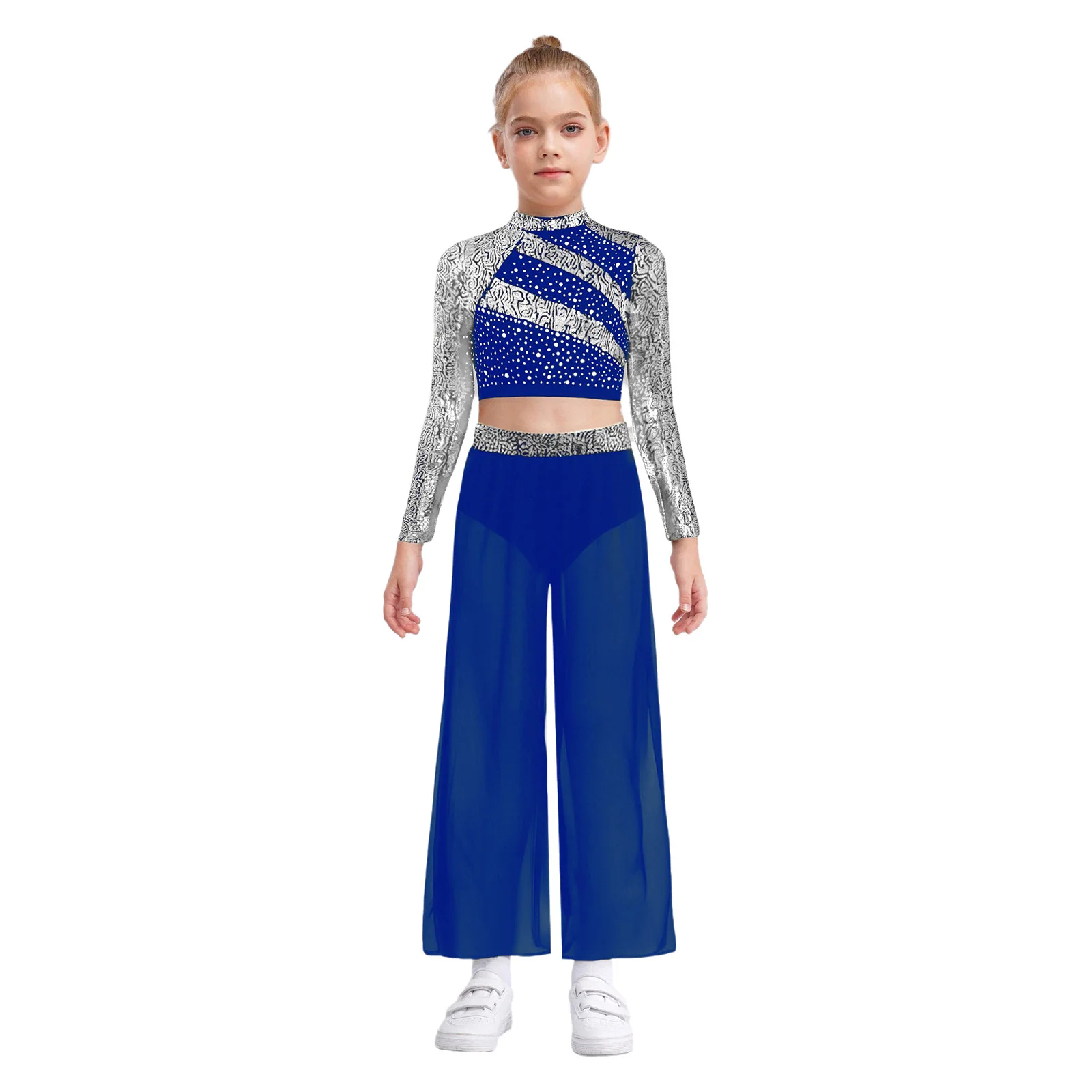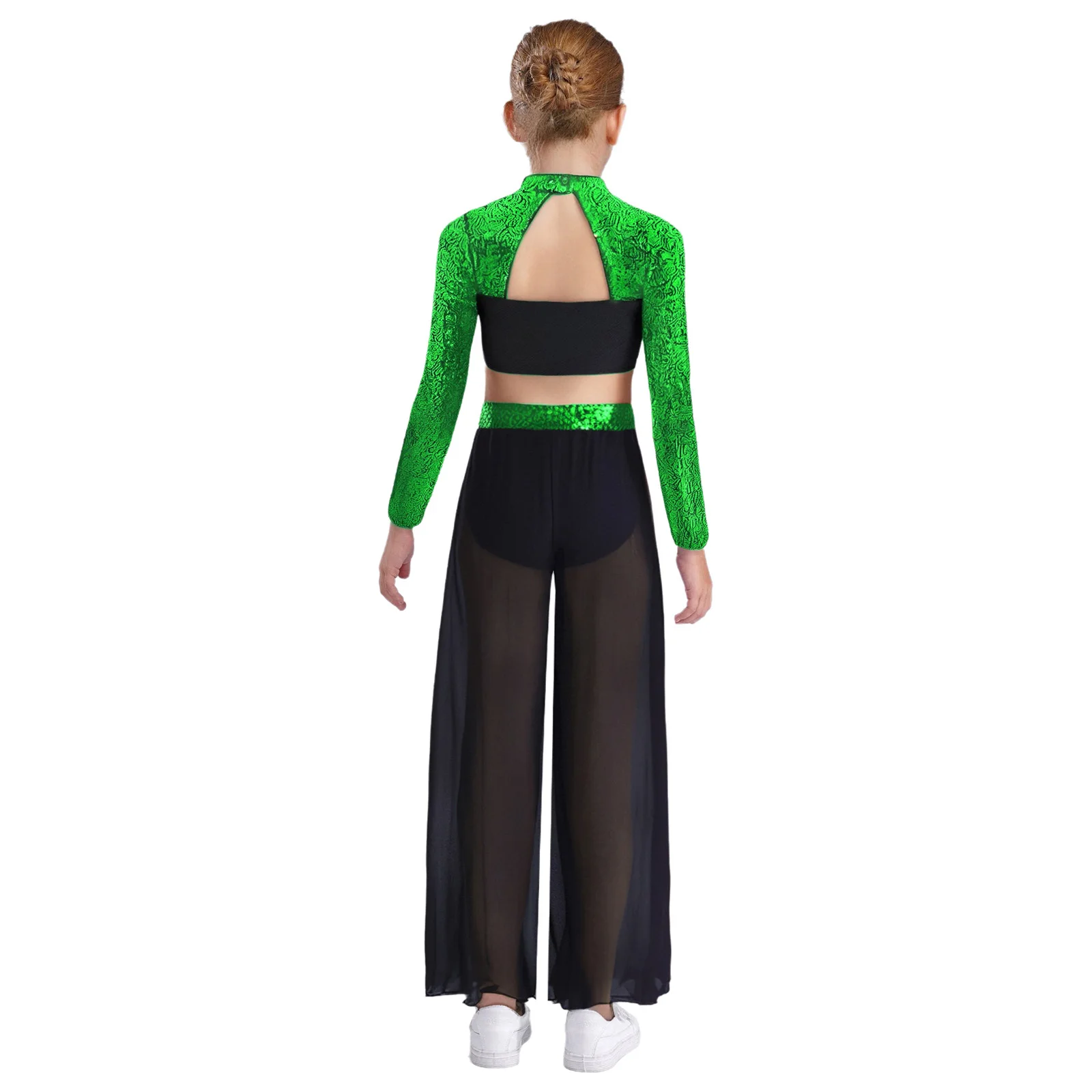 Kids Girls Sequins Ballet Jazz Dance Outfits Performance Costume Crop Top with Flowing Chiffon Overlay Wide-Leg Side Slit Pants