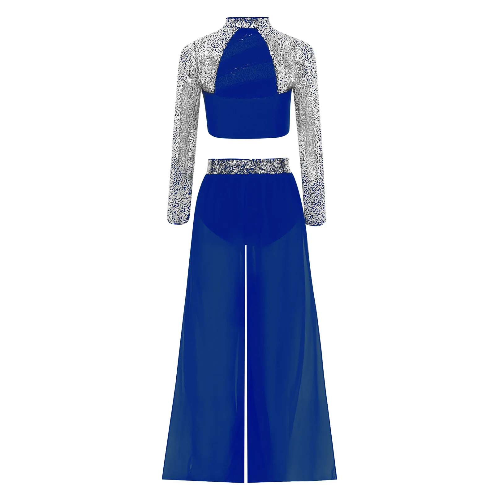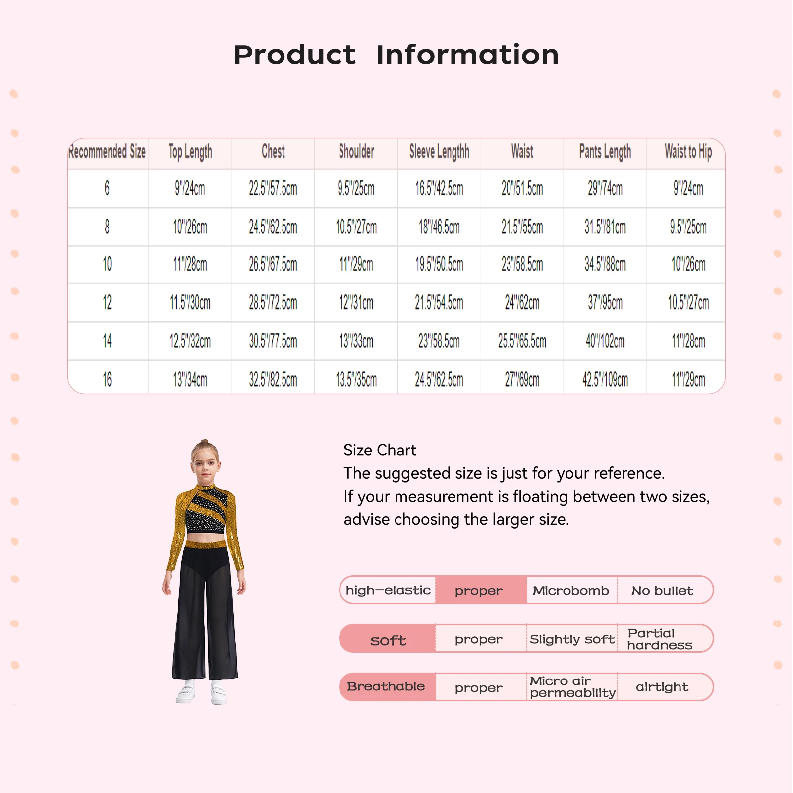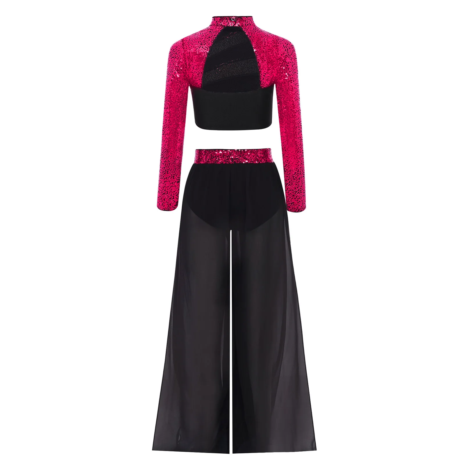 Kids Girls Sequins Ballet Jazz Dance Outfits Performance Costume Crop Top with Flowing Chiffon Overlay Wide-Leg Side Slit Pants