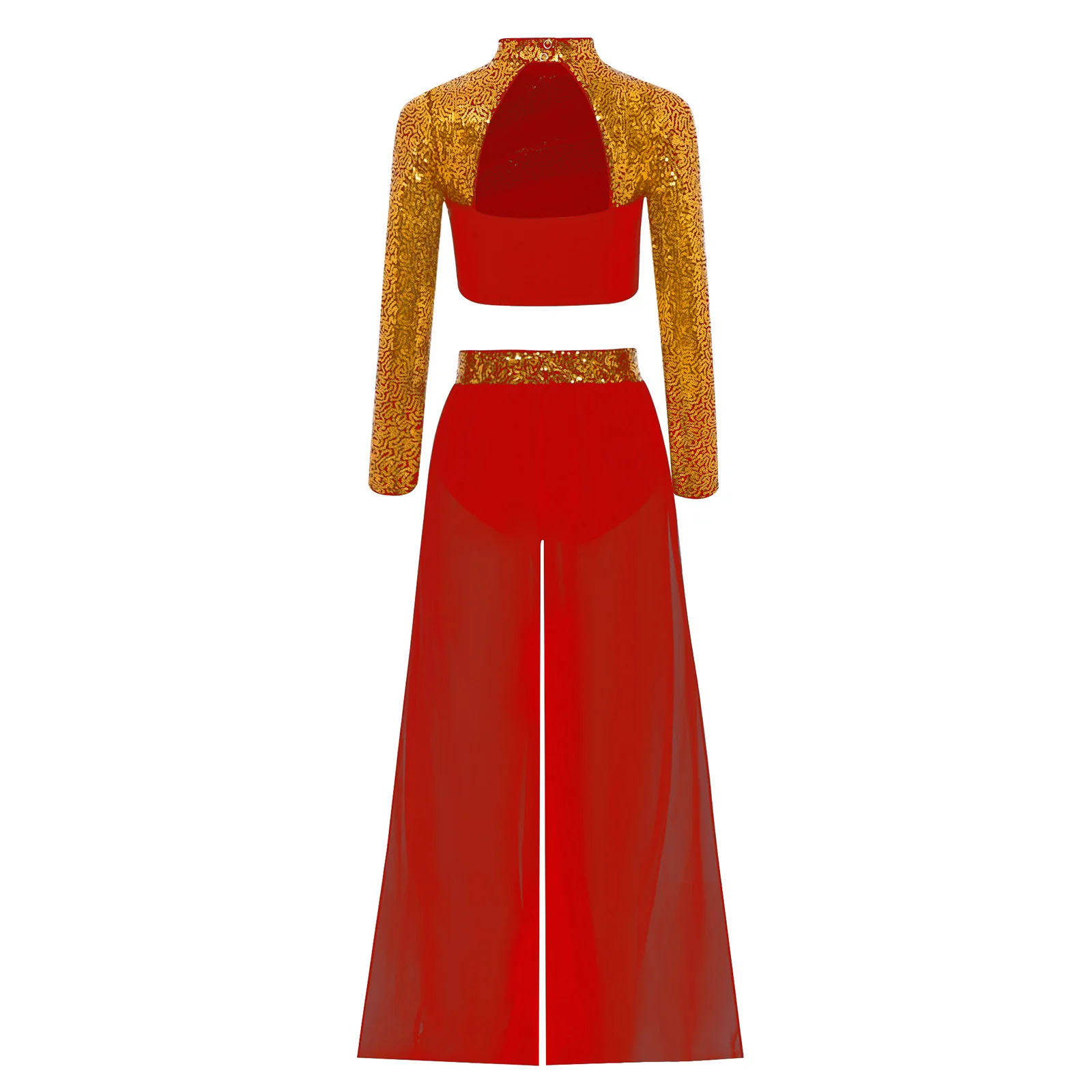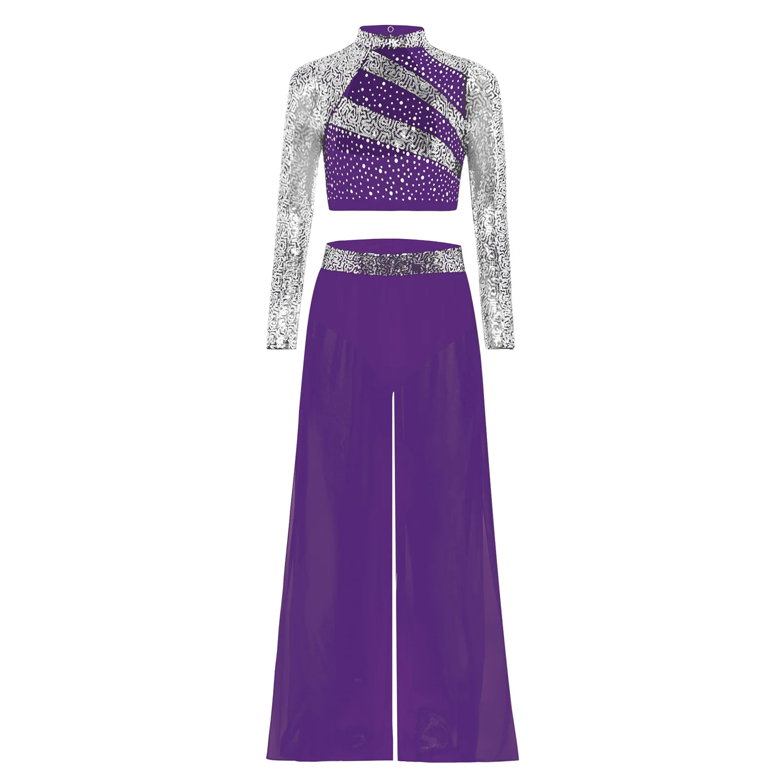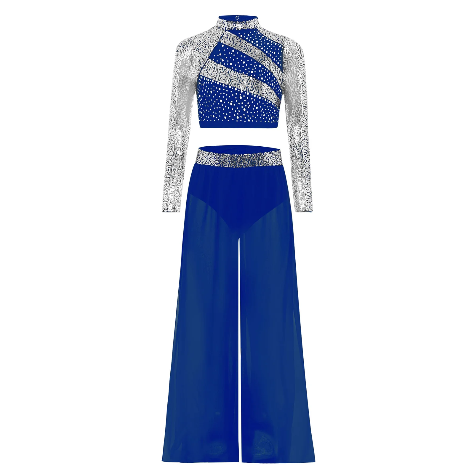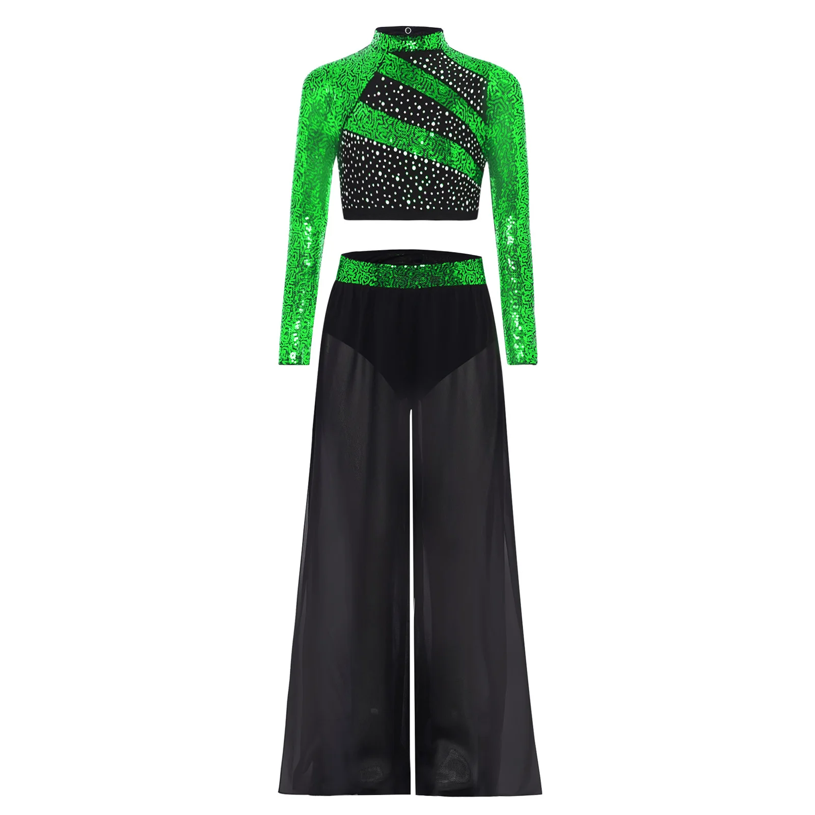 Kids Girls Sequins Ballet Jazz Dance Outfits Performance Costume Crop Top with Flowing Chiffon Overlay Wide-Leg Side Slit Pants
