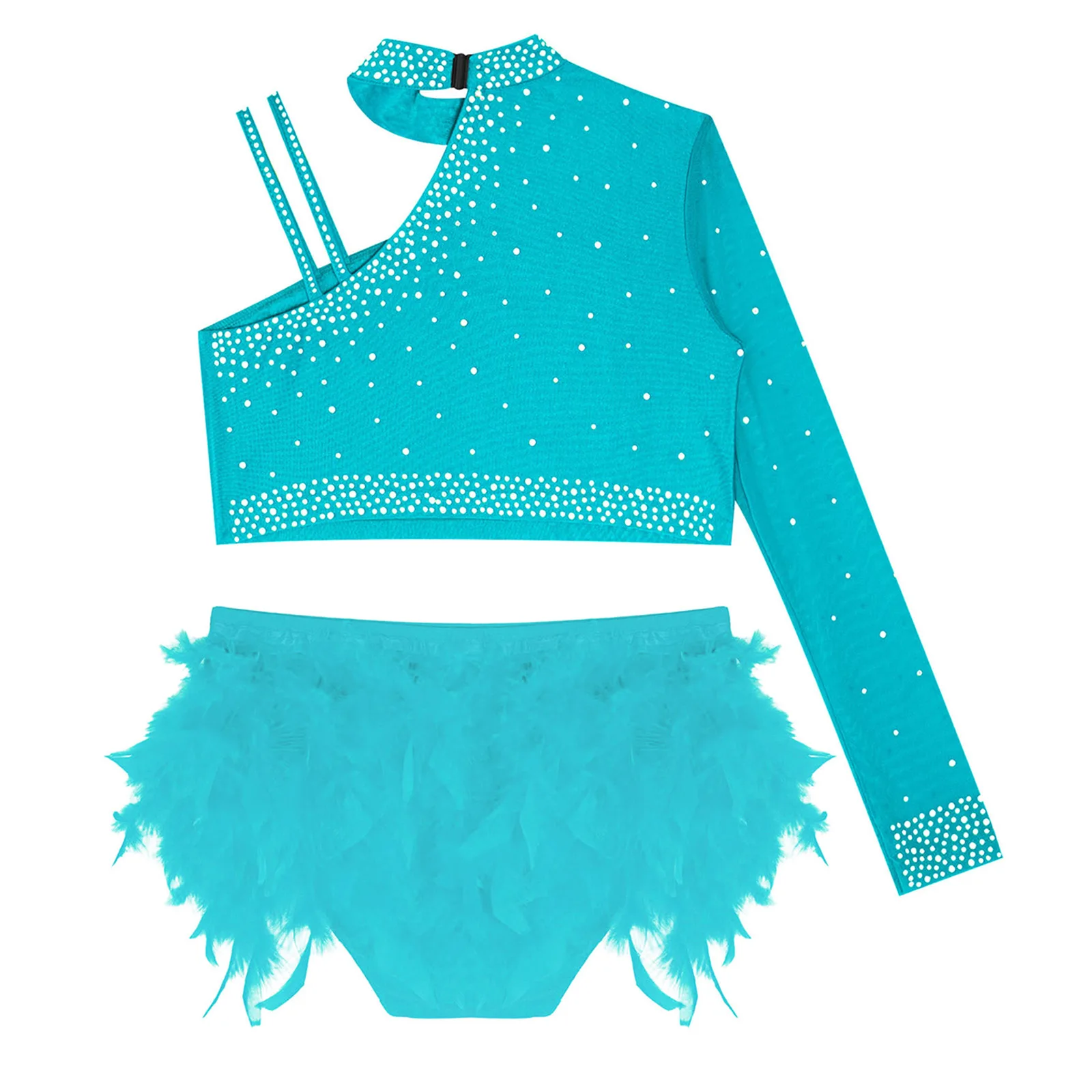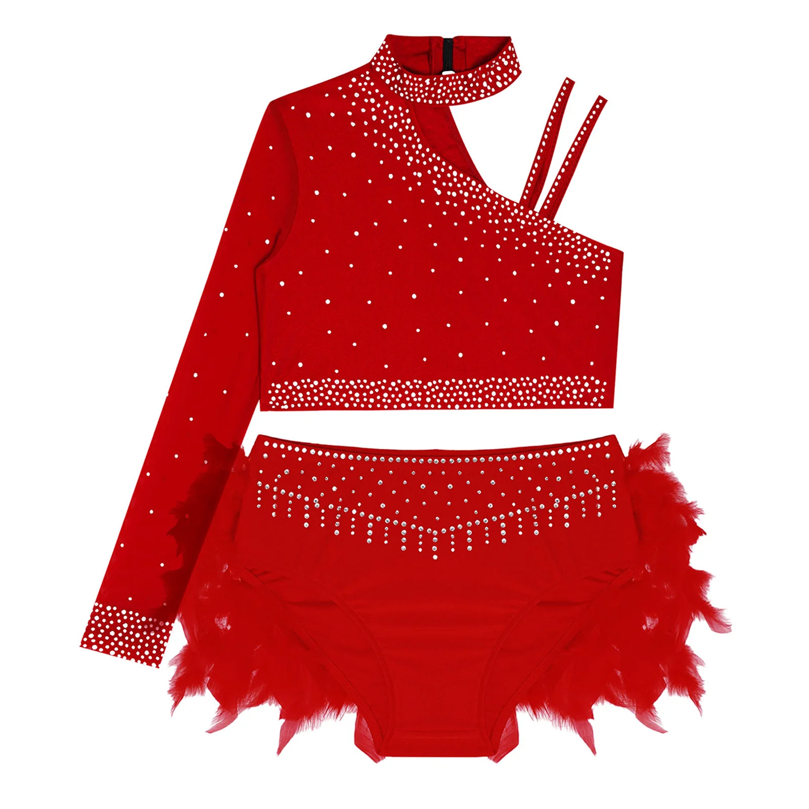 Kids girls’ lyrical dance performance outfit with rhinestones that sparkle under the light to brighten up any performance.