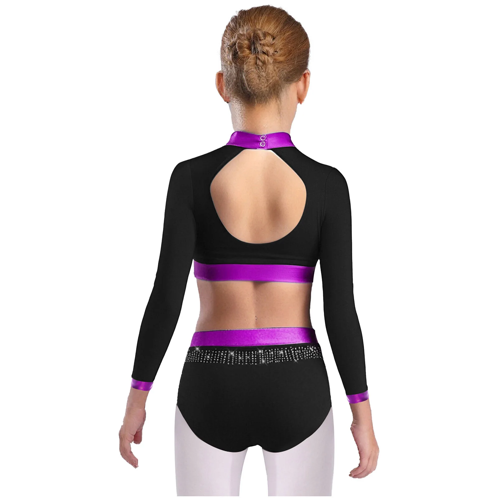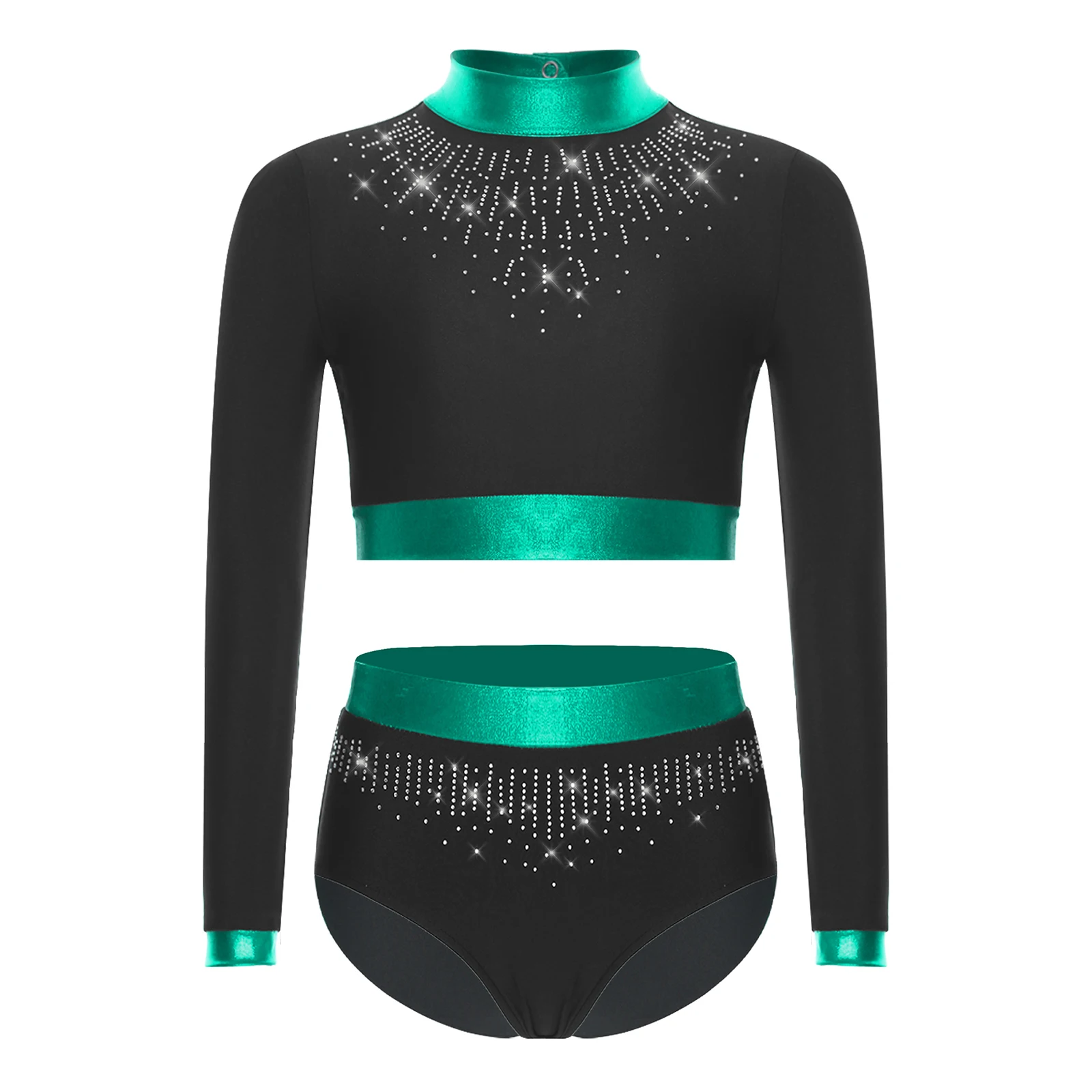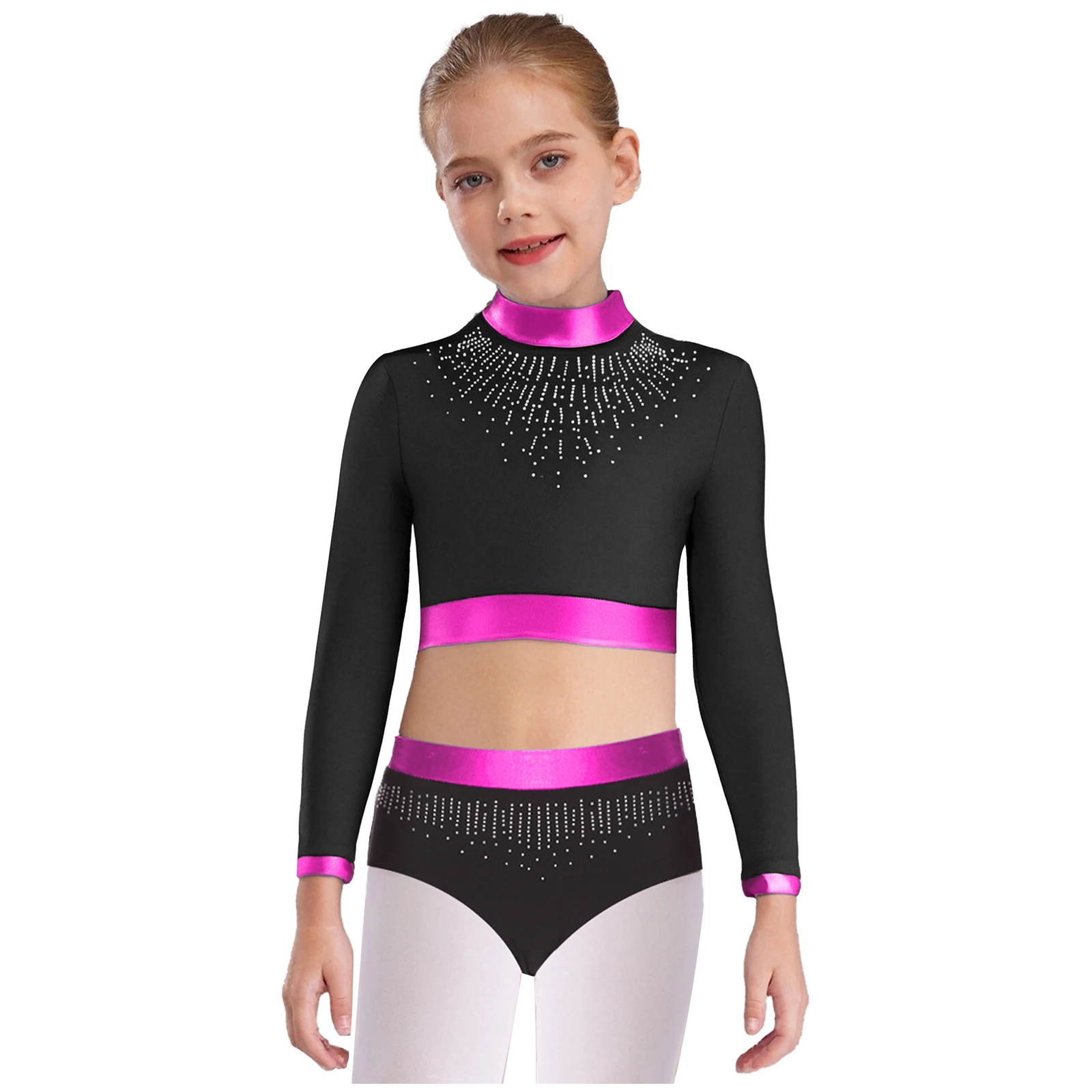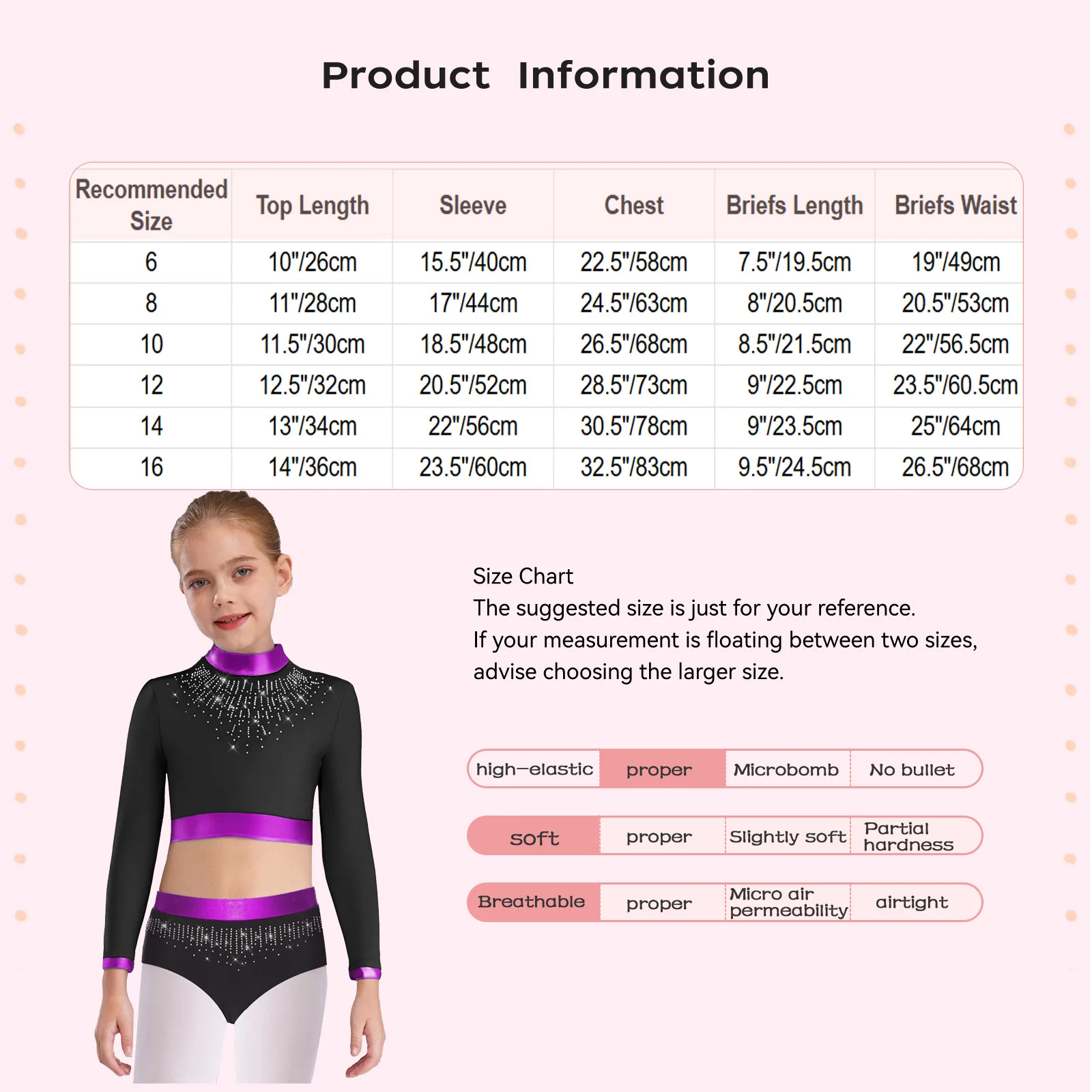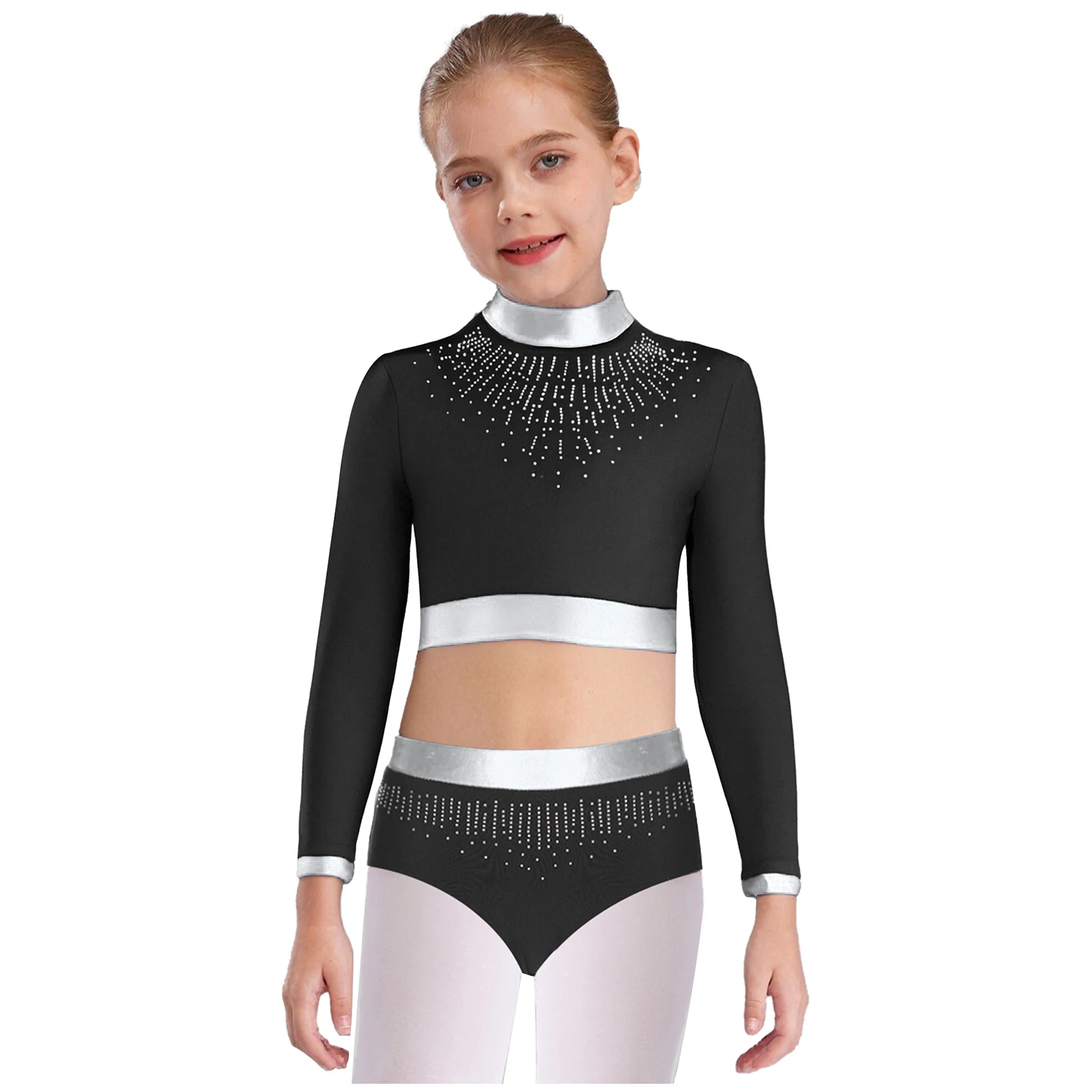 Kids Girls Shiny Rhinestones Gymnastics Artistic Skating Ballet Jazz Dance Performance Costume Crop Top with Briefs Dancewear