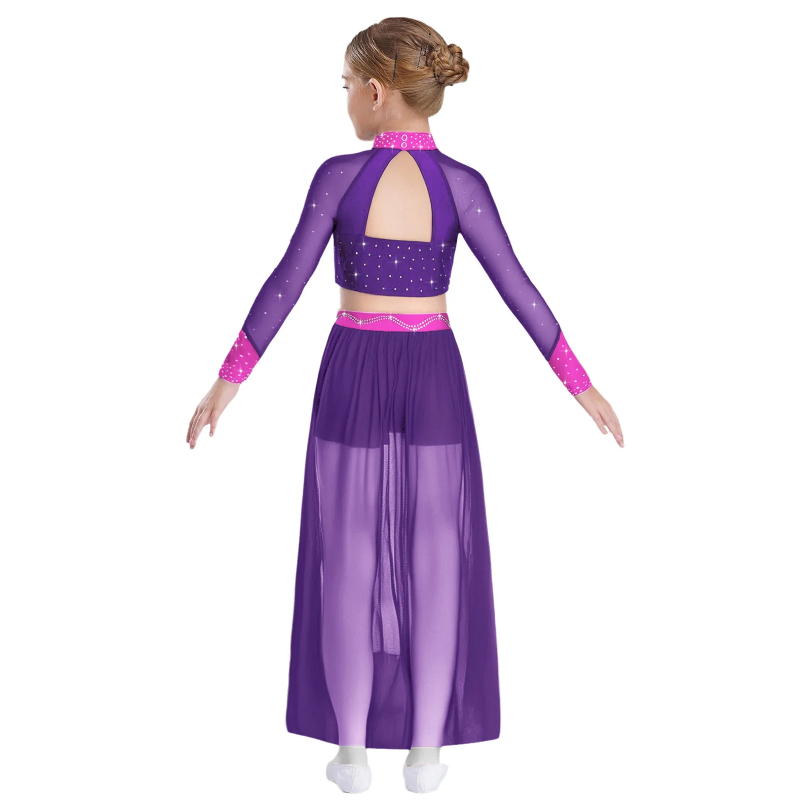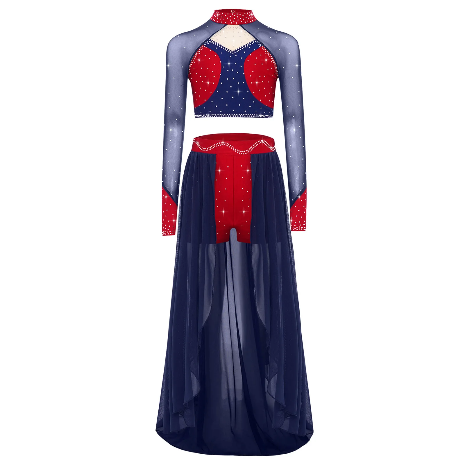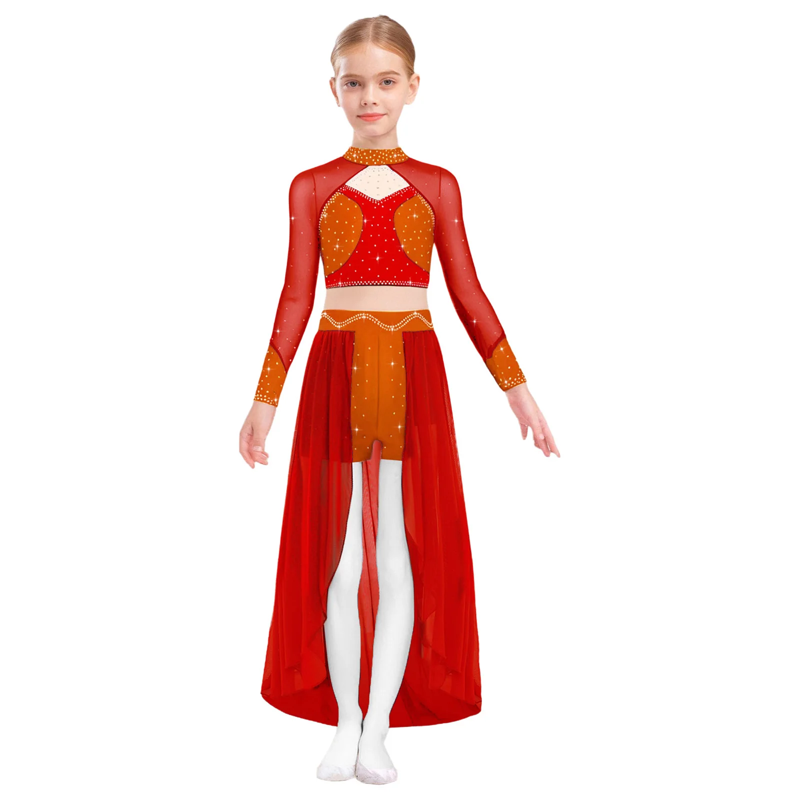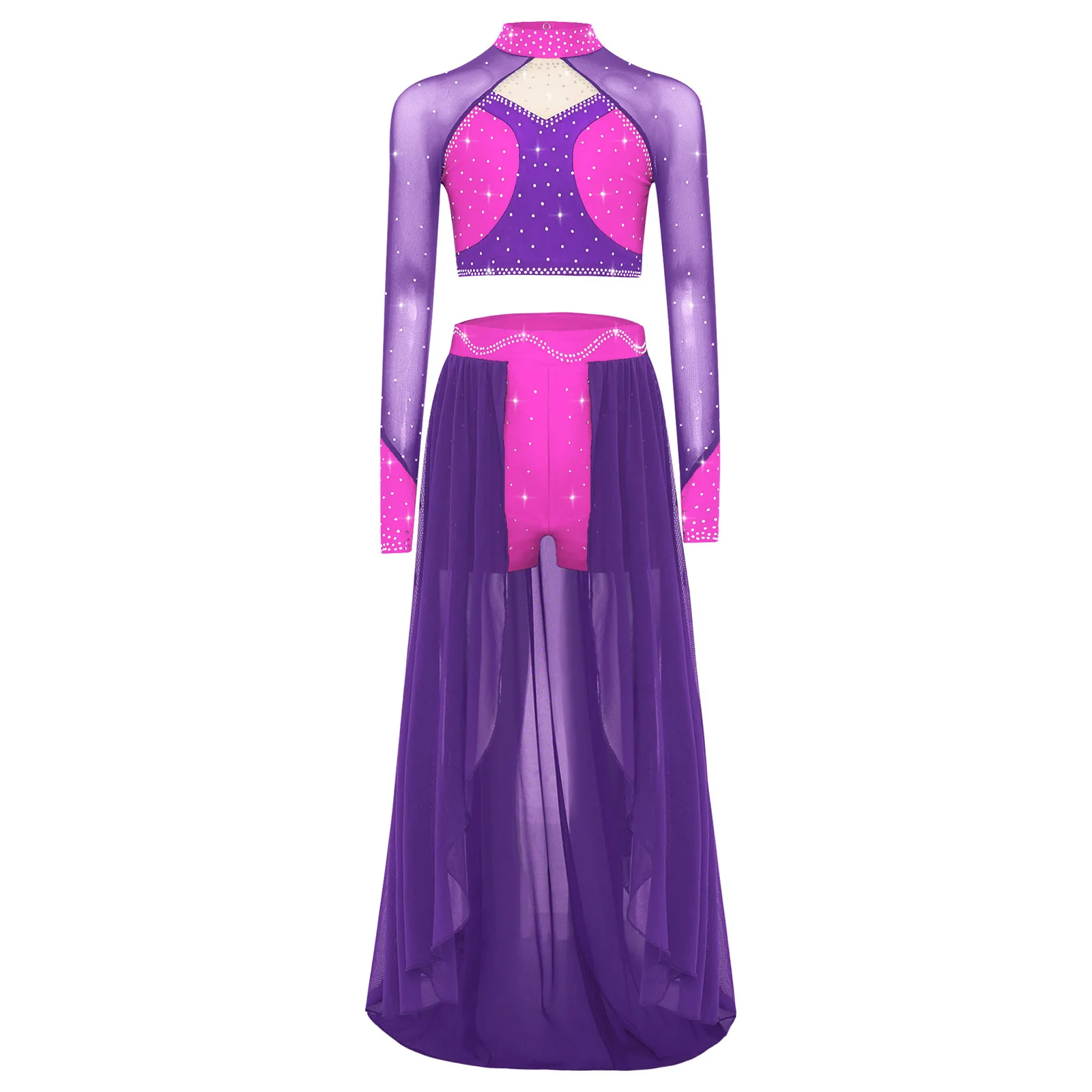 Kids Girls Shiny Rhinestones Gymnastics Leotards Crop Top with Skirt Ballet Lyrical Modern Contemporary Dance Leotard Costume