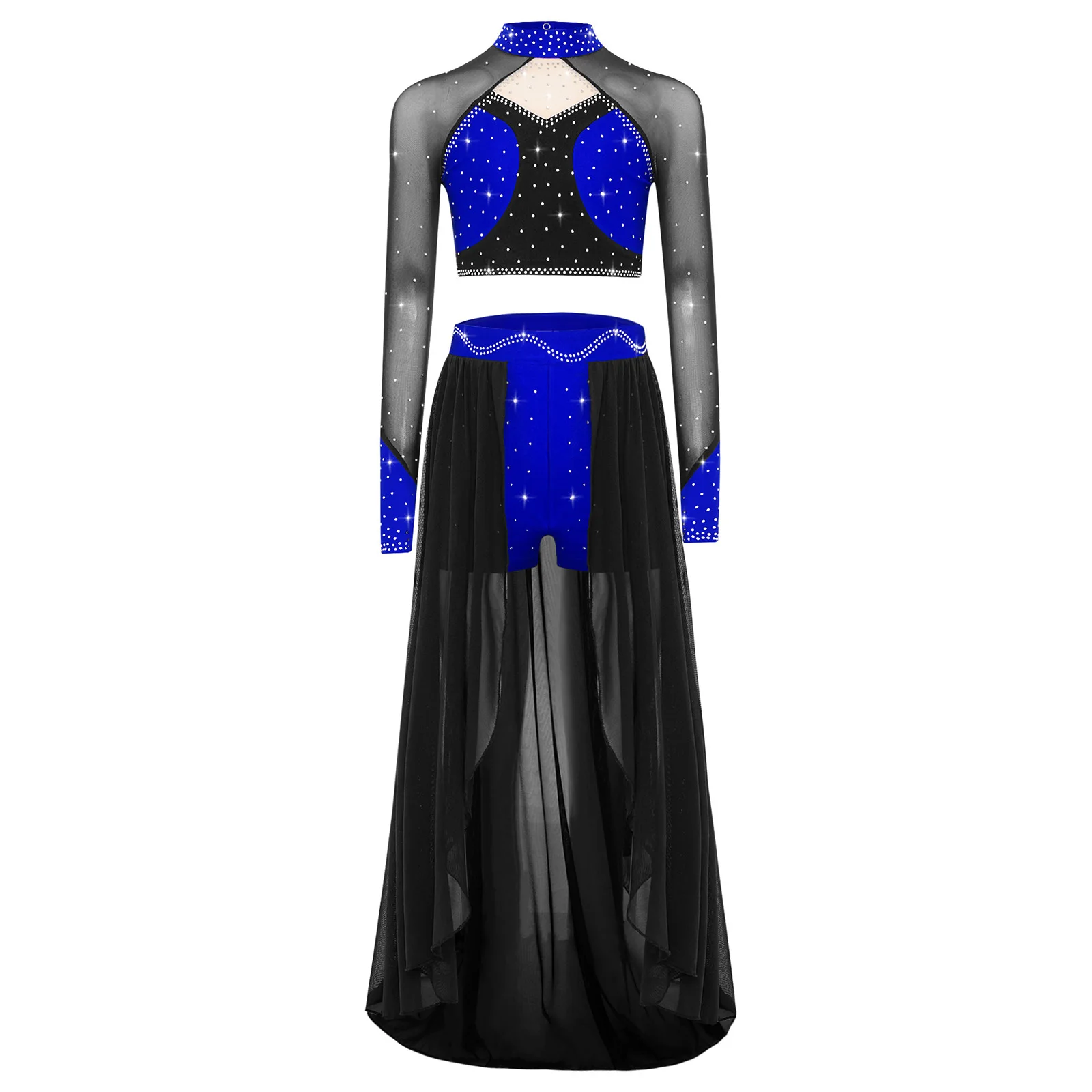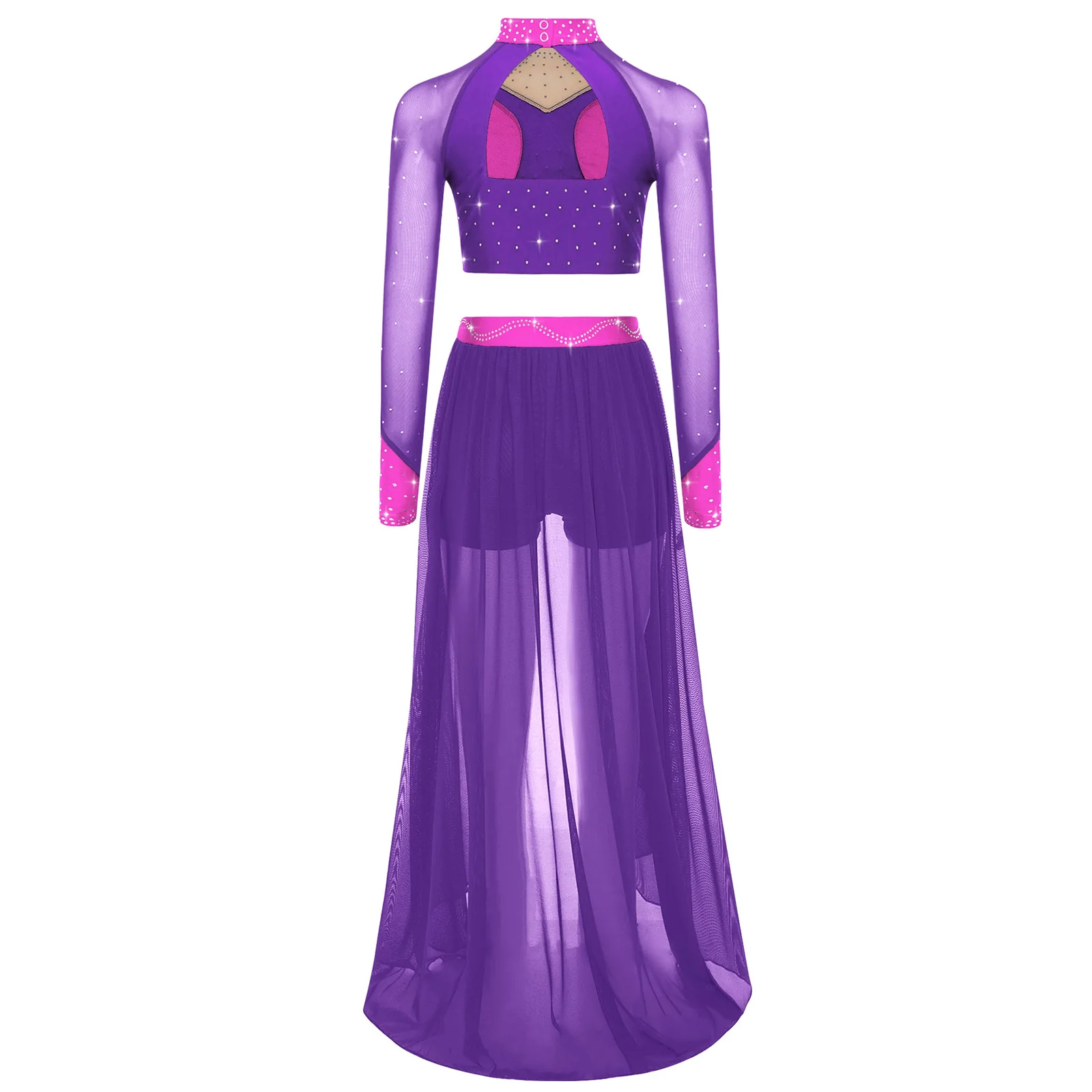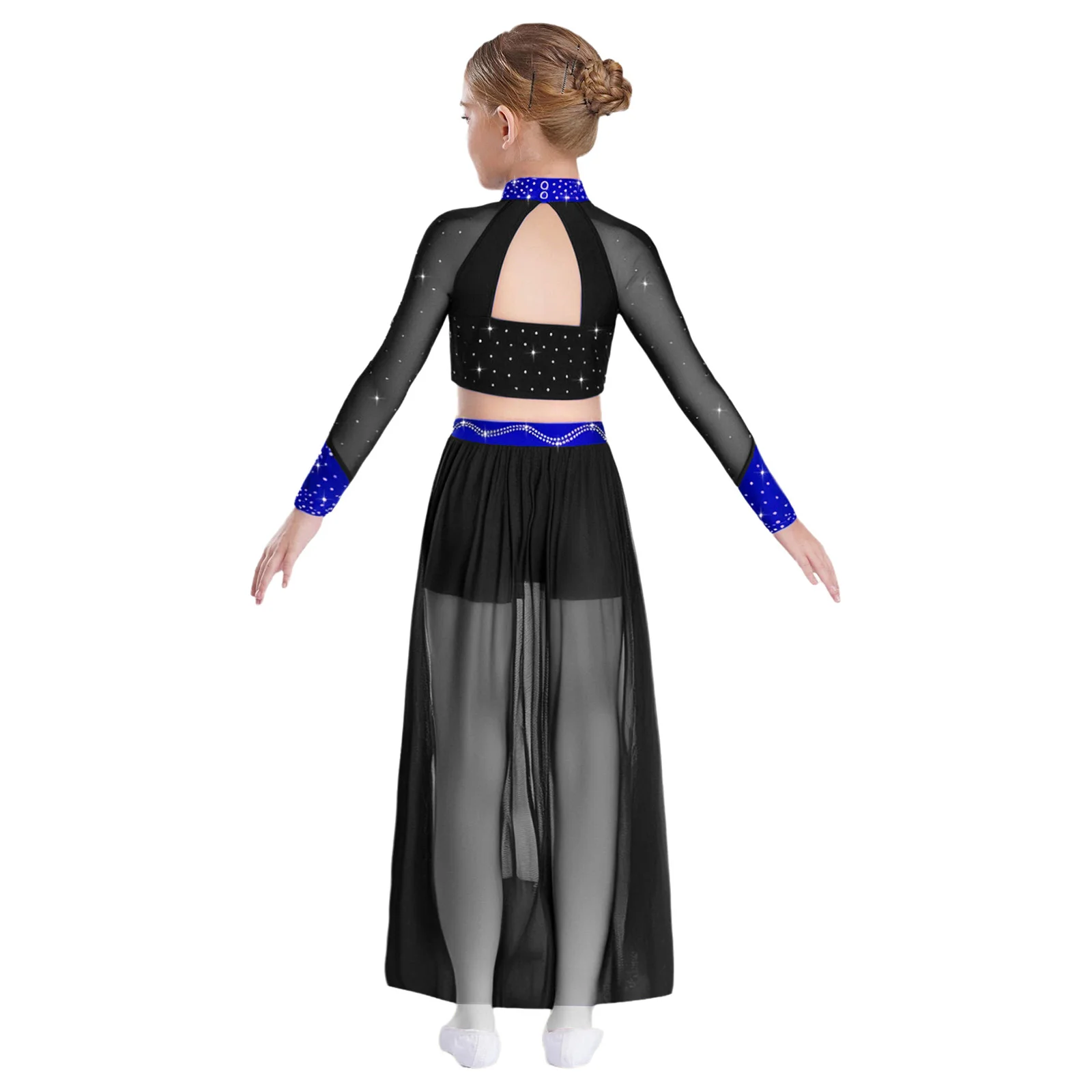 Kids Girls Shiny Rhinestones Gymnastics Leotards Crop Top with Skirt Ballet Lyrical Modern Contemporary Dance Leotard Costume