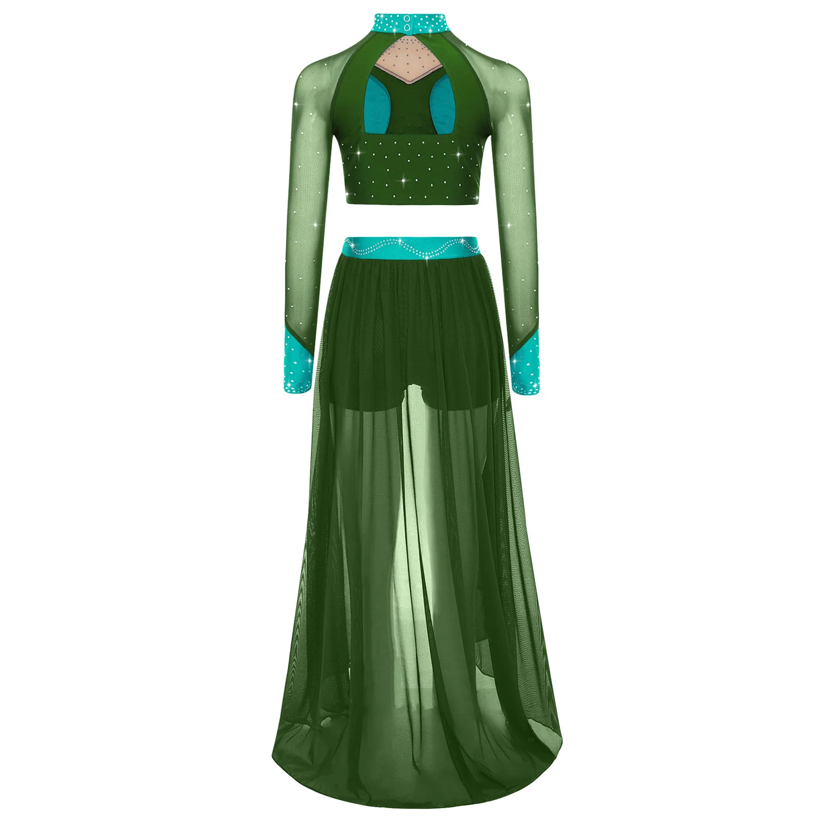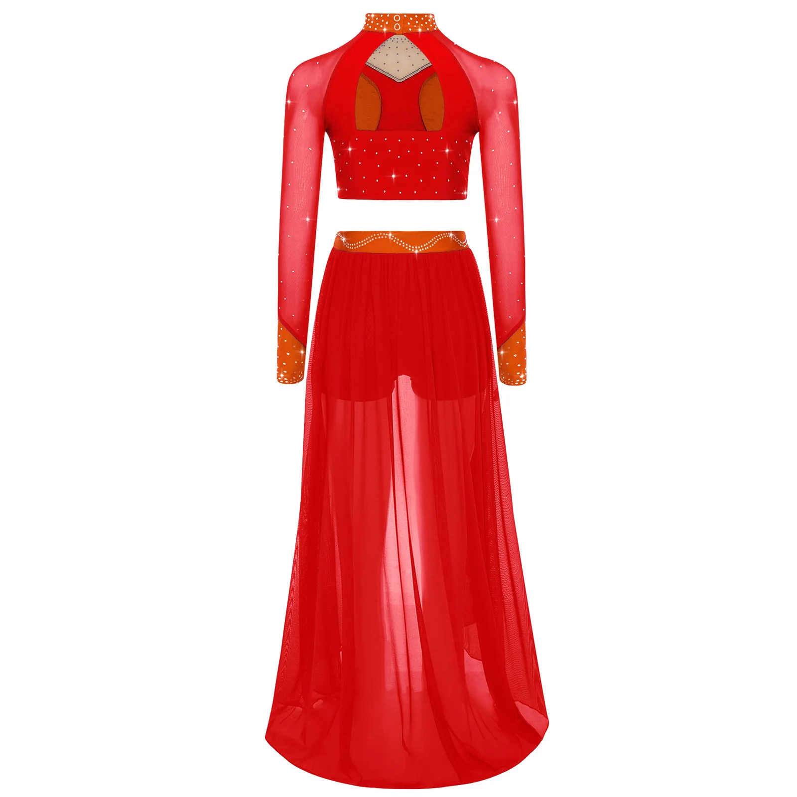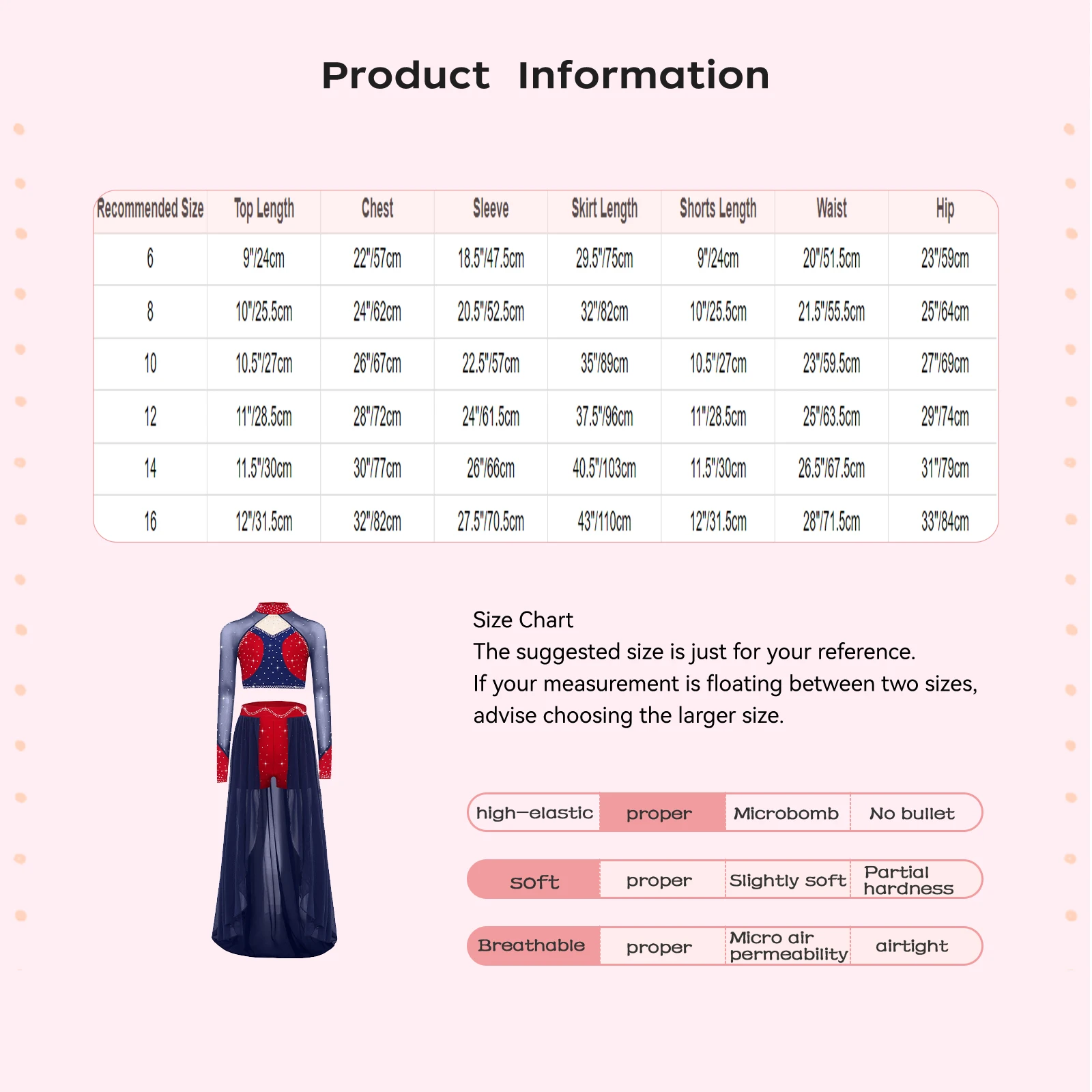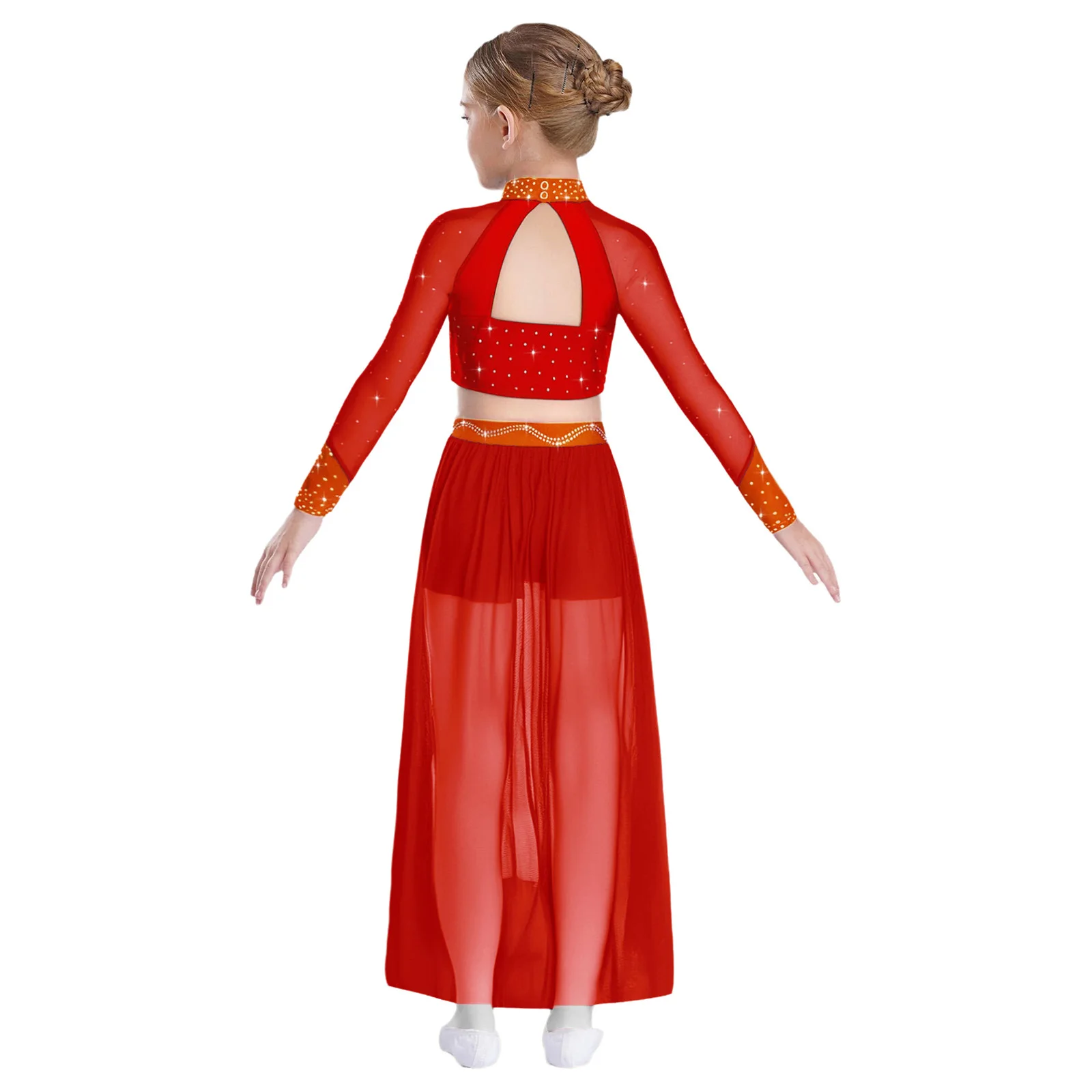 Kids Girls Shiny Rhinestones Gymnastics Leotards Crop Top with Skirt Ballet Lyrical Modern Contemporary Dance Leotard Costume