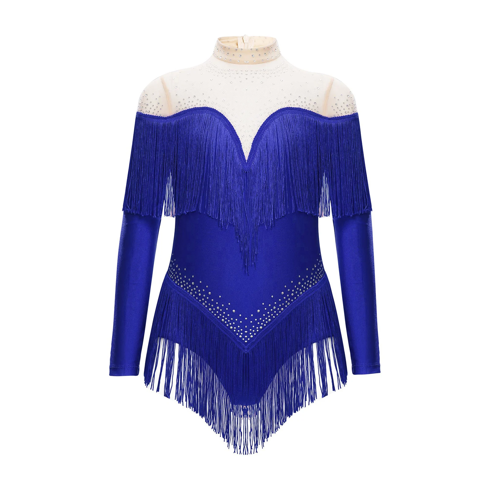 Kids Girls Shiny Rhinestones Tassel Gymnastics Artistic Figure Skating Latin Ballet Dance Leotard Sheer Mesh Jumpsuit Bodysuit