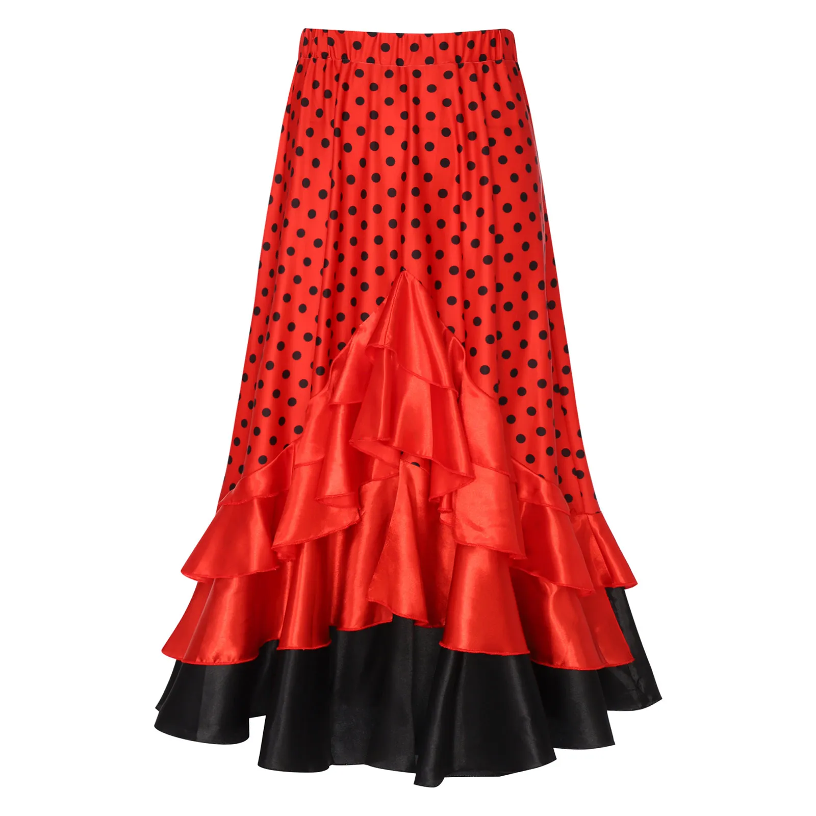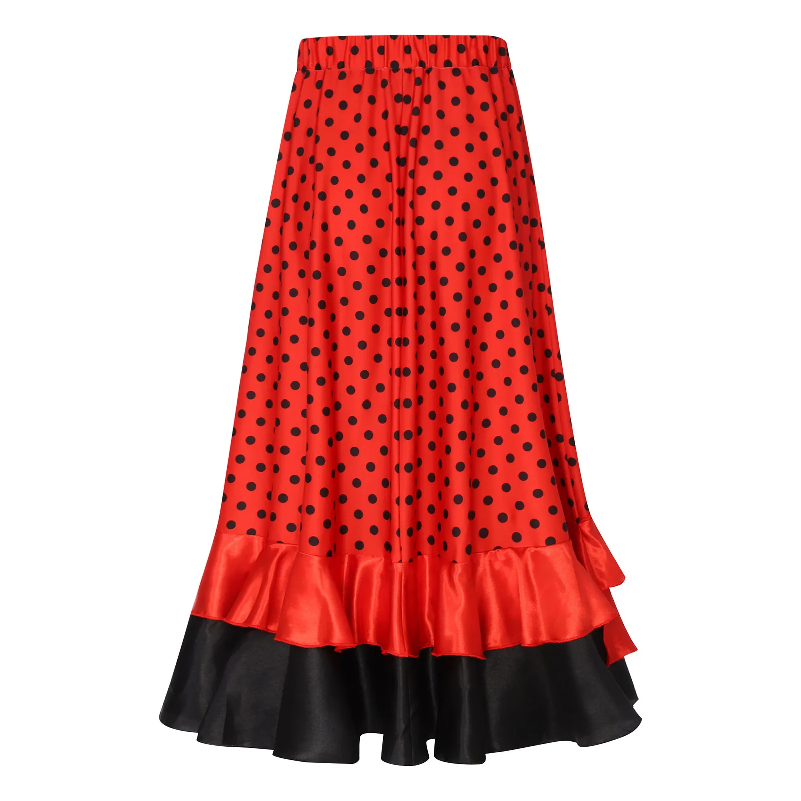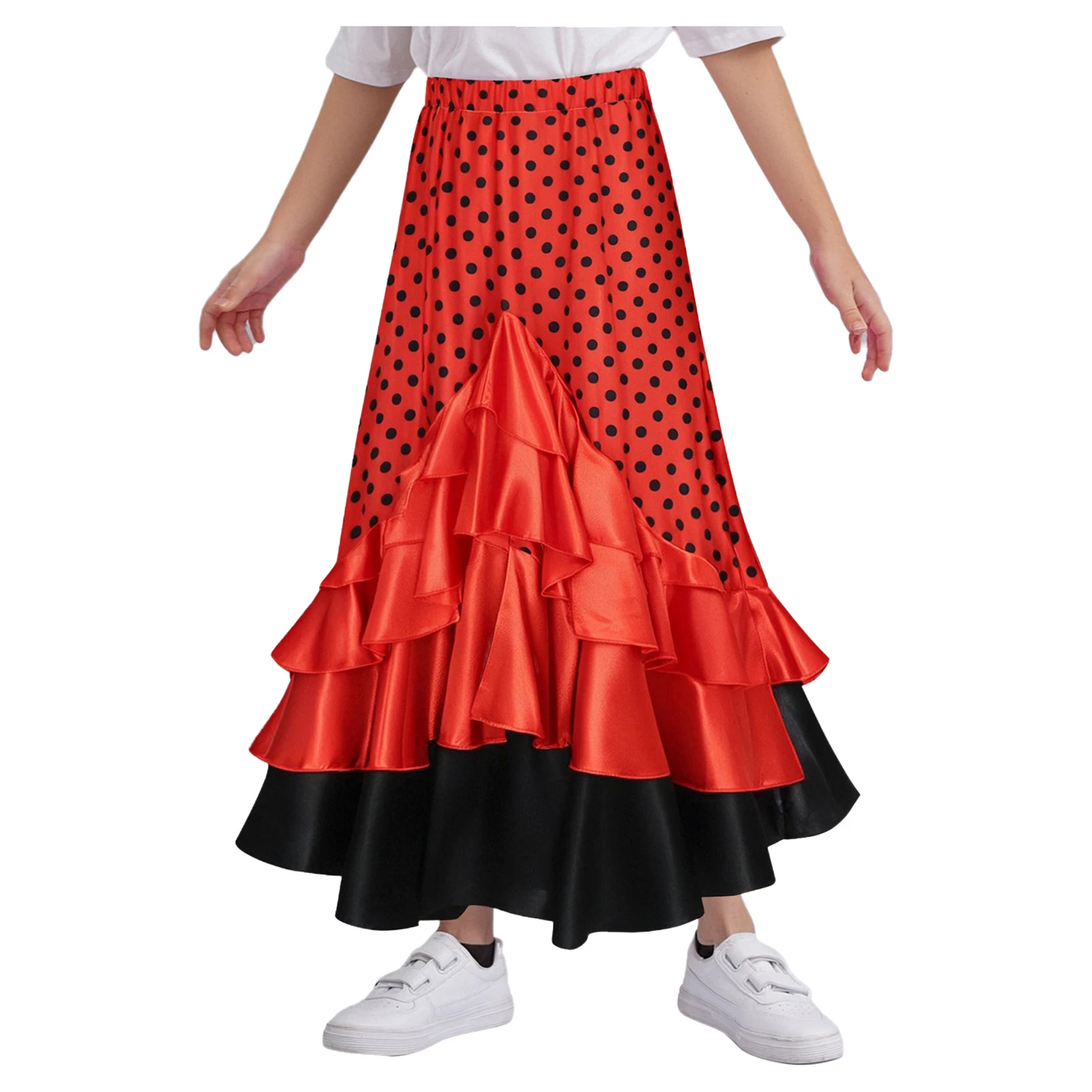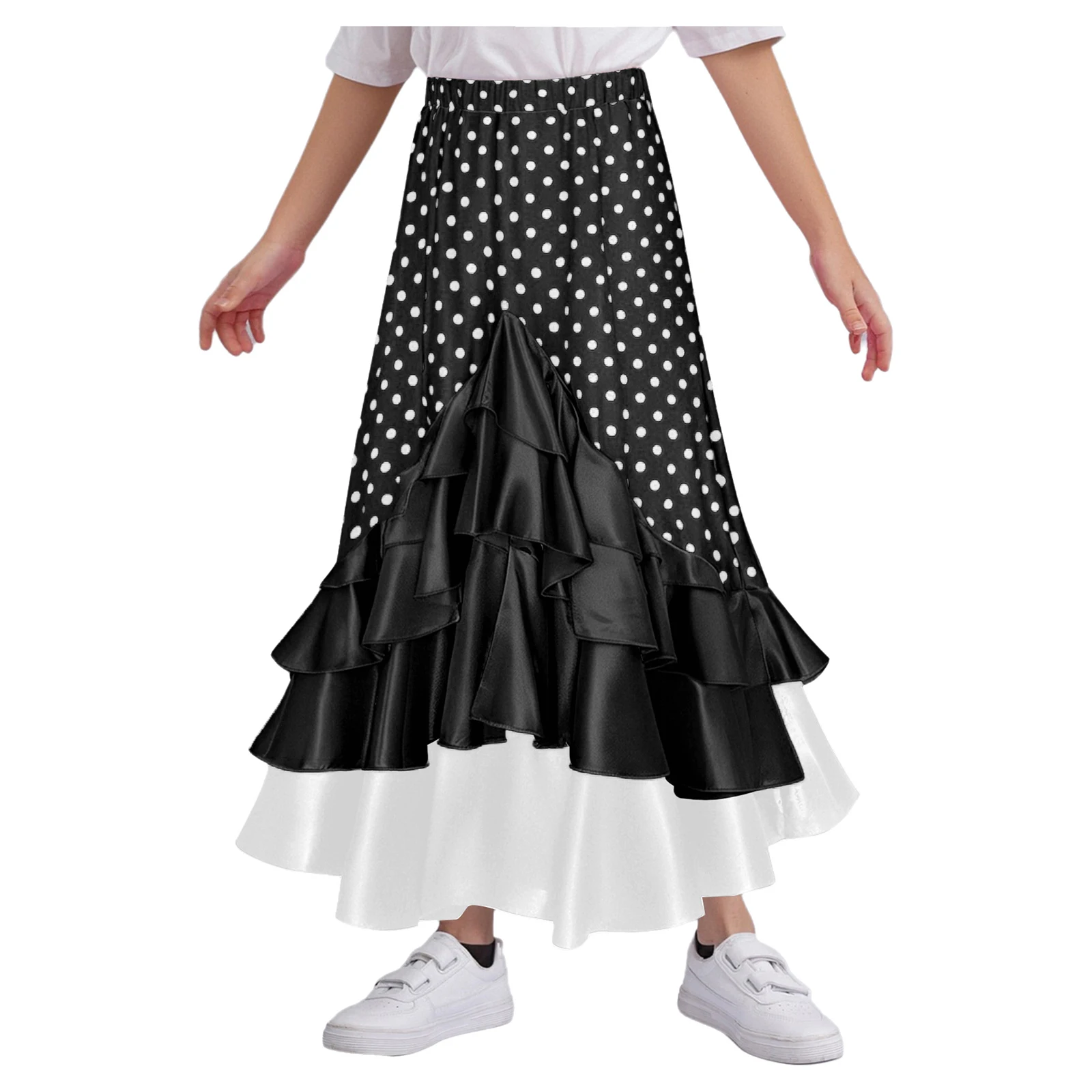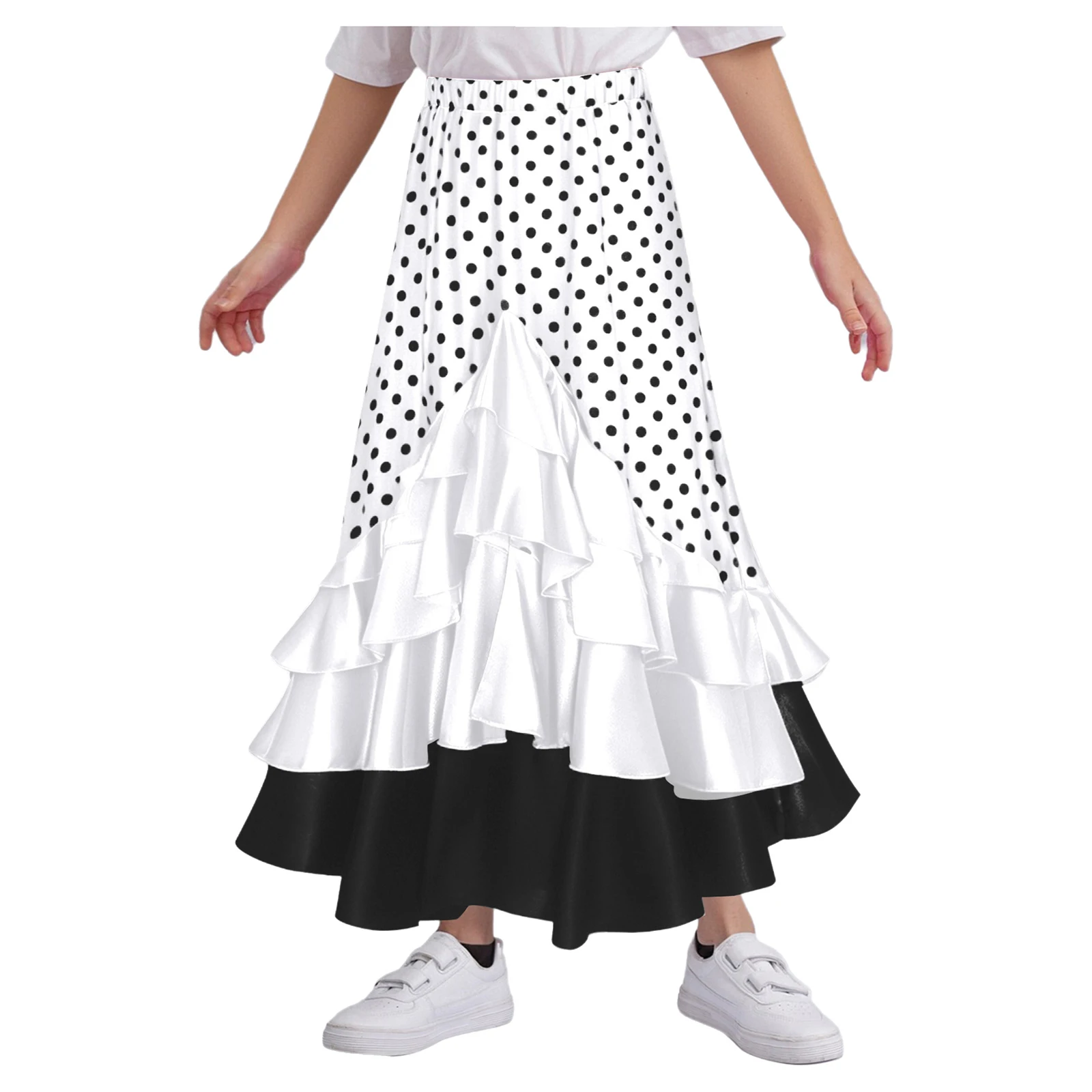 Kids Girls Spanish Flamenco Polka-Dot Ruffle Waltz Skirt Layered Ruffled Design Long Swing Skirt Latin Ballroom Dance Costume
