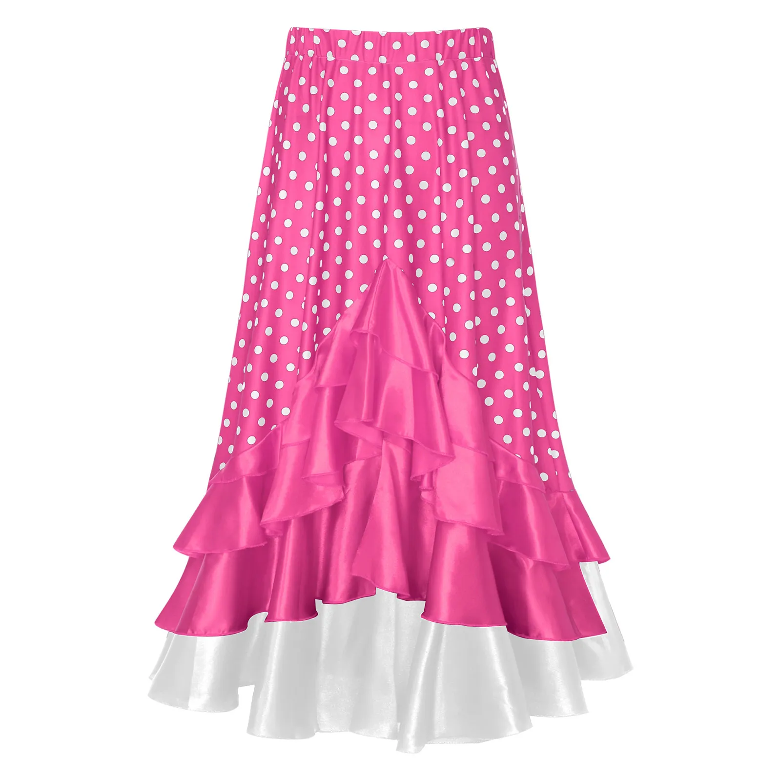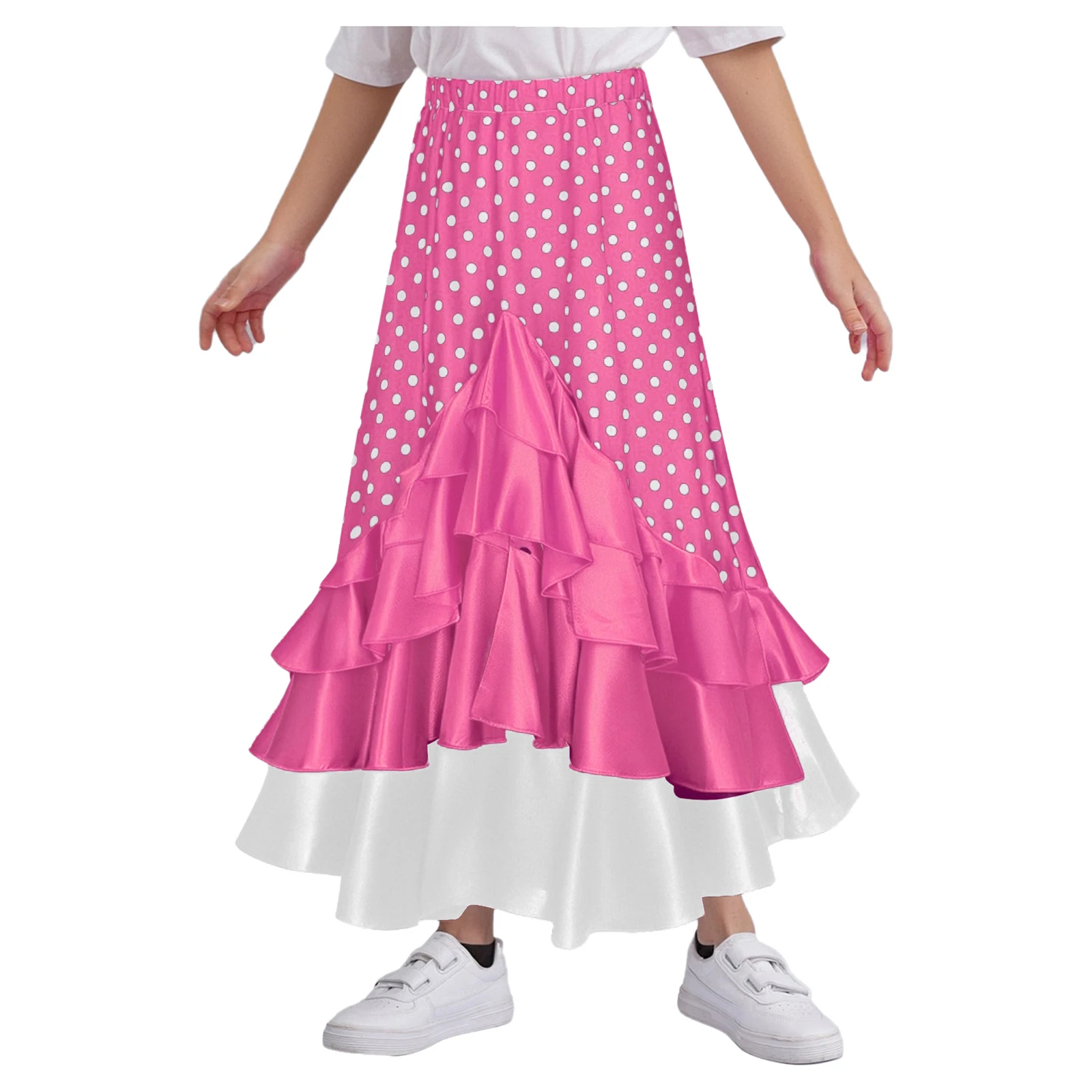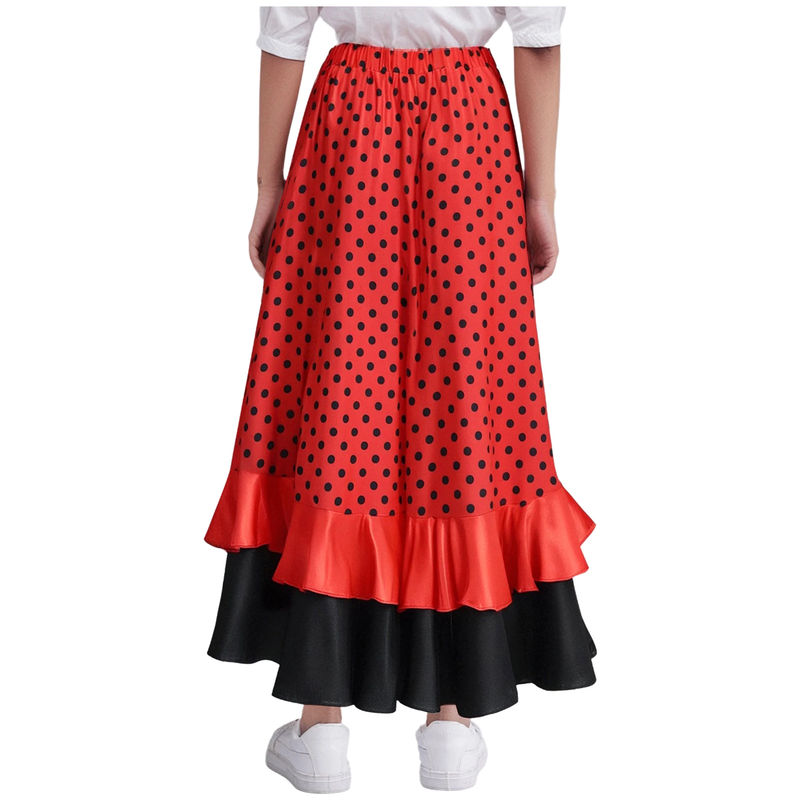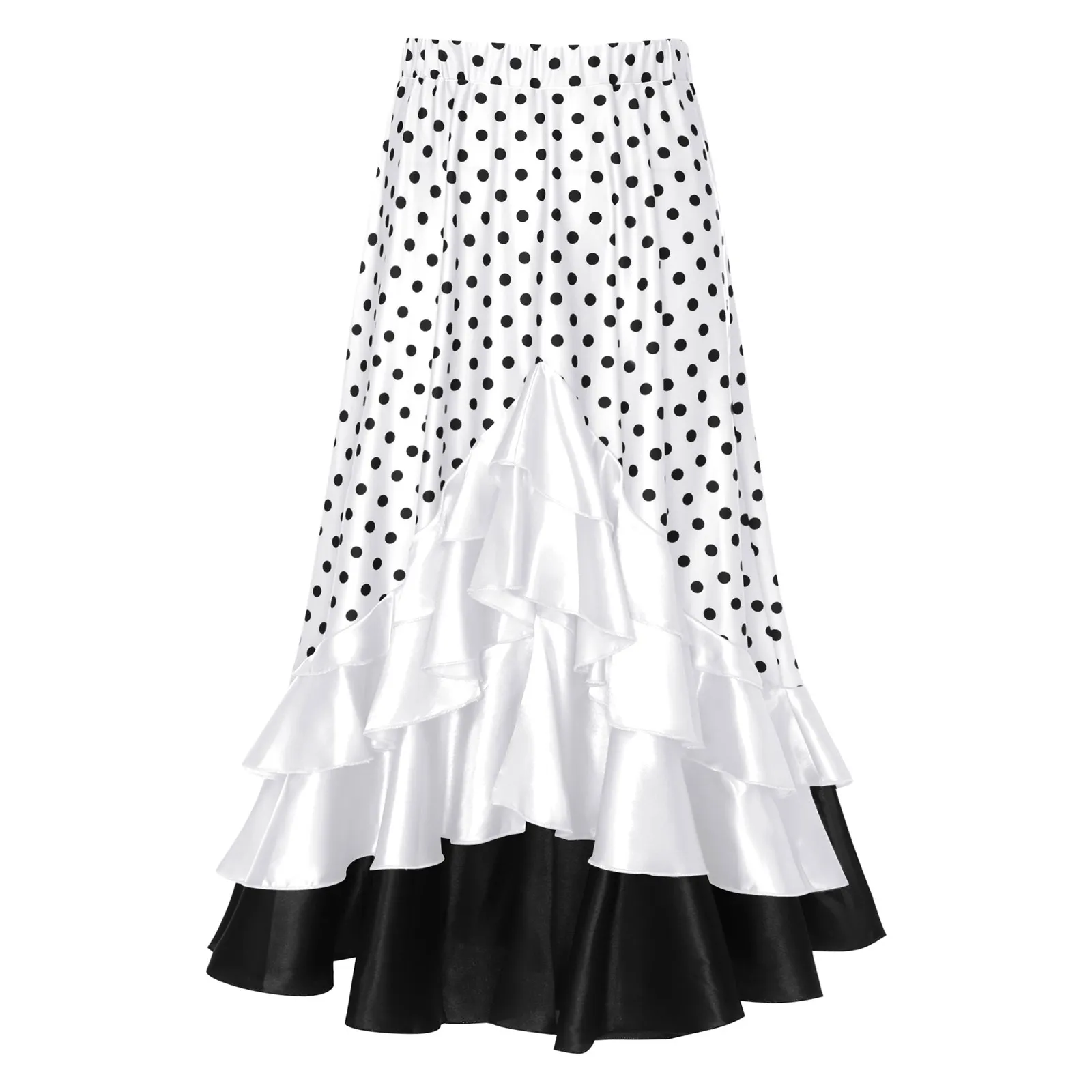 Kids Girls Spanish Flamenco Polka-Dot Ruffle Waltz Skirt Layered Ruffled Design Long Swing Skirt Latin Ballroom Dance Costume