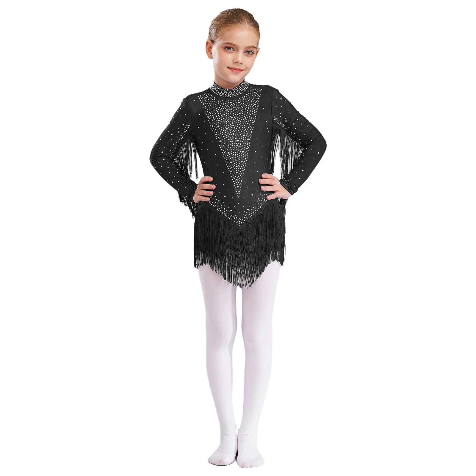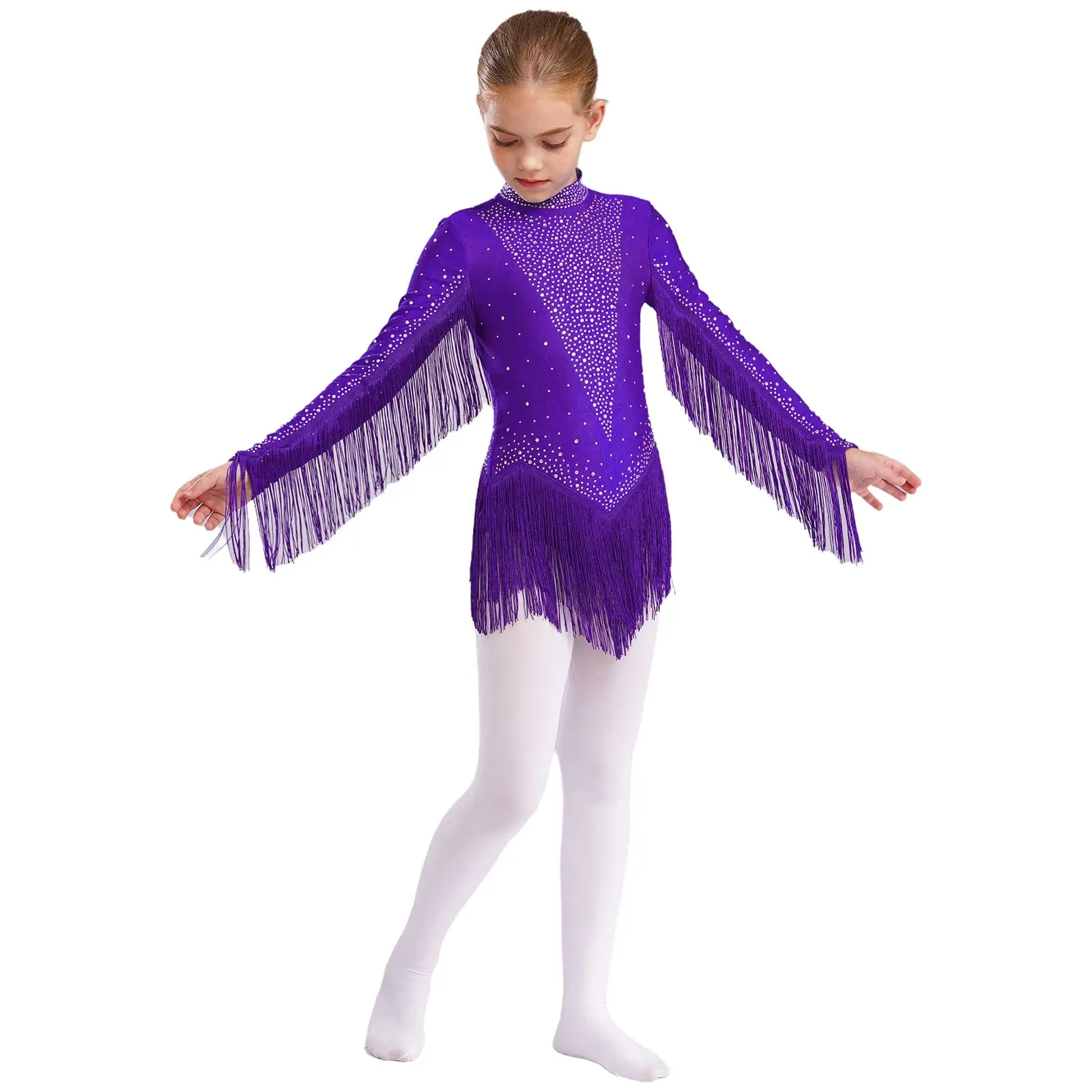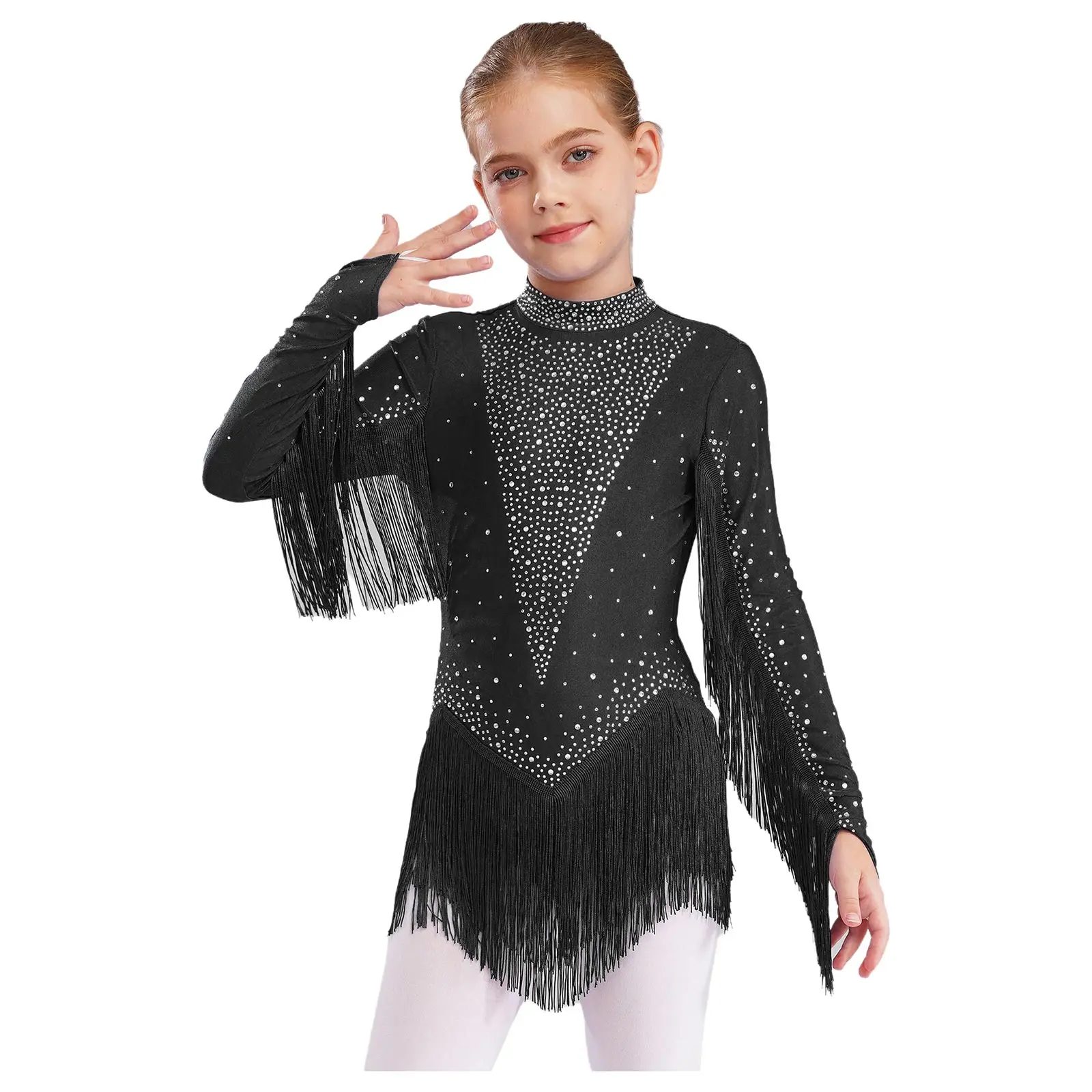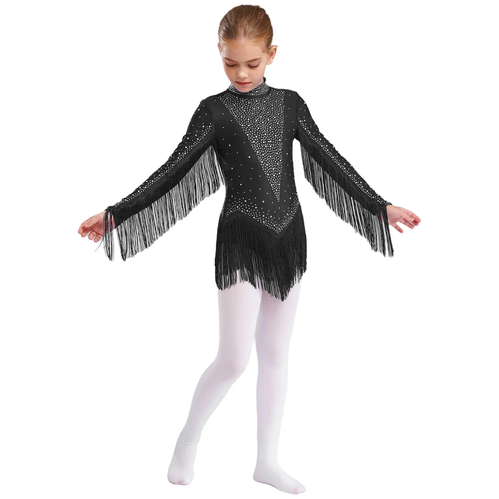 Kids Girls Tassels Gymnastics Figure Skating Latin Ballet Dance Leotard Costume Sparkling Rhinestones Fringe Bodysuit Dancewear