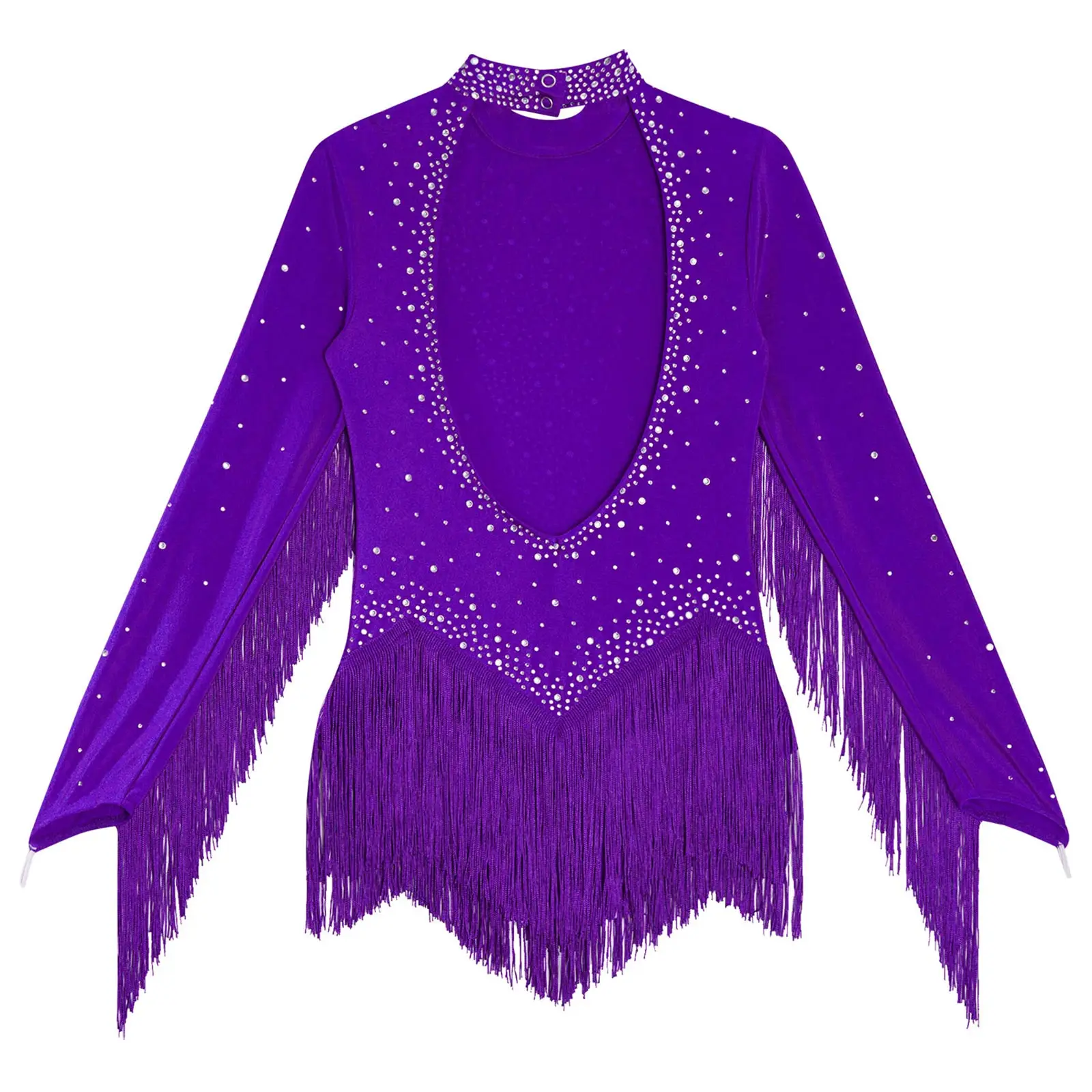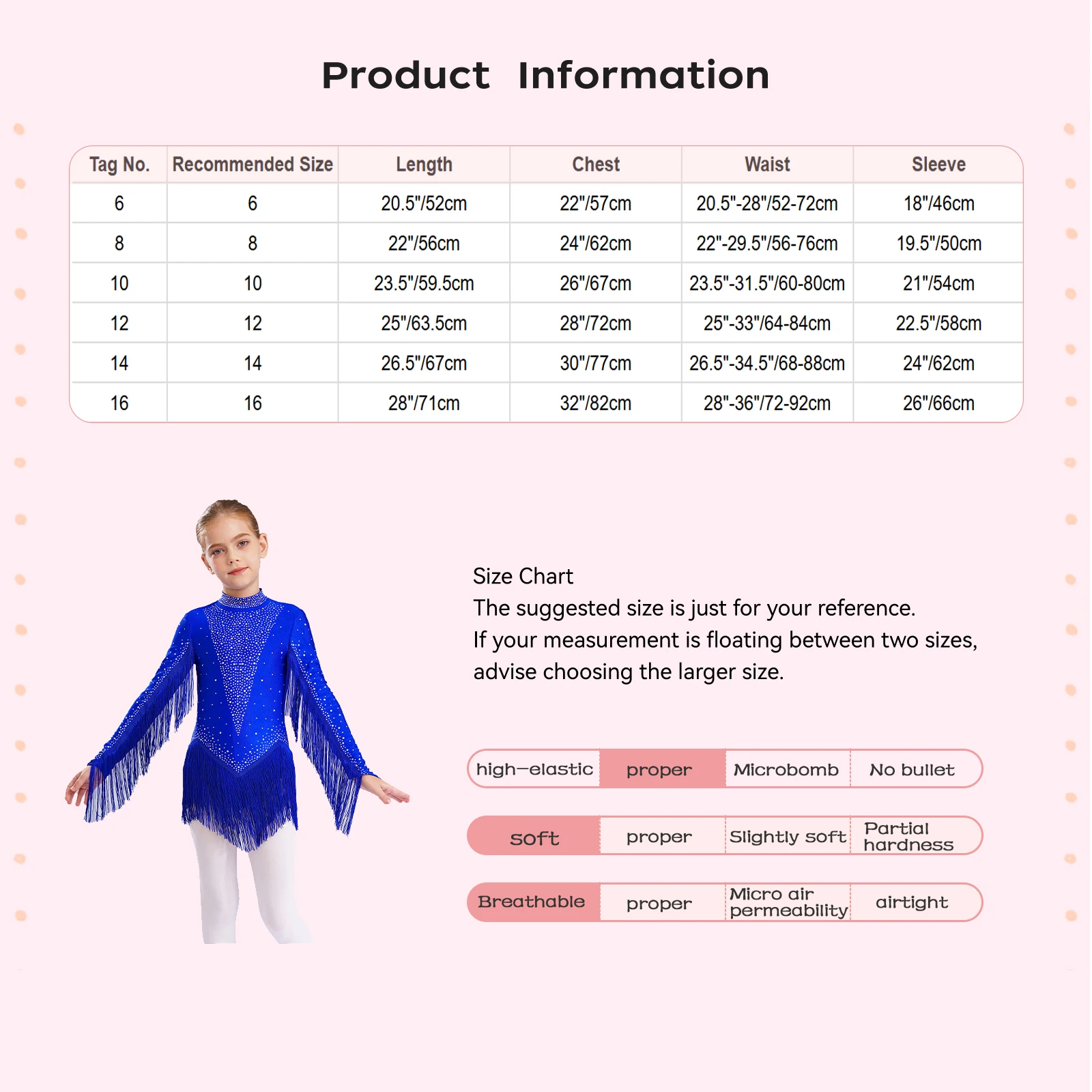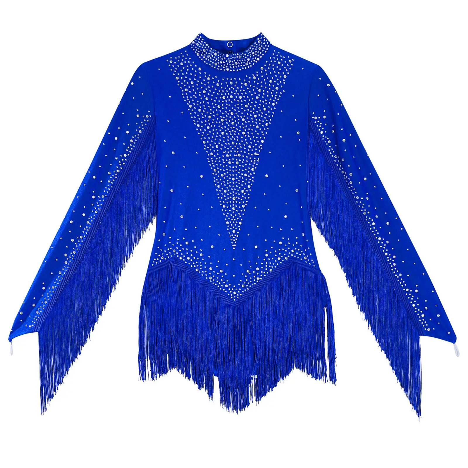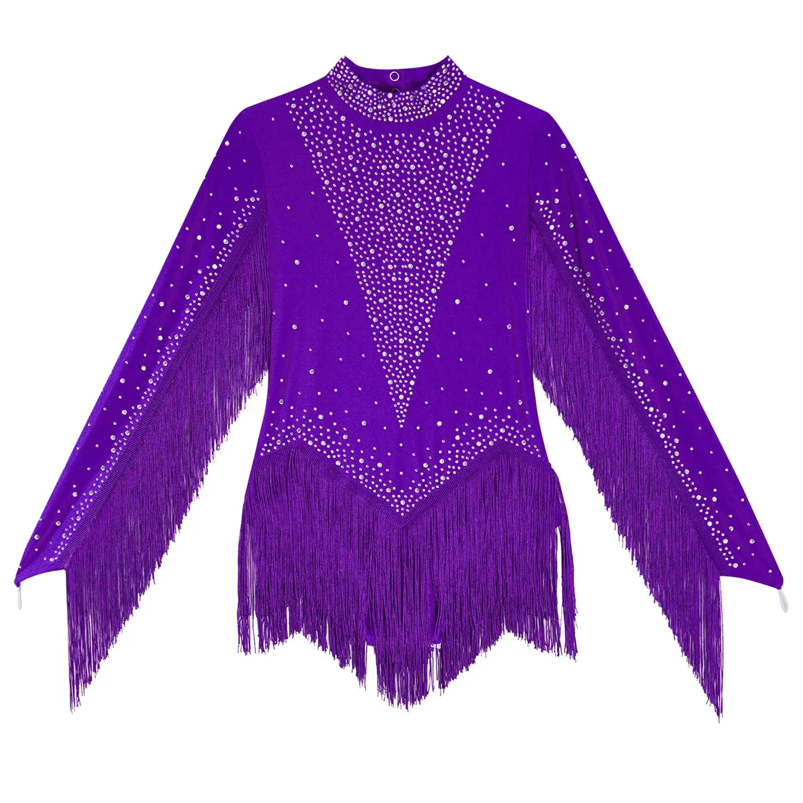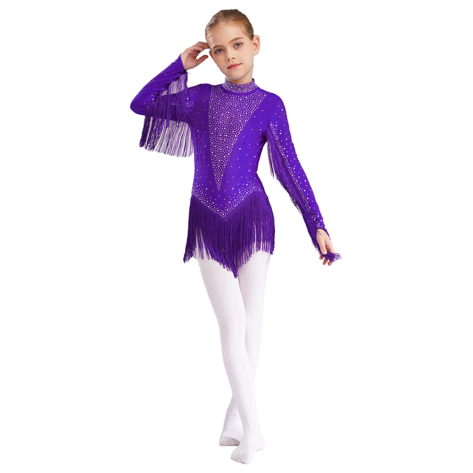 Kids Girls Tassels Gymnastics Figure Skating Latin Ballet Dance Leotard Costume Sparkling Rhinestones Fringe Bodysuit Dancewear