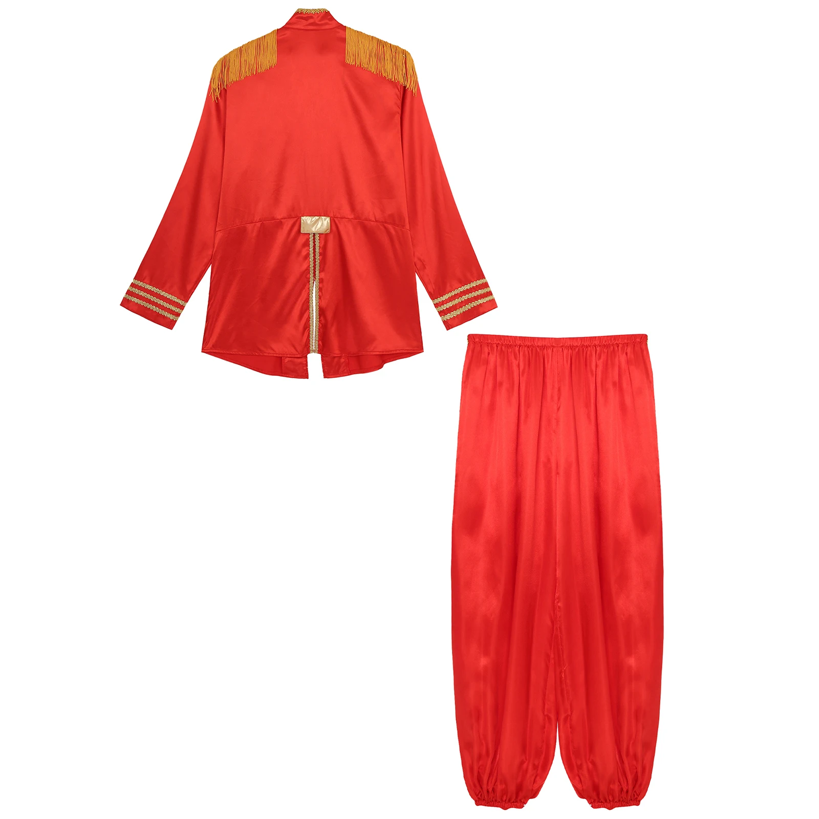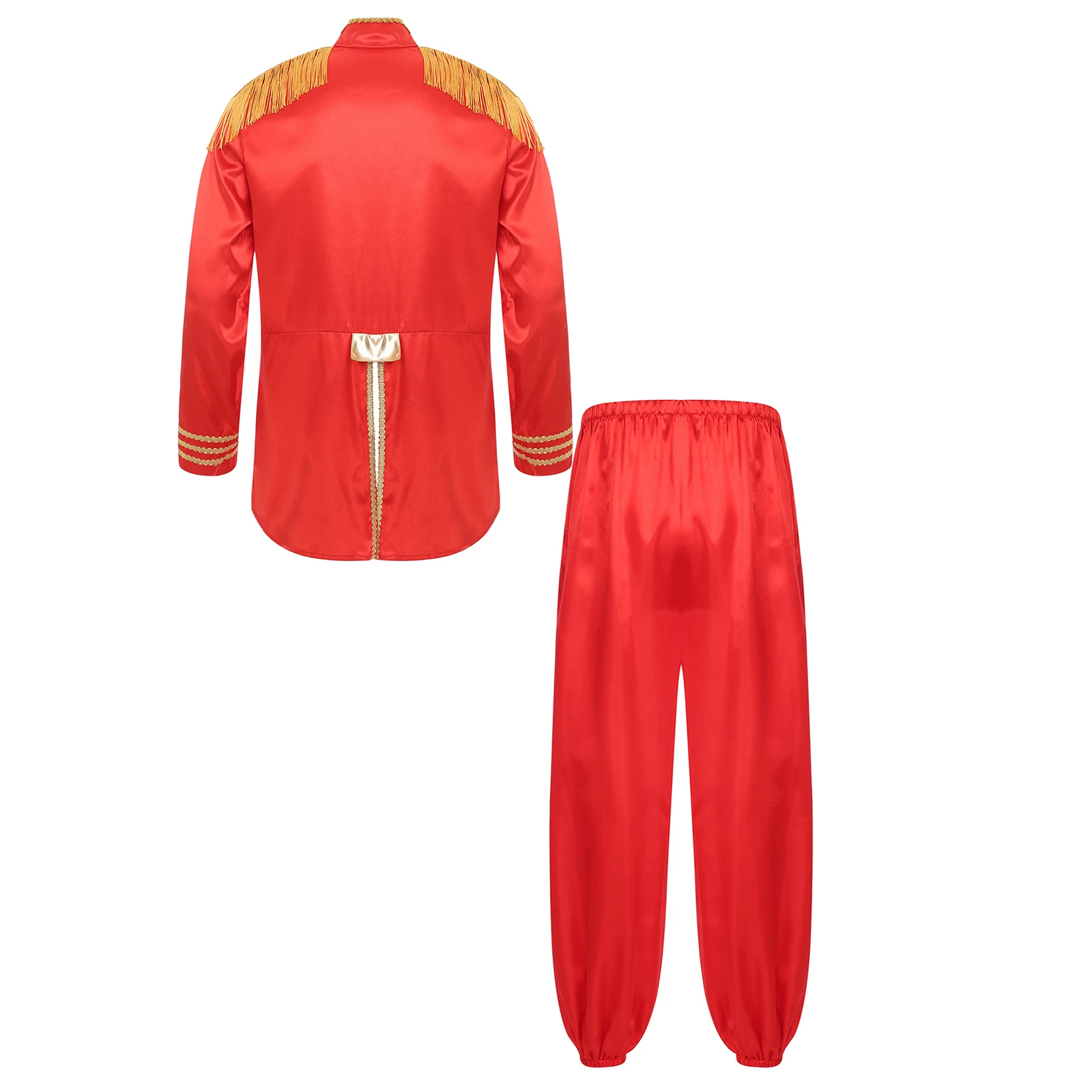Men’s medieval hidden zipper outerwear, metallic shoulder boards with gold fringe, back slit and long type. Decorated with shiny trims and vintage buttons.