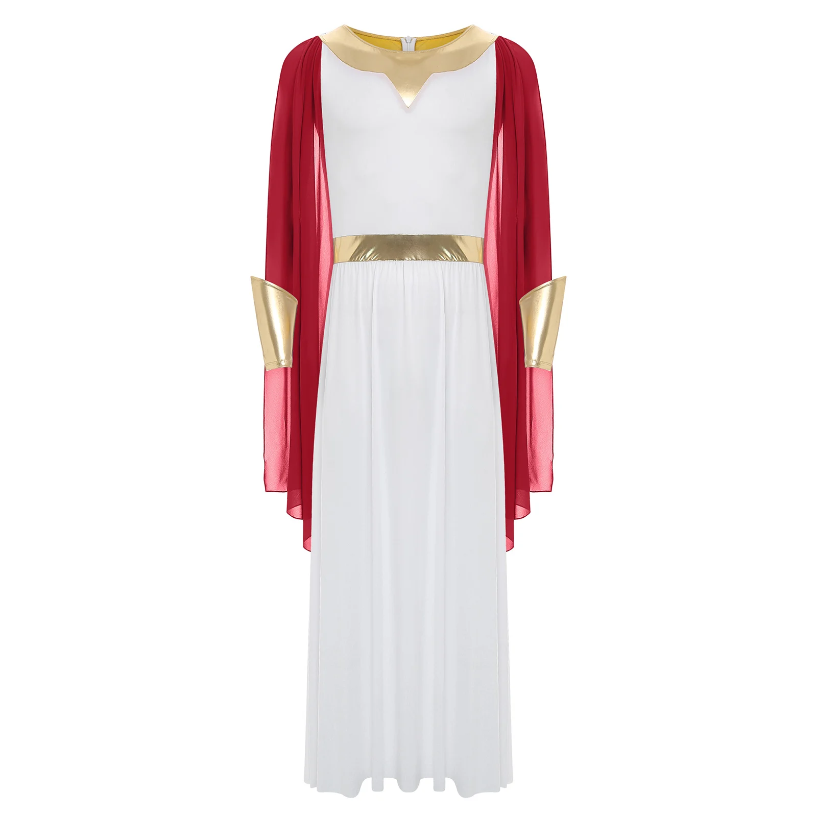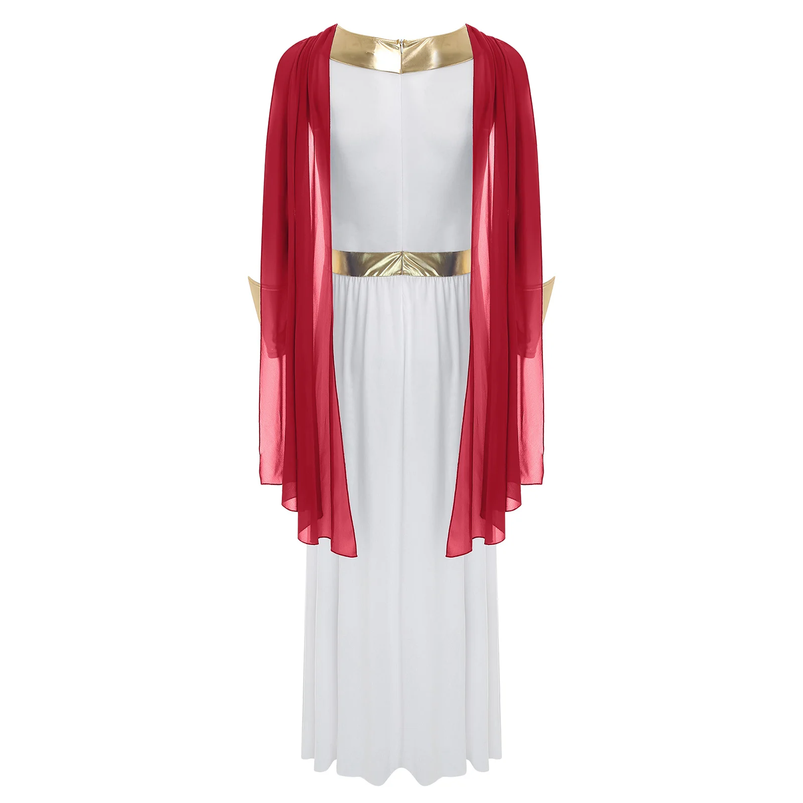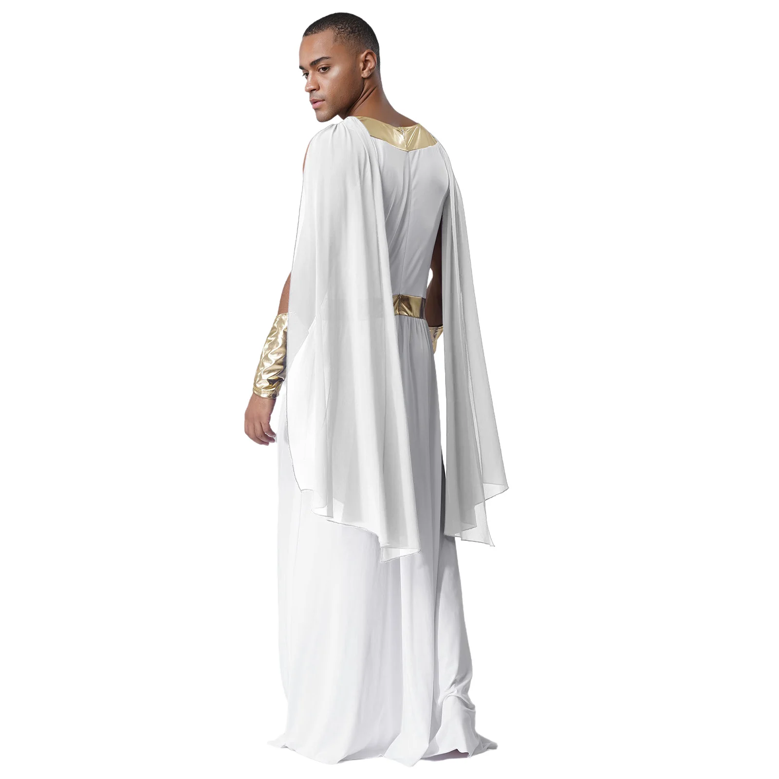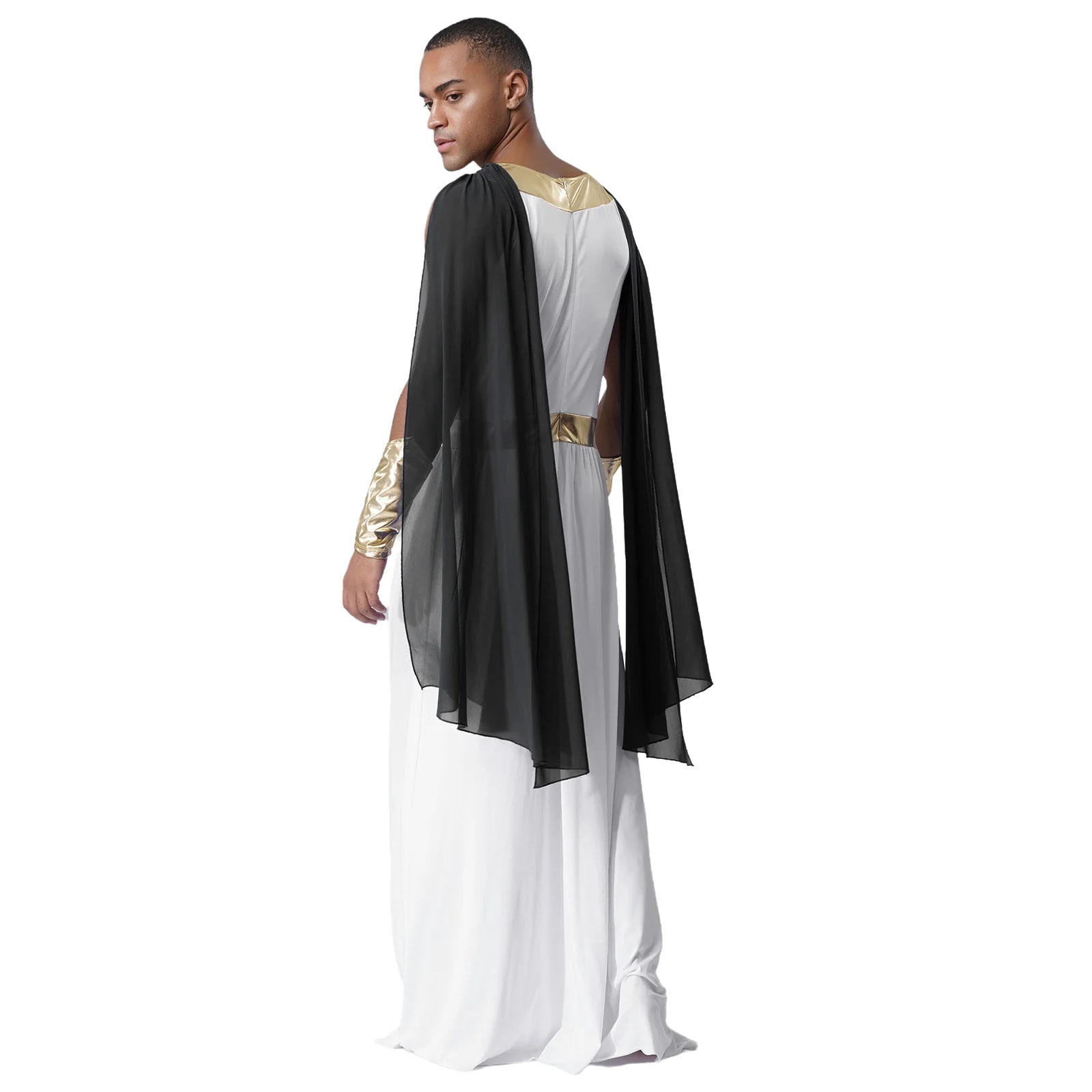 The metallic cuffs are a trendy detail that adds a touch of sparkle and glamour, making this toga outfit perfect for Halloween cosplay, fancy dress balls, or other themed events.