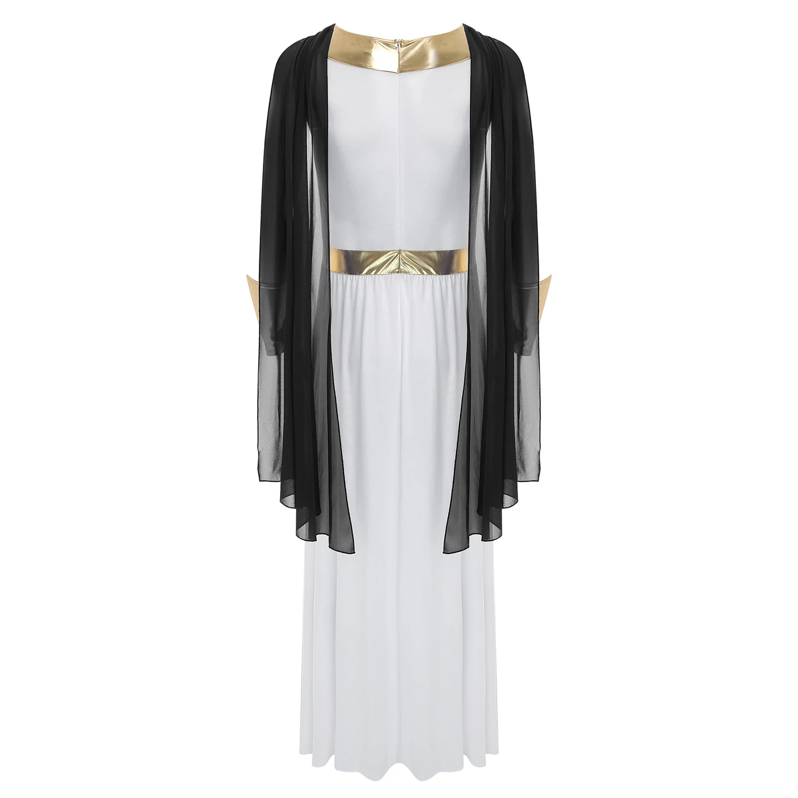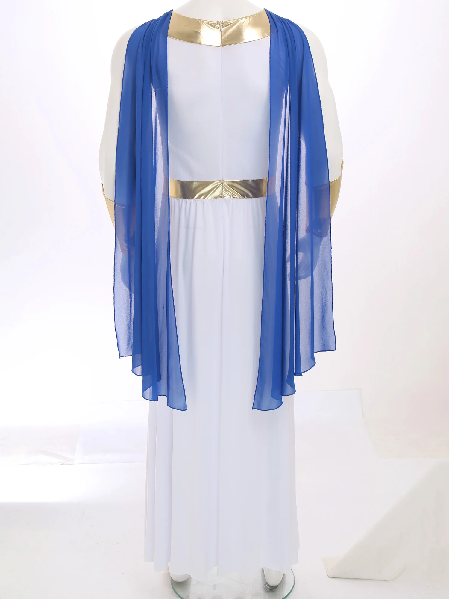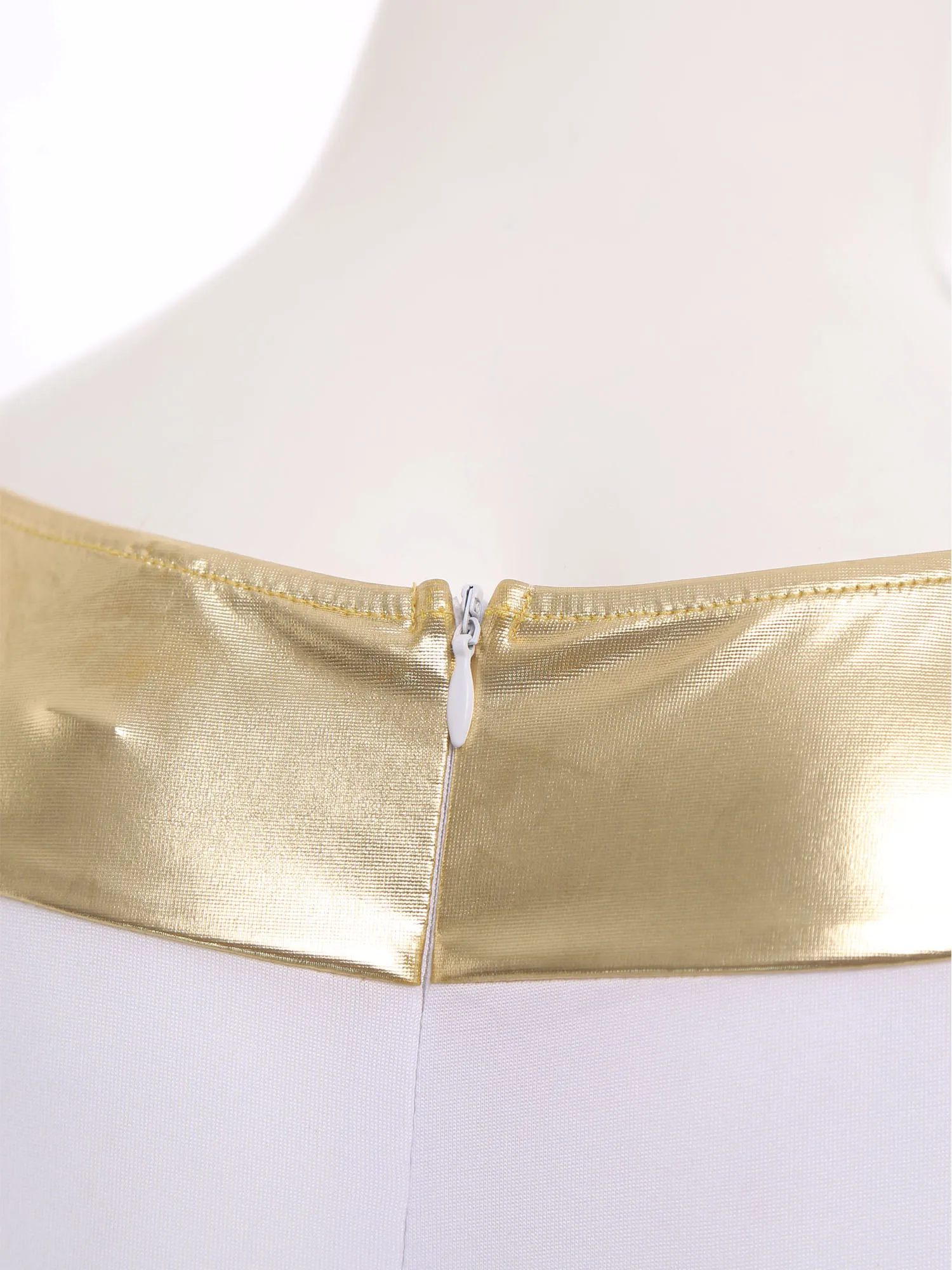 The metallic cuffs are a trendy detail that adds a touch of sparkle and glamour, making this toga outfit perfect for Halloween cosplay, fancy dress balls, or other themed events.