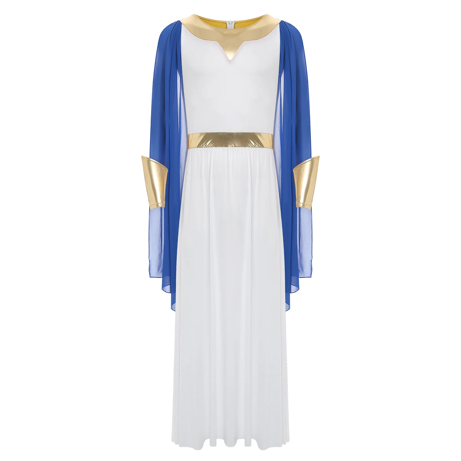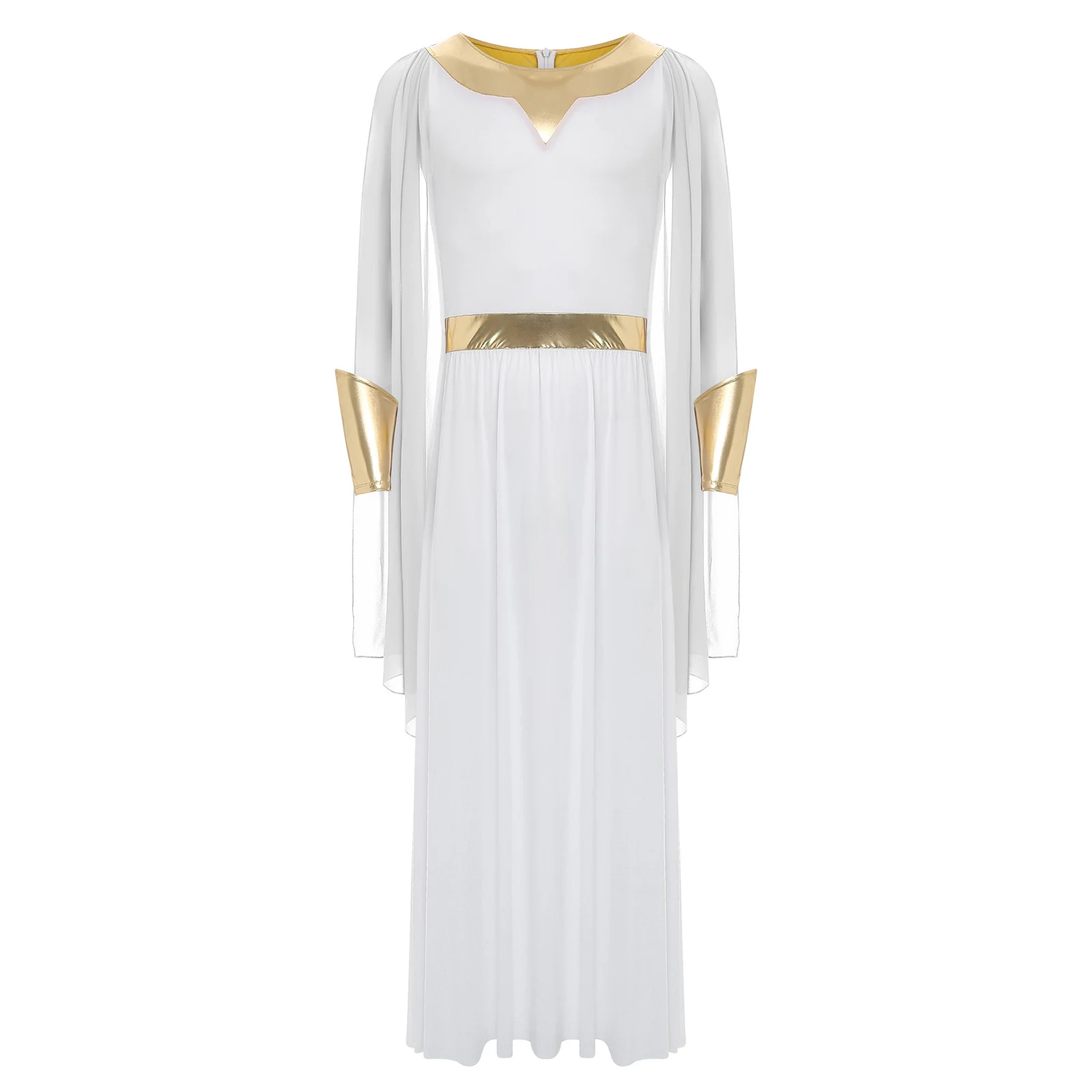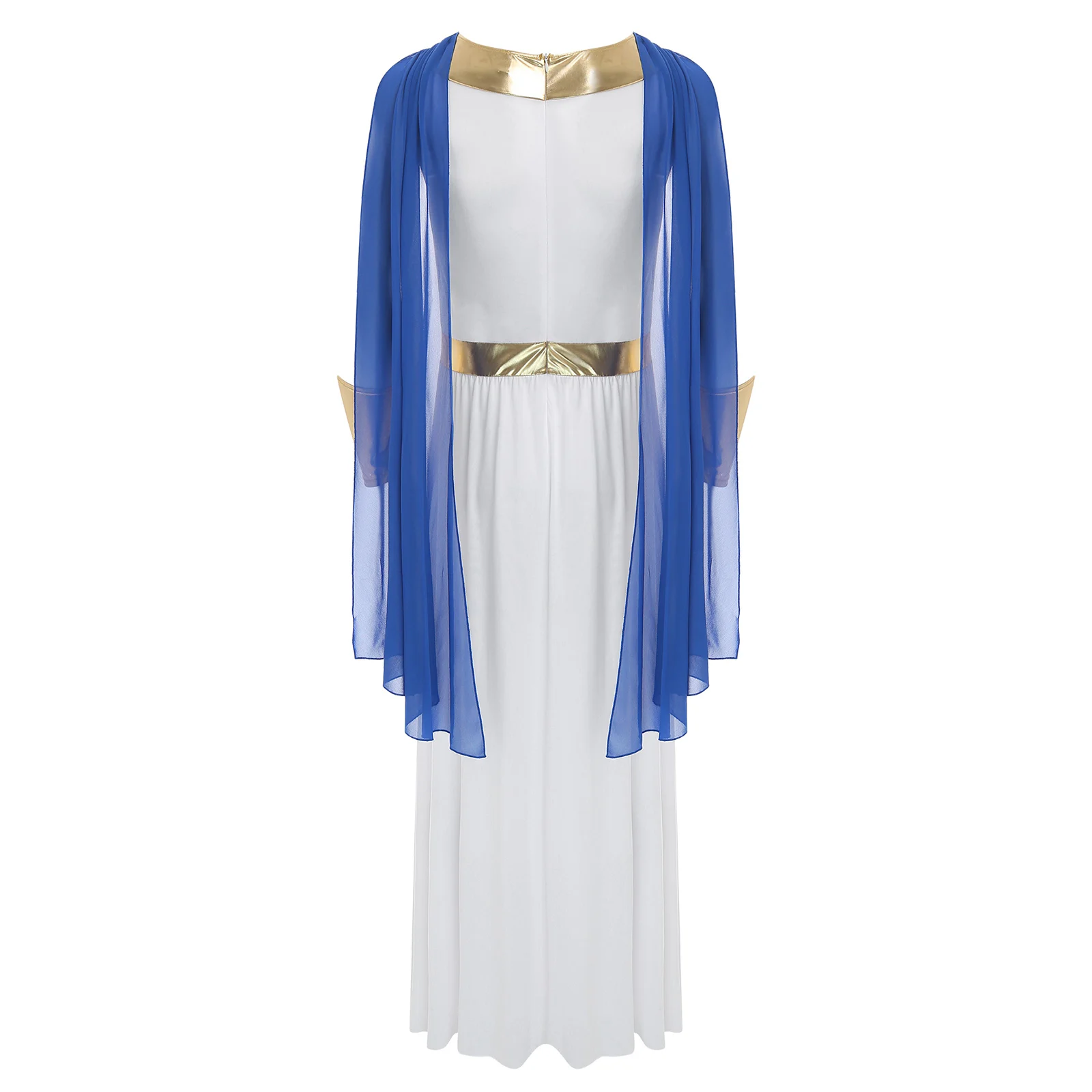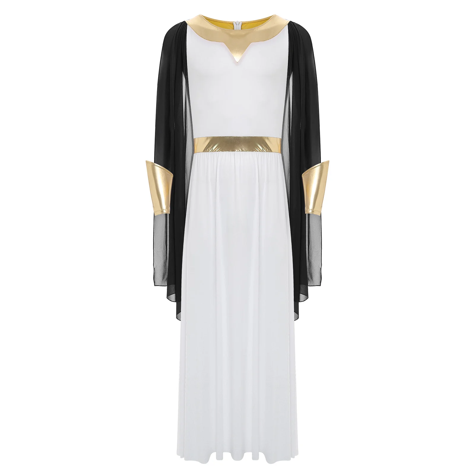 The metallic cuffs are a trendy detail that adds a touch of sparkle and glamour, making this toga outfit perfect for Halloween cosplay, fancy dress balls, or other themed events.