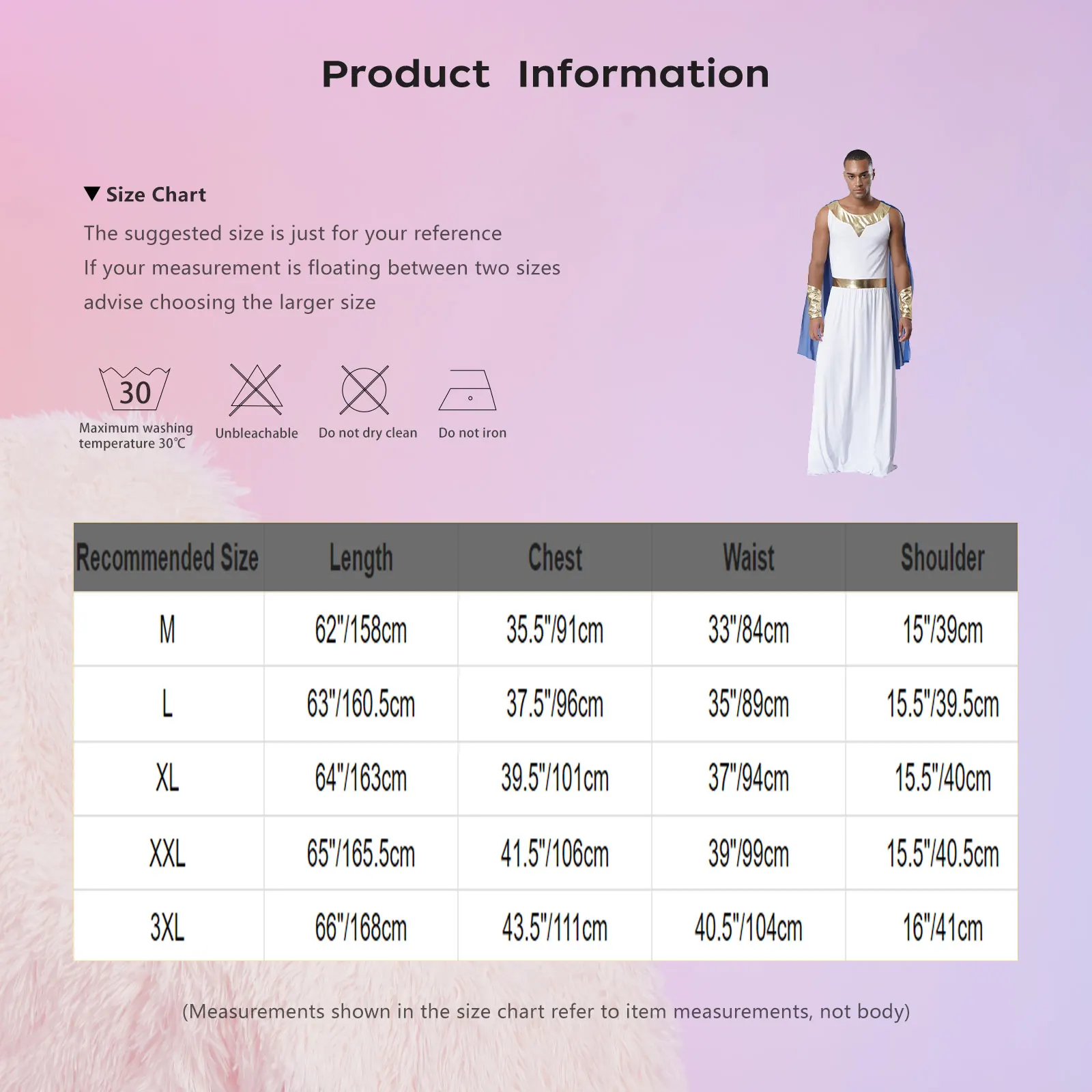 Size Chart: The suggested size is just for your reference. If your measurement is floating between two sizes, advise choosing the larger size. (Measurements shown in the size chart refer to item measurements, not body)